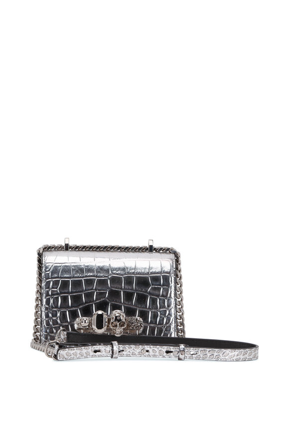 Silver Croc Embossed Leather Knuckle Shoulder Bag