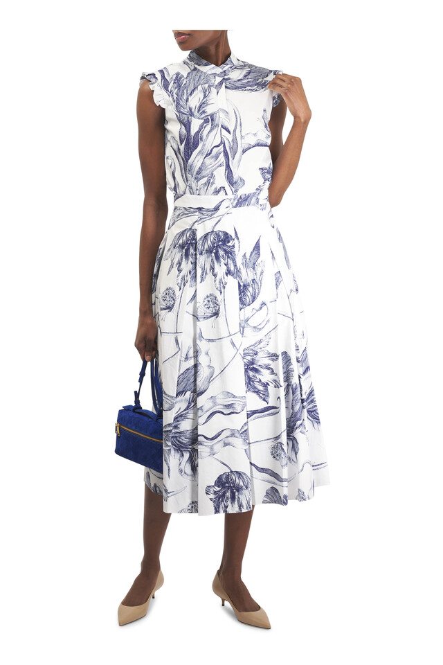 Blue Floral Print Cotton Poplin Pleated Midi Skirt