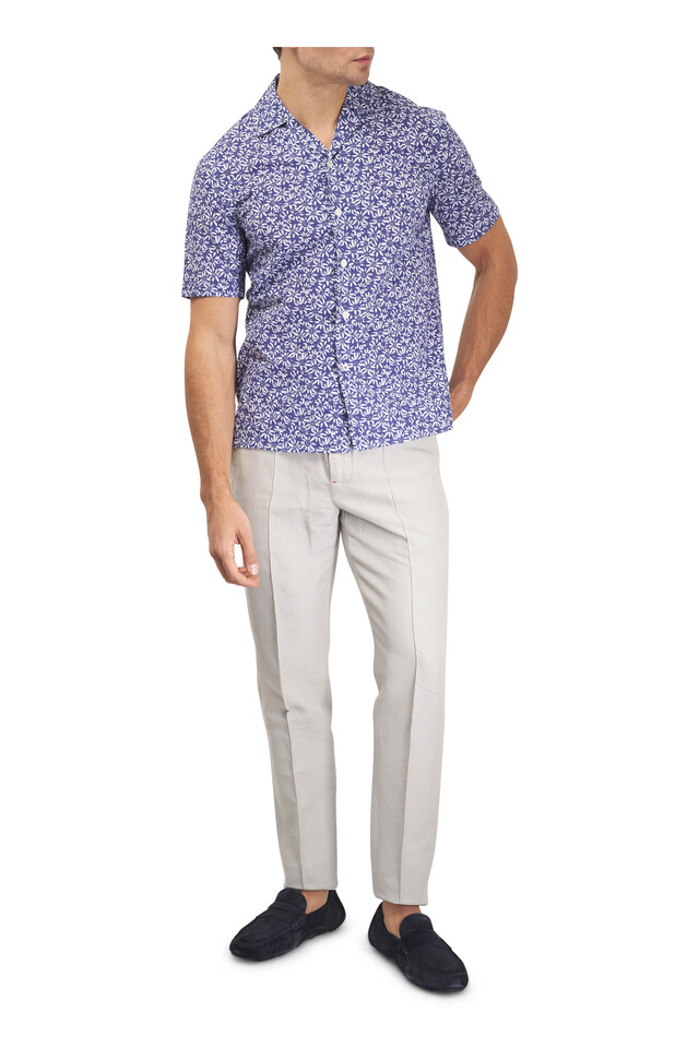 Admiral Blue Floral Print Seersucker Camp Shirt