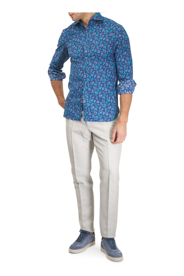 Blue Chambray Floral Print Cotton Sport Shirt