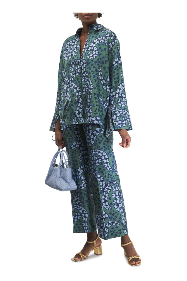 Blue & Green Rateau Print Wide Leg Silk Pant