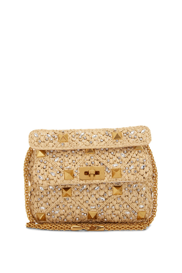 Medium Raffia, Rhinestone & Stud Shoulder Bag