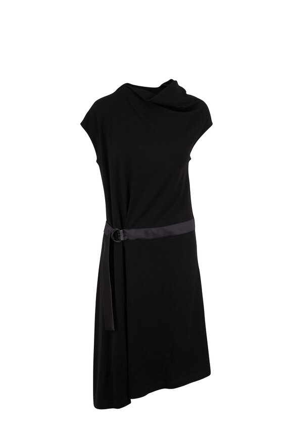 Black Wool Jersey D-Ring Belt Cap Sleeve Dress