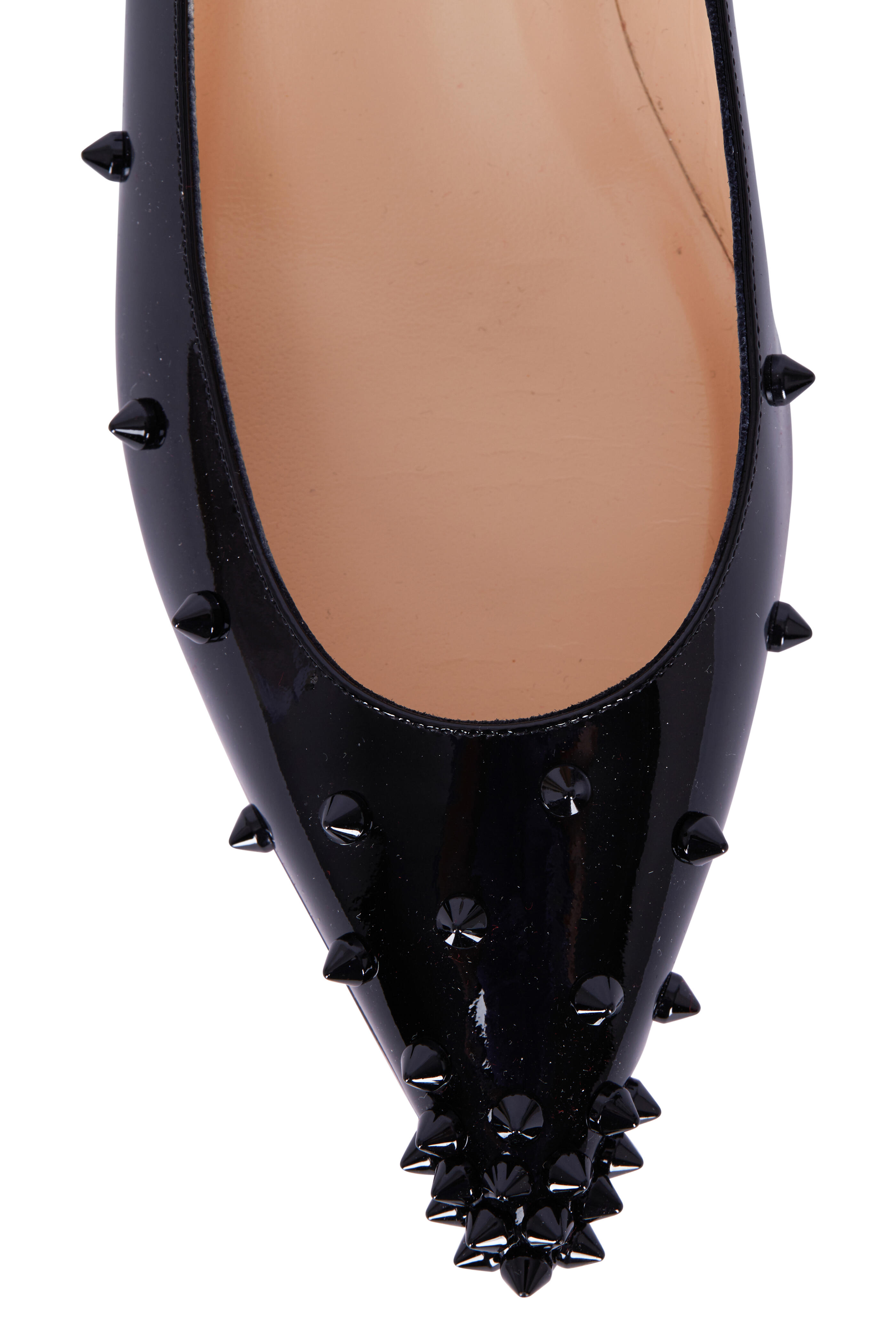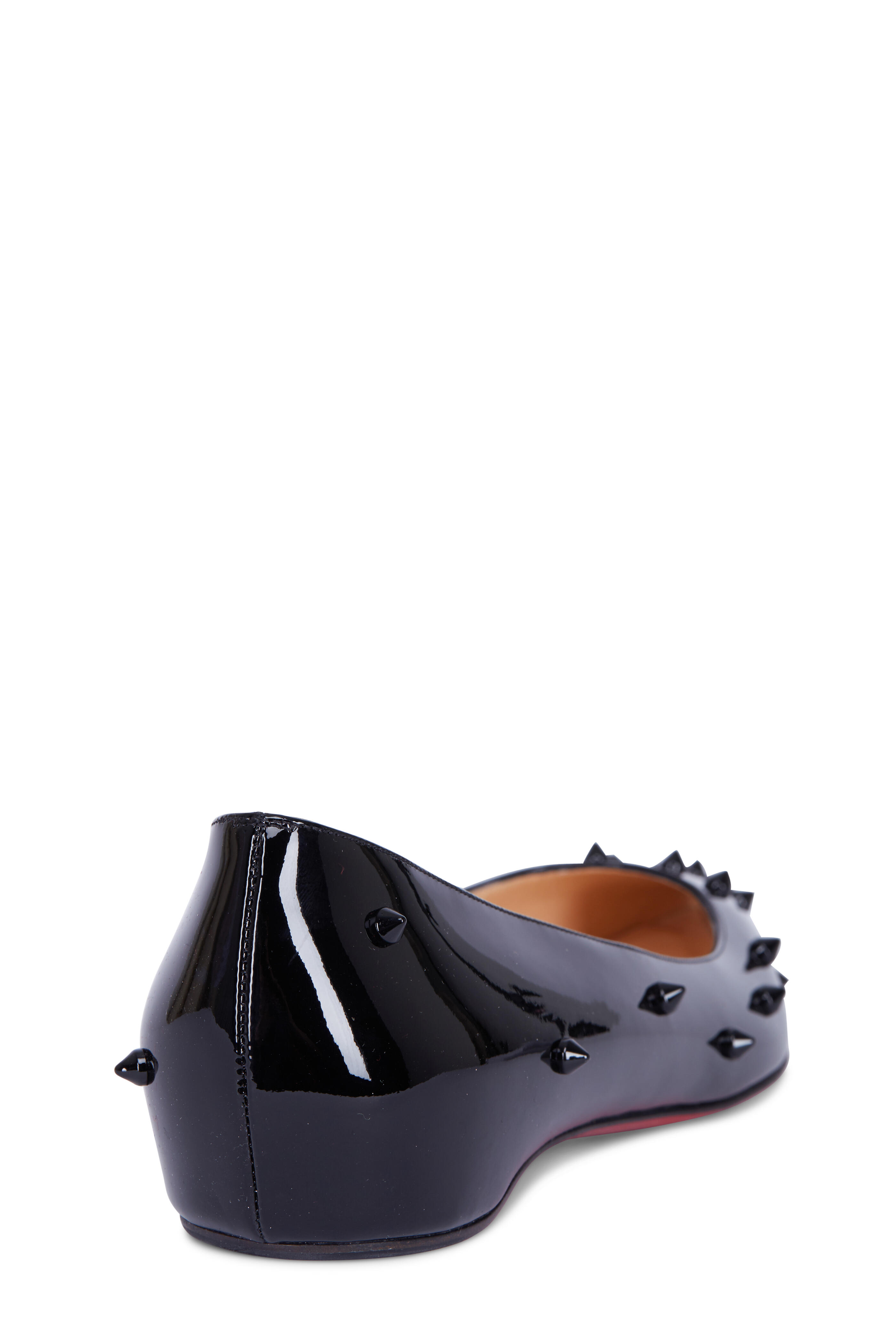 Patent leather upper. Pointed toe. Polished tonal spikes. Leather lining; cushioned insole. Signature red leather sole. Made in Italy.