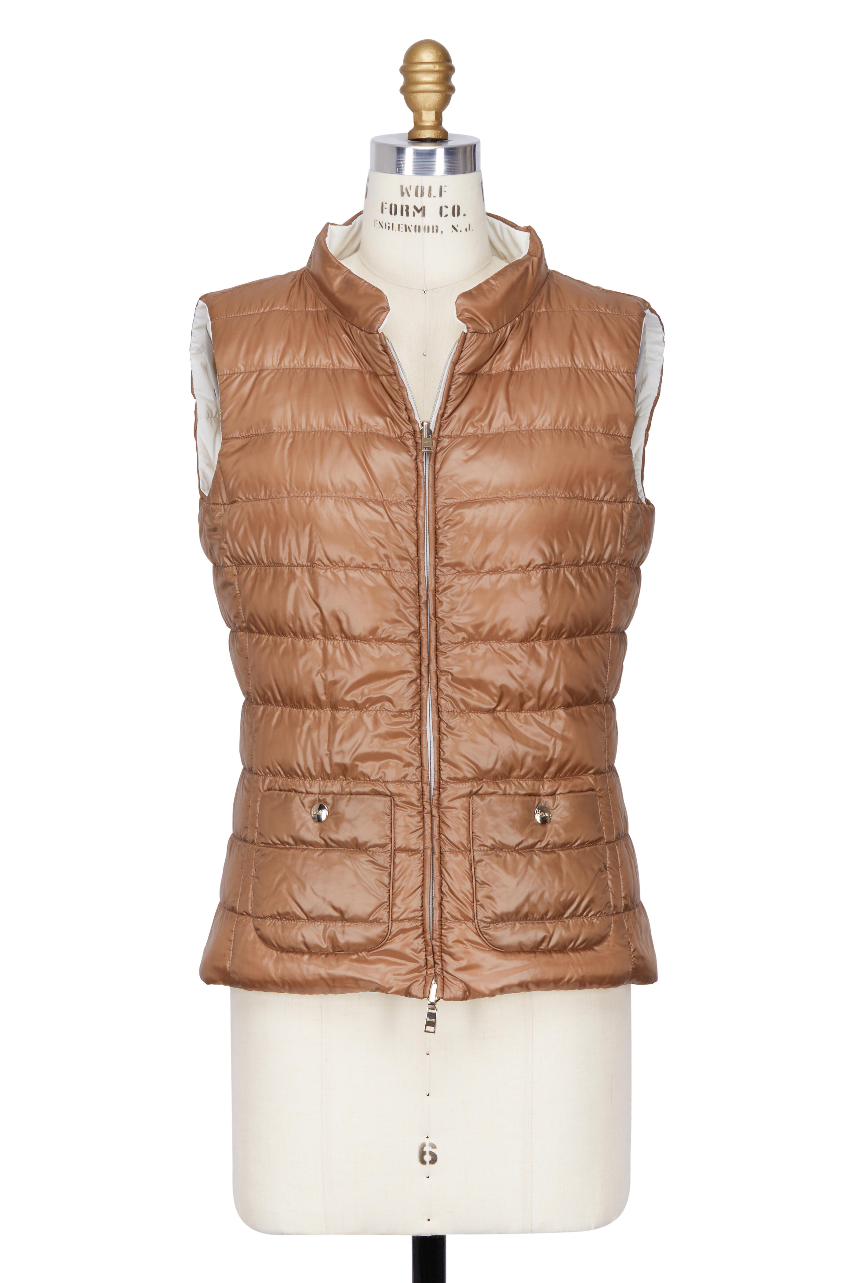 Mock neckline. Zip front closure. Front seam zip pockets, button patch pockets on copper side. Belt at waist. Imported. 22" from shoulder to hem. 95% polyamide, 5% polyurethane; inside: 100% polyamide; padding: 100% goose down. Dry clean.