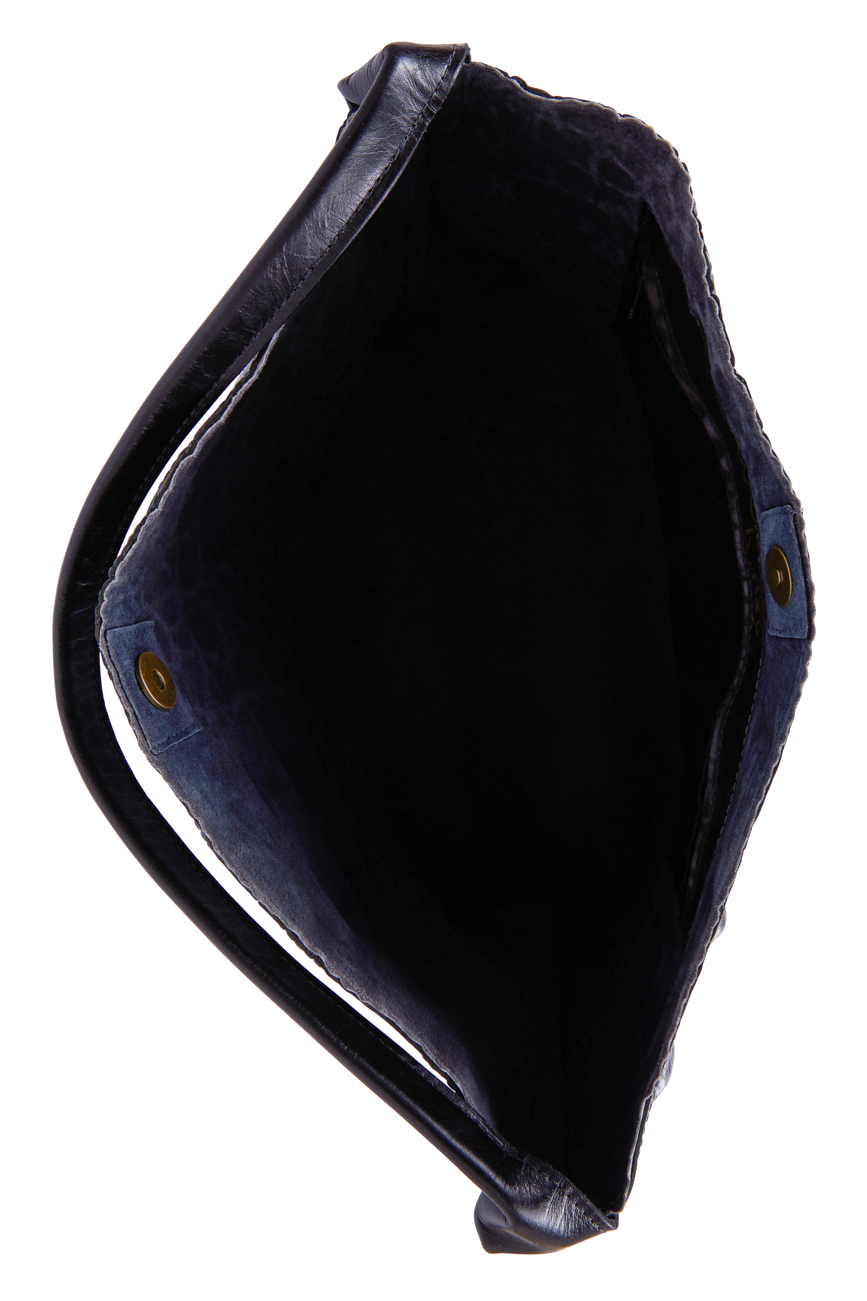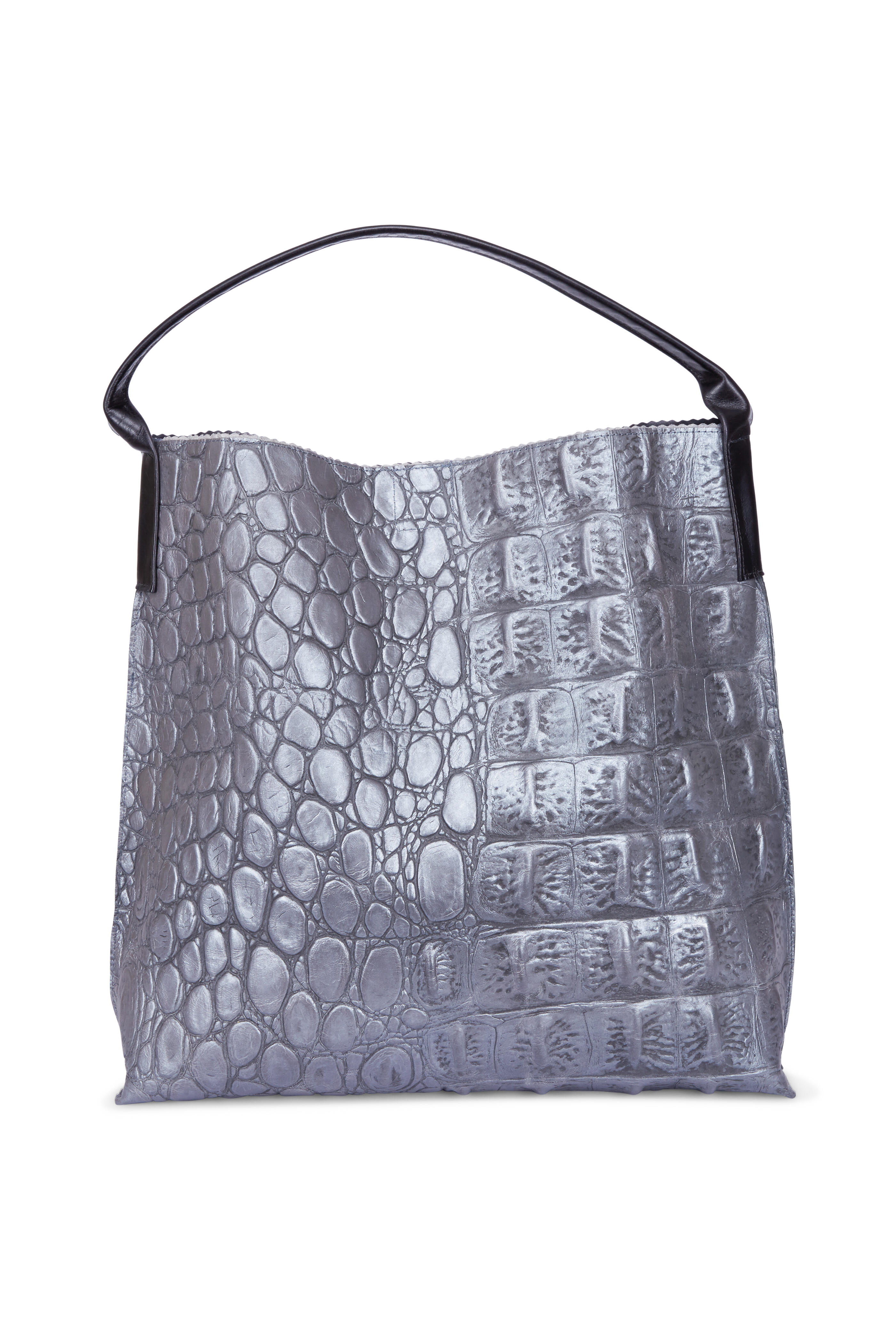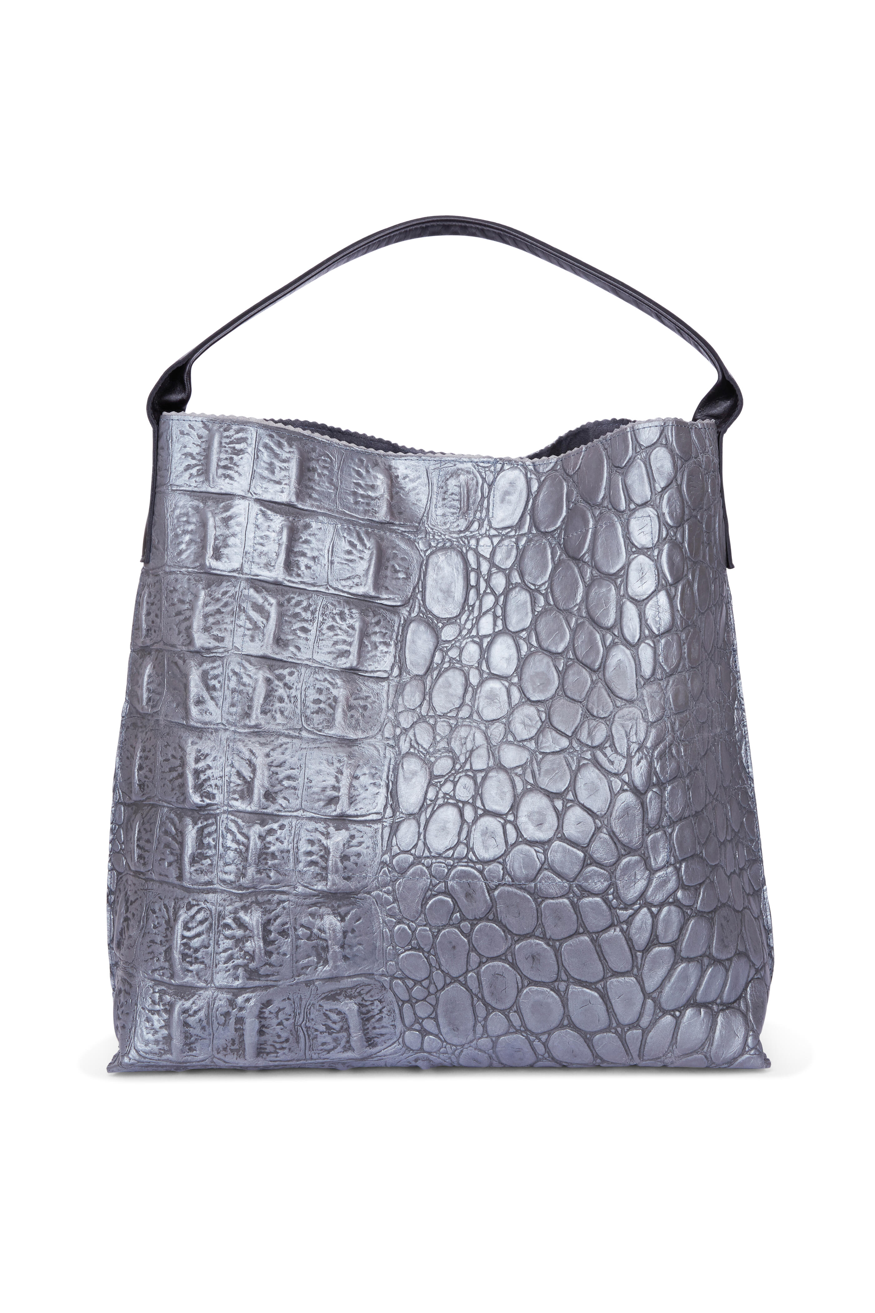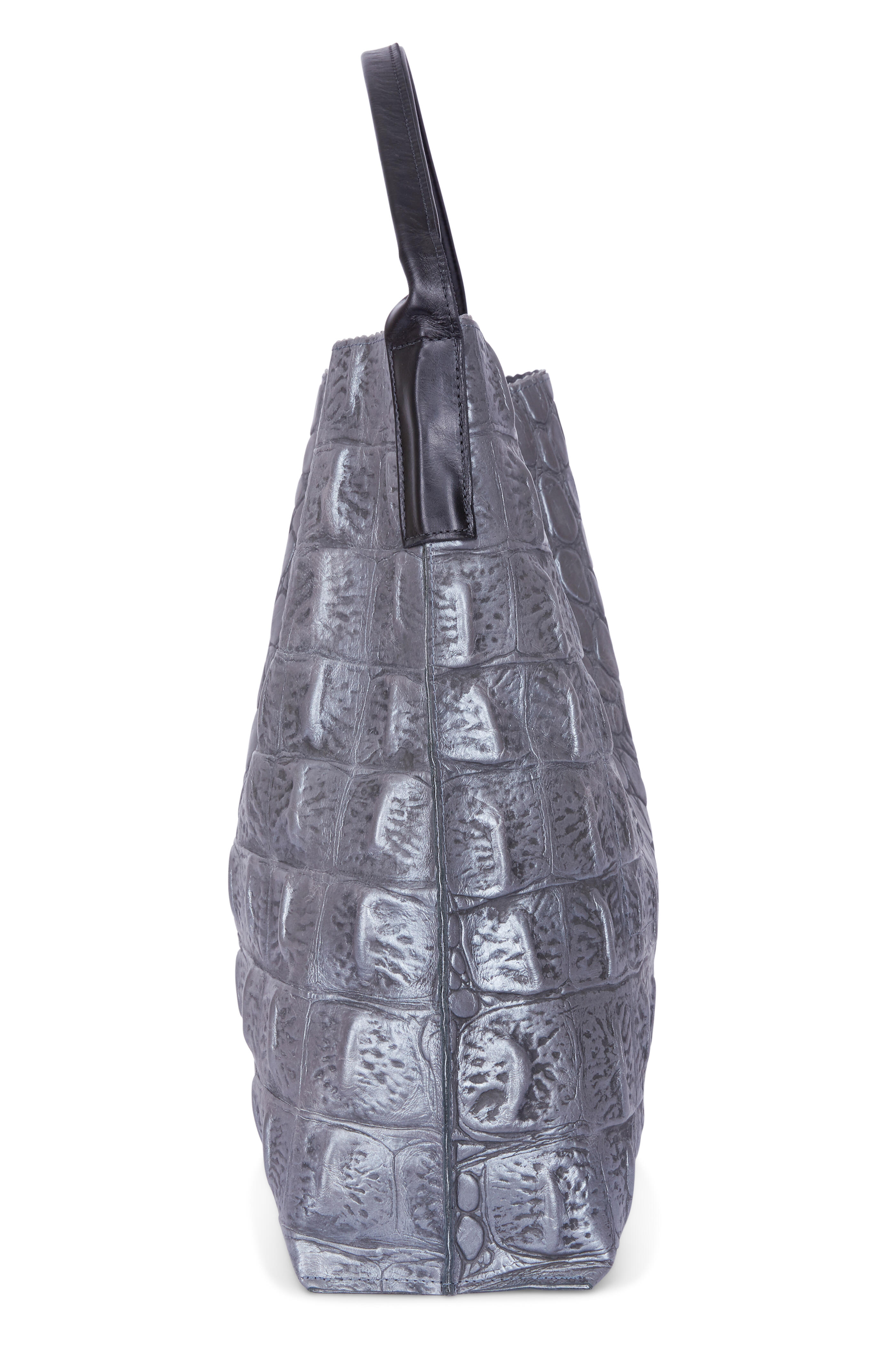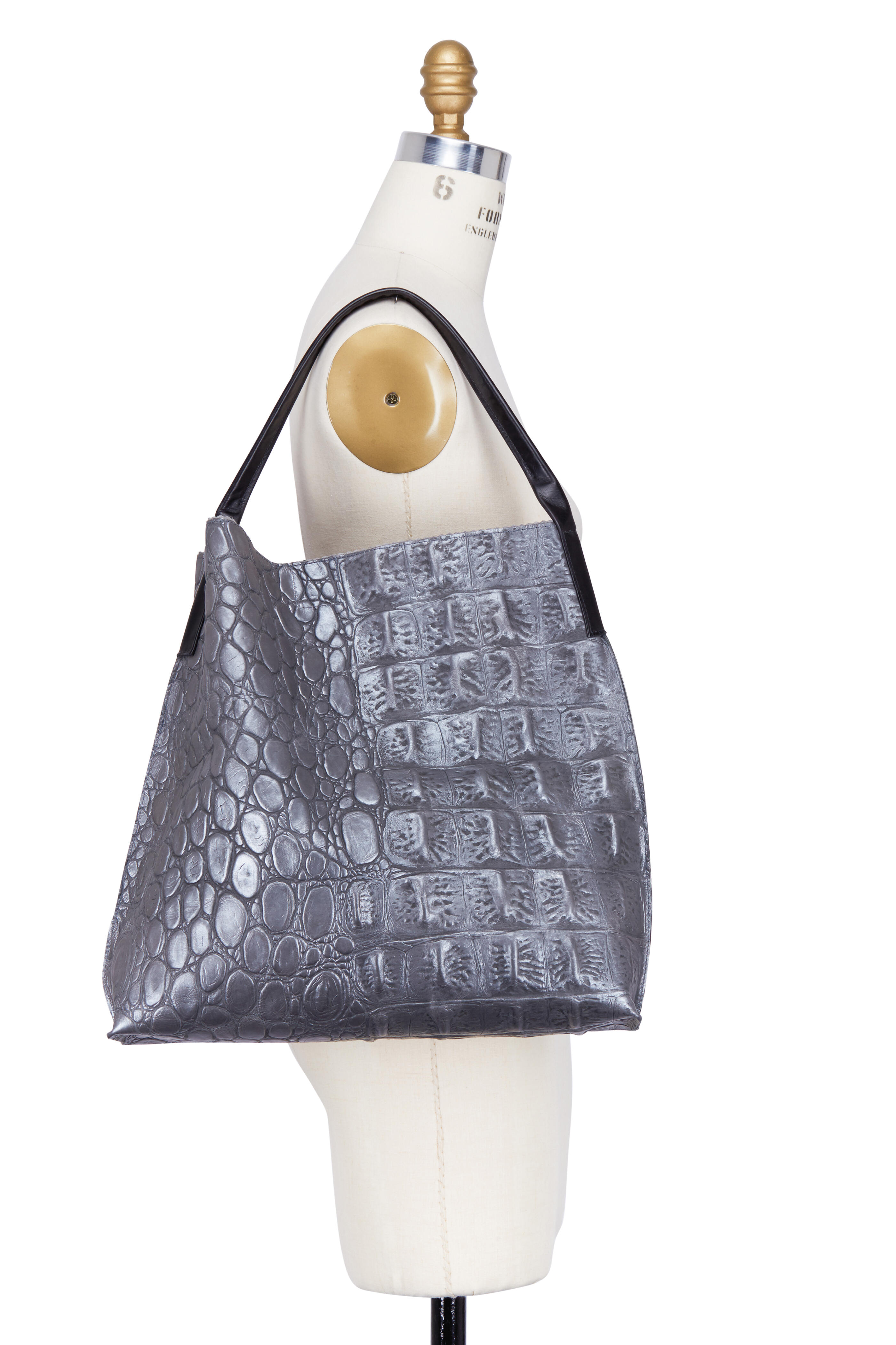 Embossed crocodile. Flat top handle. Center concealed magnetic snap closure. One interior zip pocket. Lined in suede. Made in the USA. Width: 15". Height: 15". Depth: 4 1/2". Handle drop: 6".