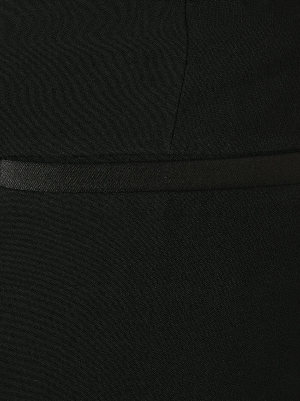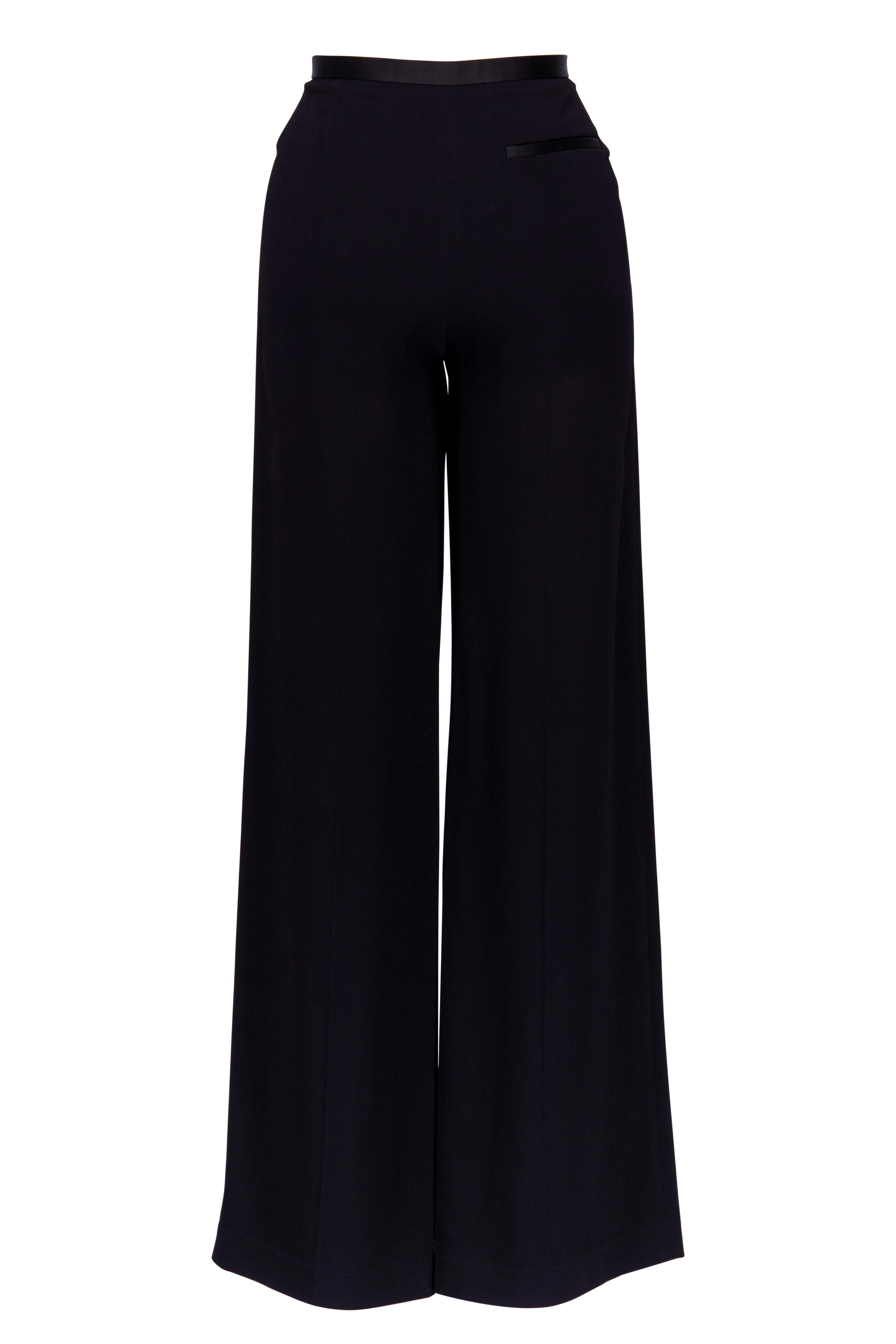 Silk band detail at waist. Front zip with hook and eye closure. Side seam pockets, single back welt pocket. Made in the USA. Rise: 10". Inseam: 33". 95% viscose, 5% elastane. Dry clean.