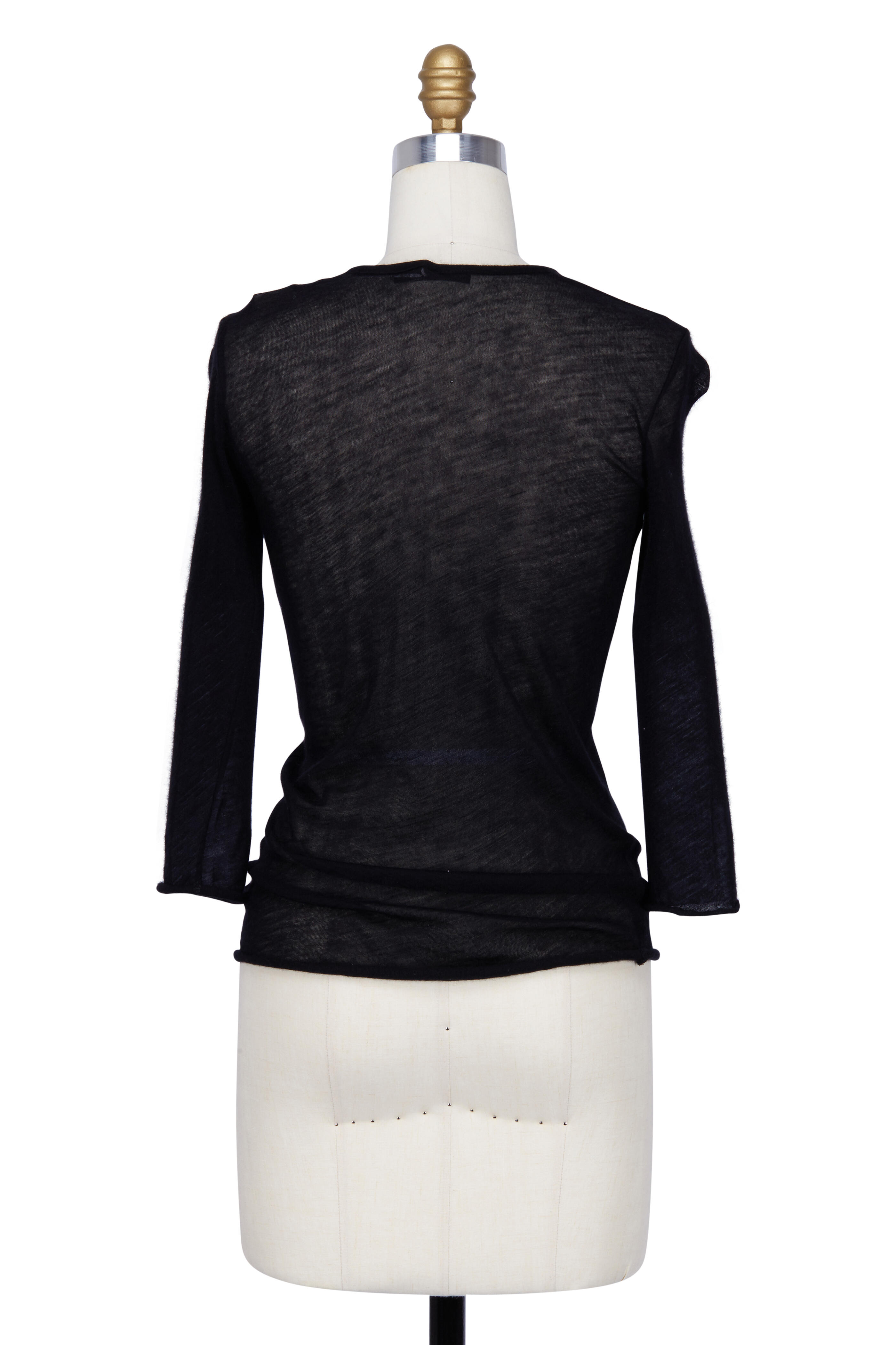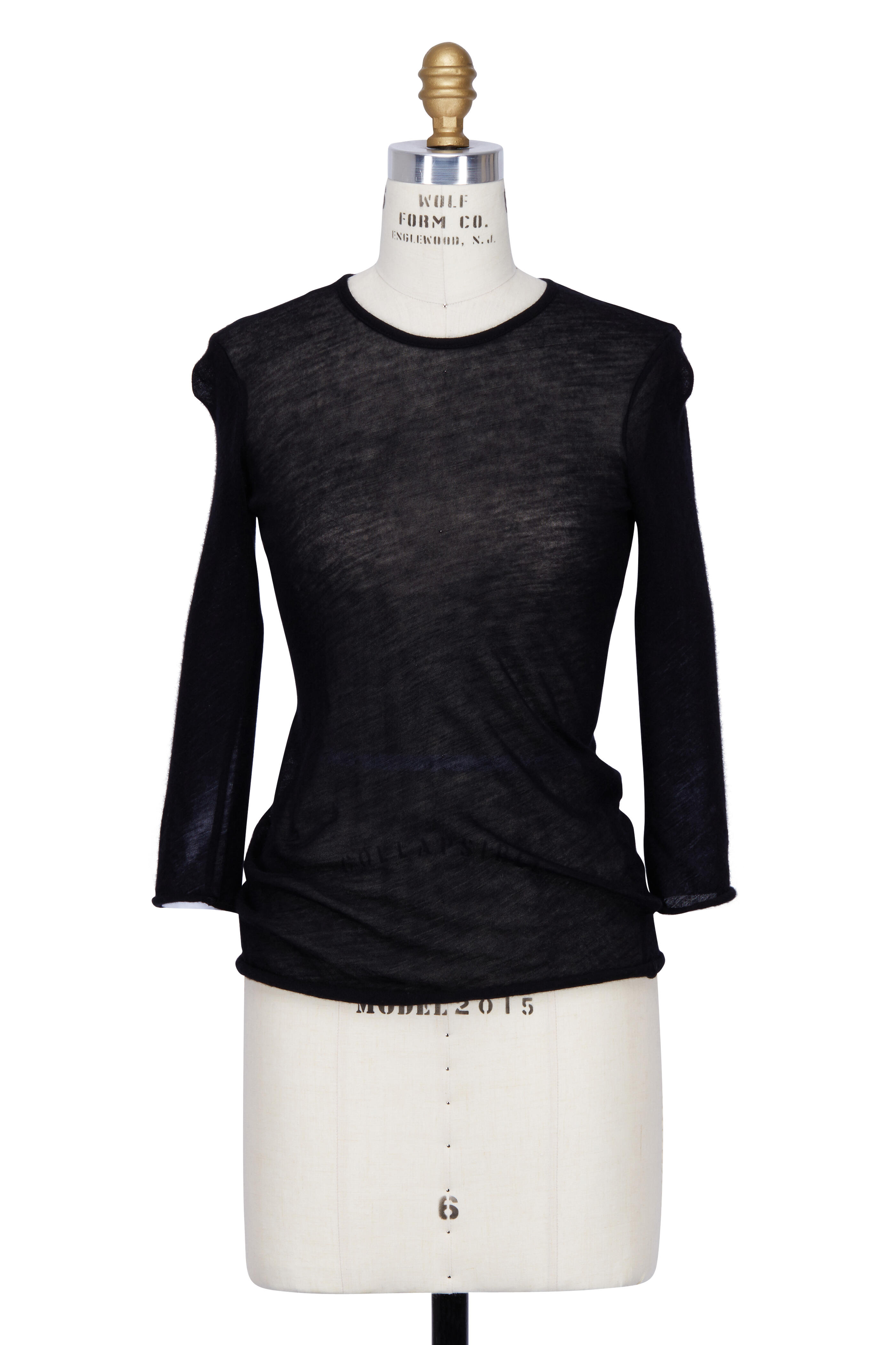 Crewneck. Three-quarter sleeves. Rolled cuffs and hem. Made in the USA. 100% cashmere. Dry clean.