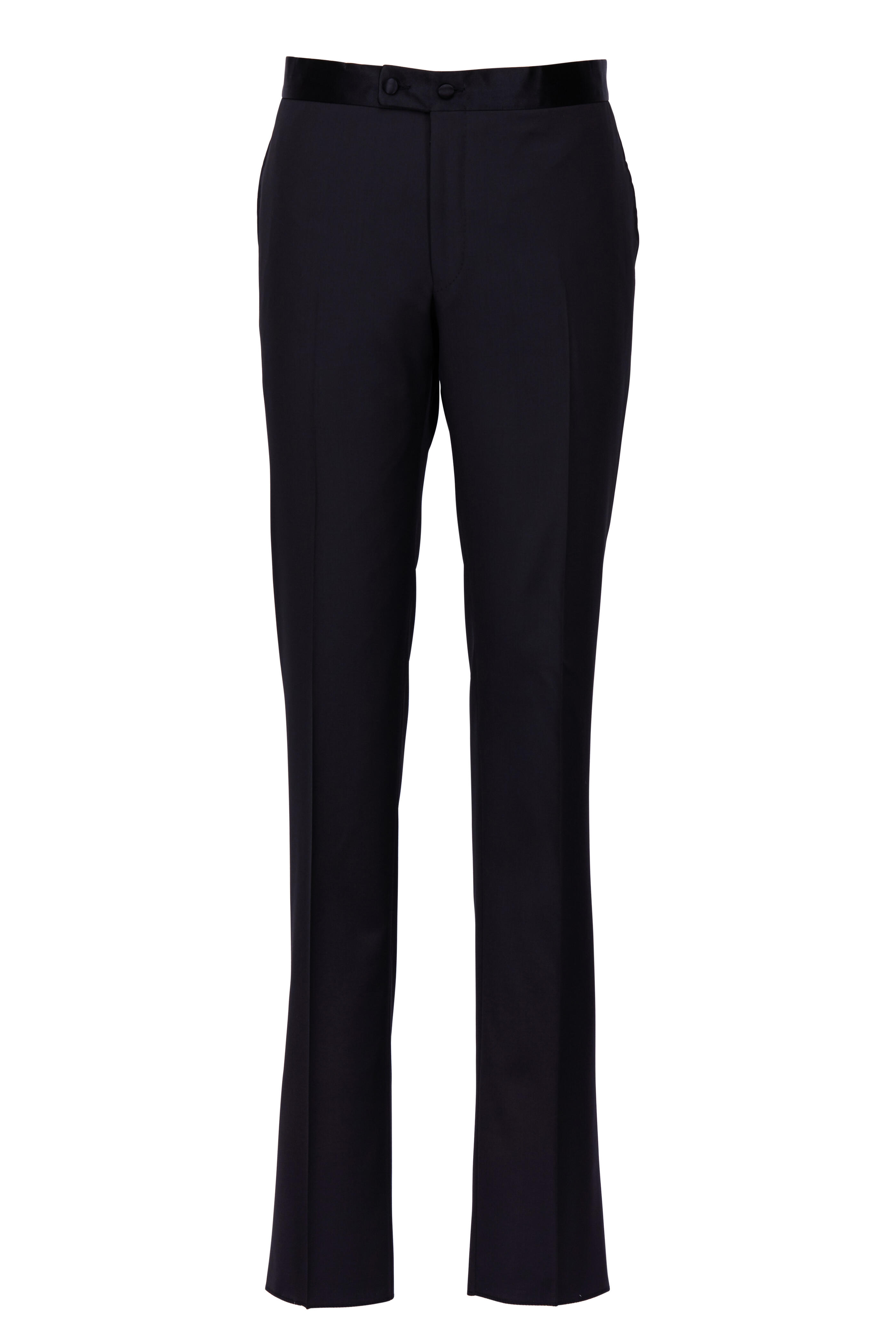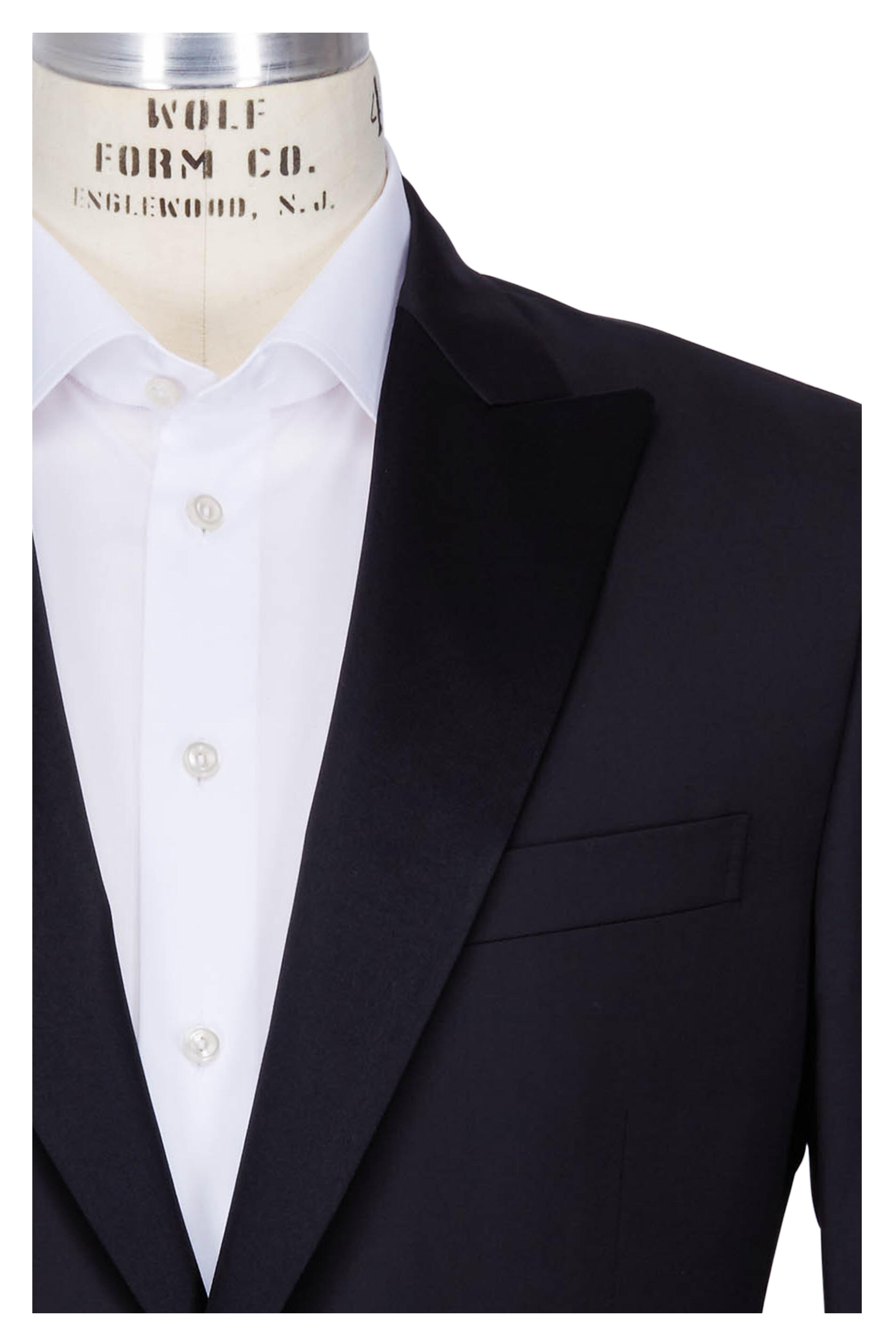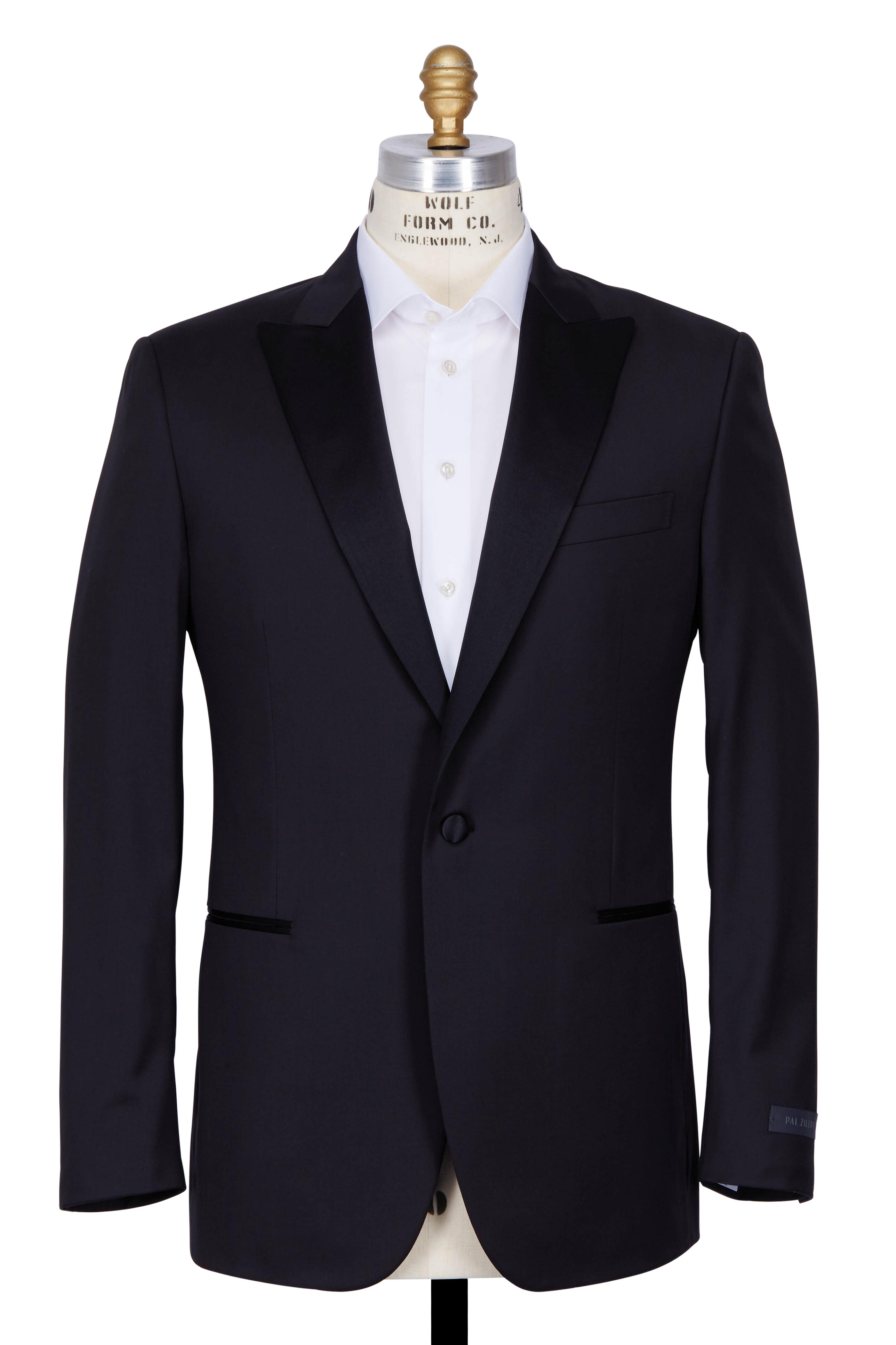 Made in Italy. Jacket: Fully lined. Peak lapels. One button front closure. Chest welt pocket, lower besom pockets. Double vent. Pant: Two side slash pockets, back button-besom pockets. Unfinished hem. 100% wool. Dry clean.