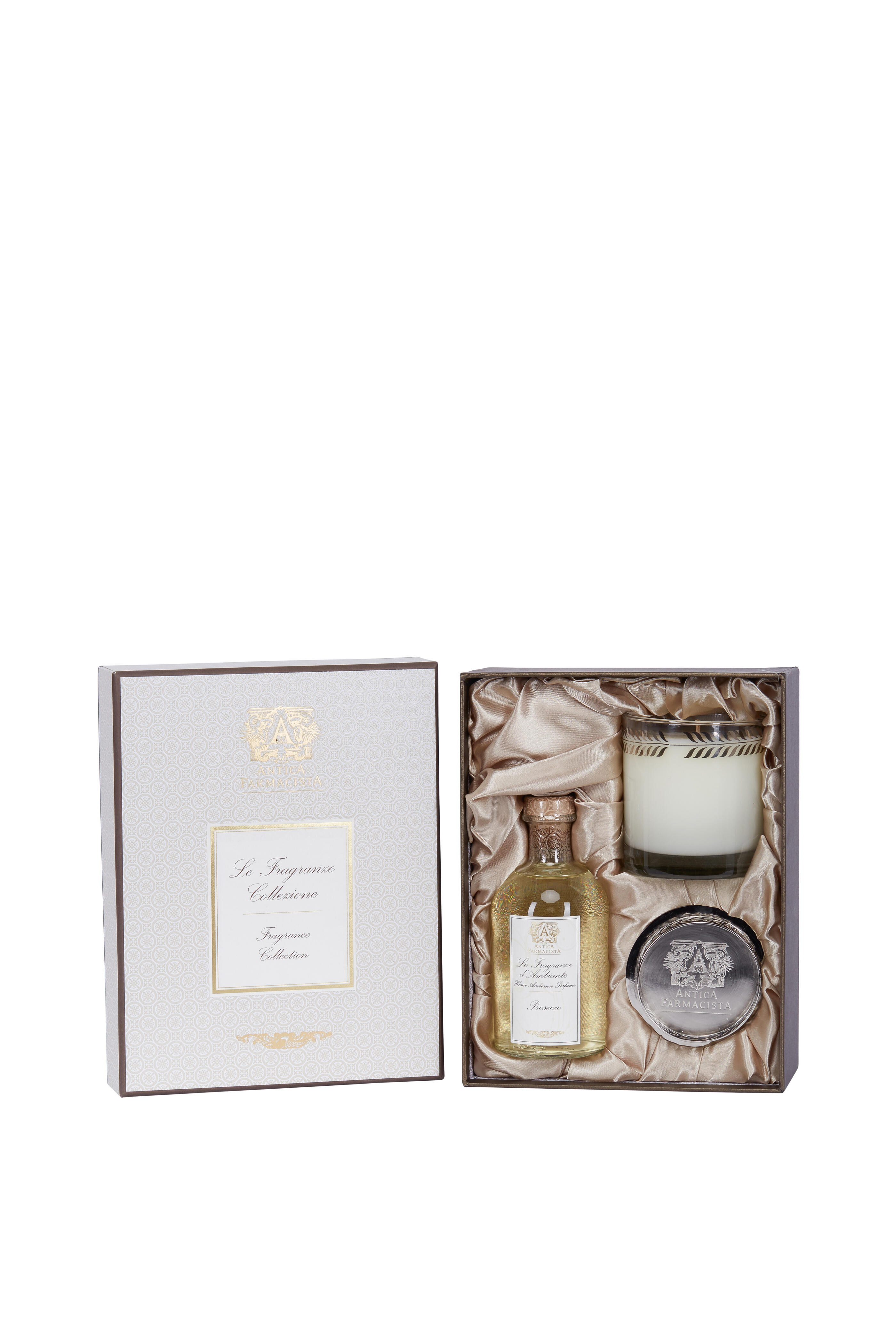 Antica Farmacista Diffuser Fragrance, the signature product in the collection, is a unique and beautiful way to fragrance and decorate the home. The Home Ambiance Fragrances utilize antique inspired apothecary bottles, filled with fragrance, to permeate the air through the bottles' open neck and white birch reeds that are inserted to further diffuse the scent. Simply position the fragrance bottle in the room of your choice and uncork. Place the reed bundle into the neck and reverse the reeds every few days or as desired to enhance the scent. The Antica Farmacista fragrance will infuse the air and provide a lasting, constant and beautiful scent.. Fragrance: Top notes of Satsuma citrus balance with subtle floral notes of muguet. Apricot and passionfruit complement the sweetness of sugared black currant. A crisp scent celebrating the sparkling effervescence of Prosecco and Champagne.. Candle: 9 oz.. Diffuser: 250 mL.