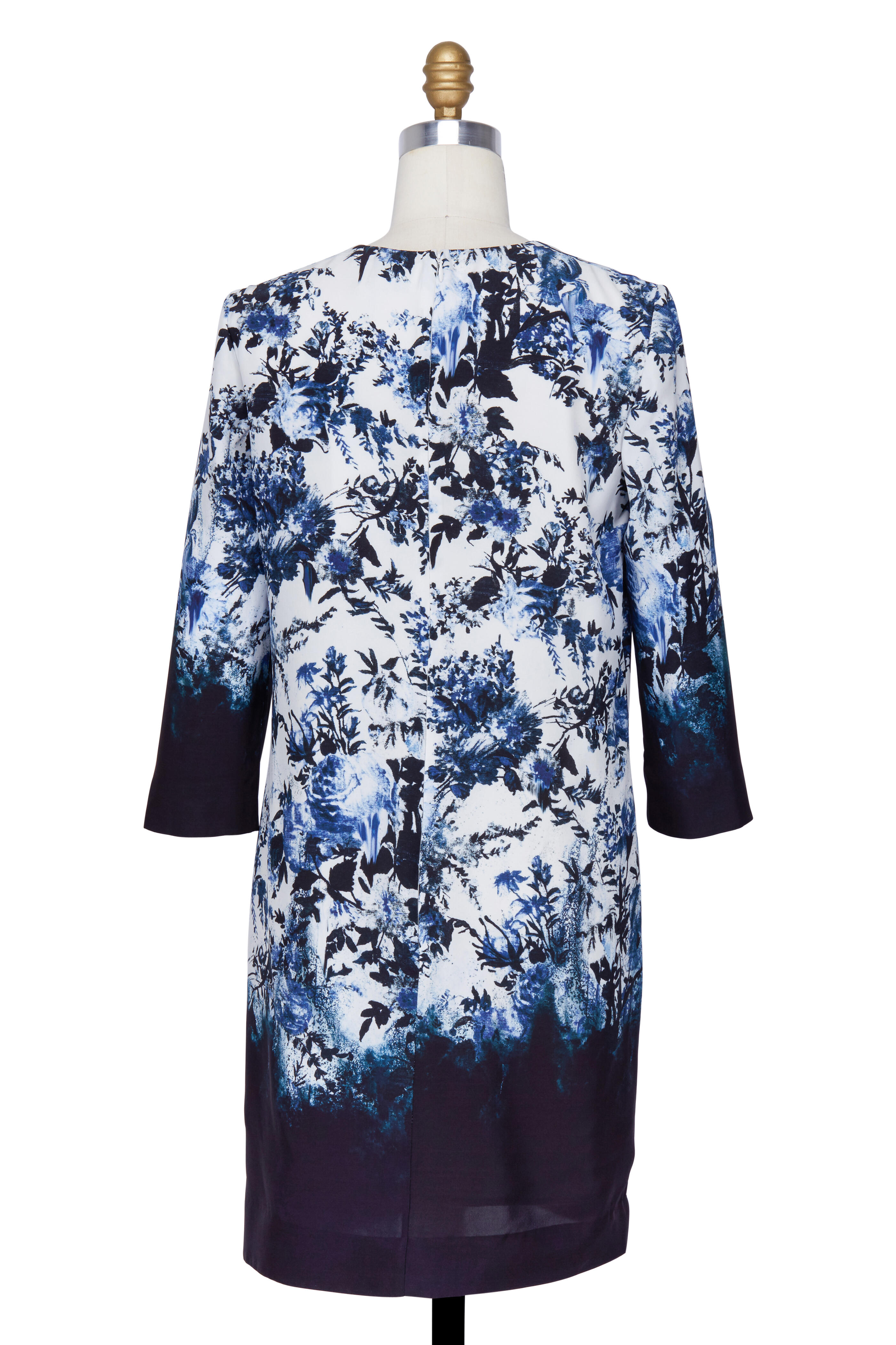 Crewneck. Concealed back hook and zip closure. Three quarter sleeves. Imported. 35" from shoulder to hem. 100% silk. Dry clean.