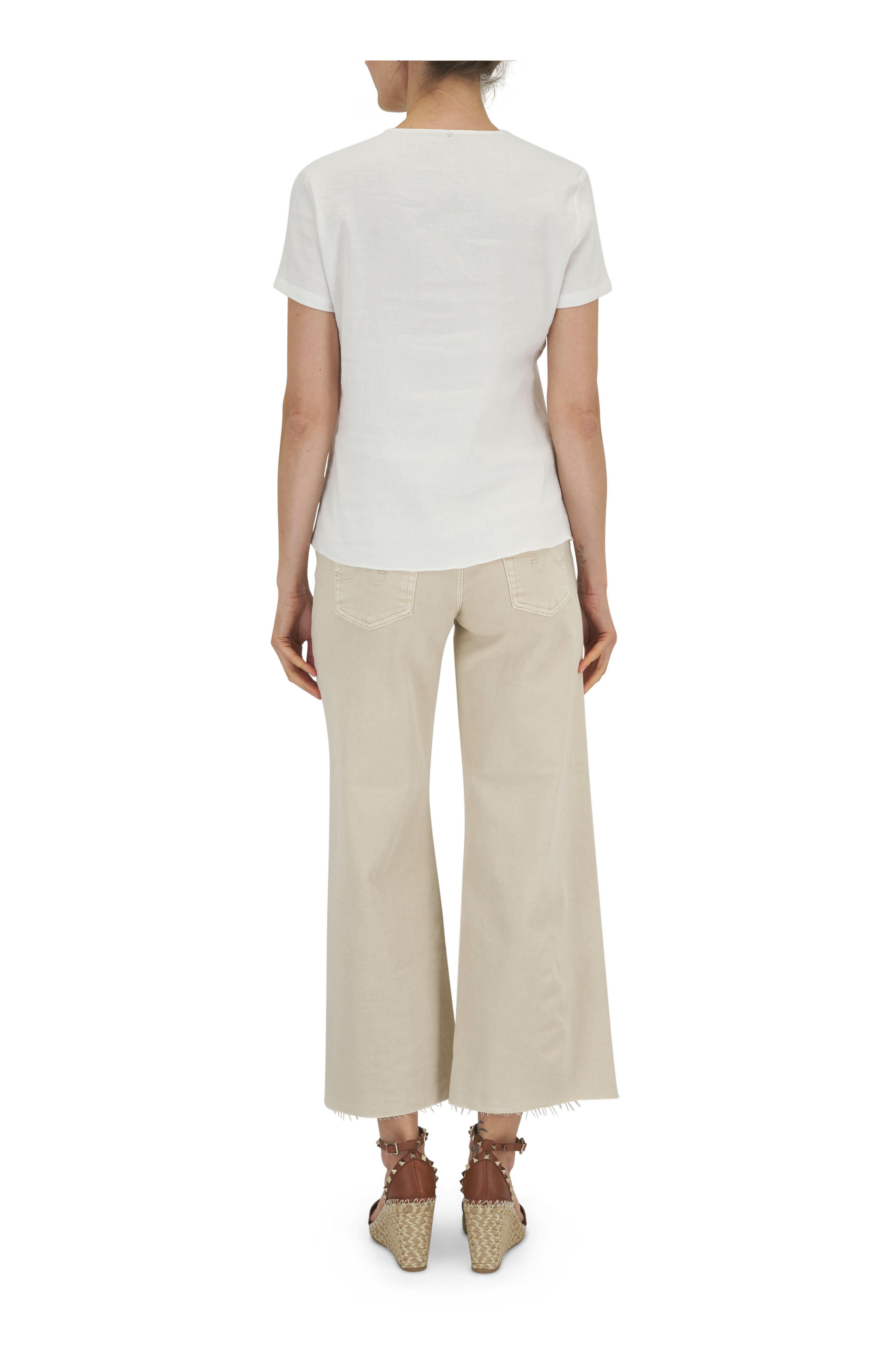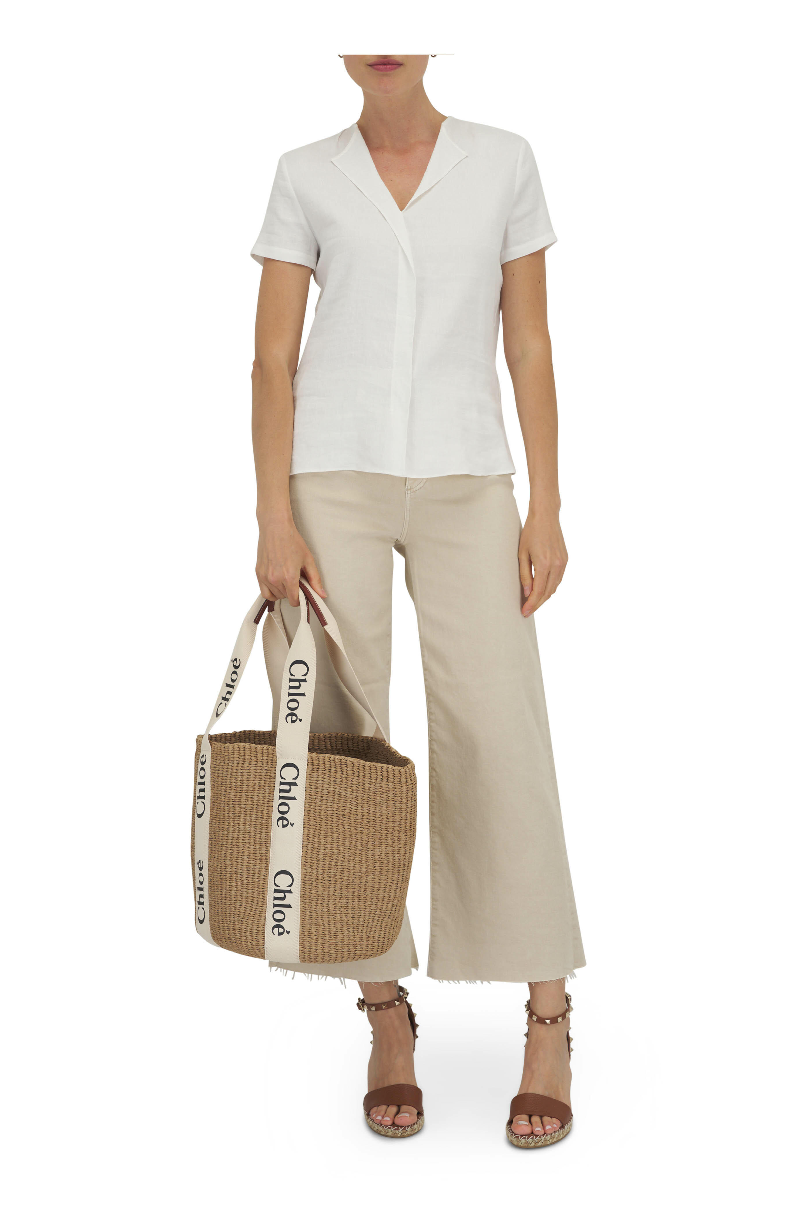 Split neckline. Pull-over styling. Made in Italy. 62% linen, 33% viscose, 5% elastane. Dry clean.