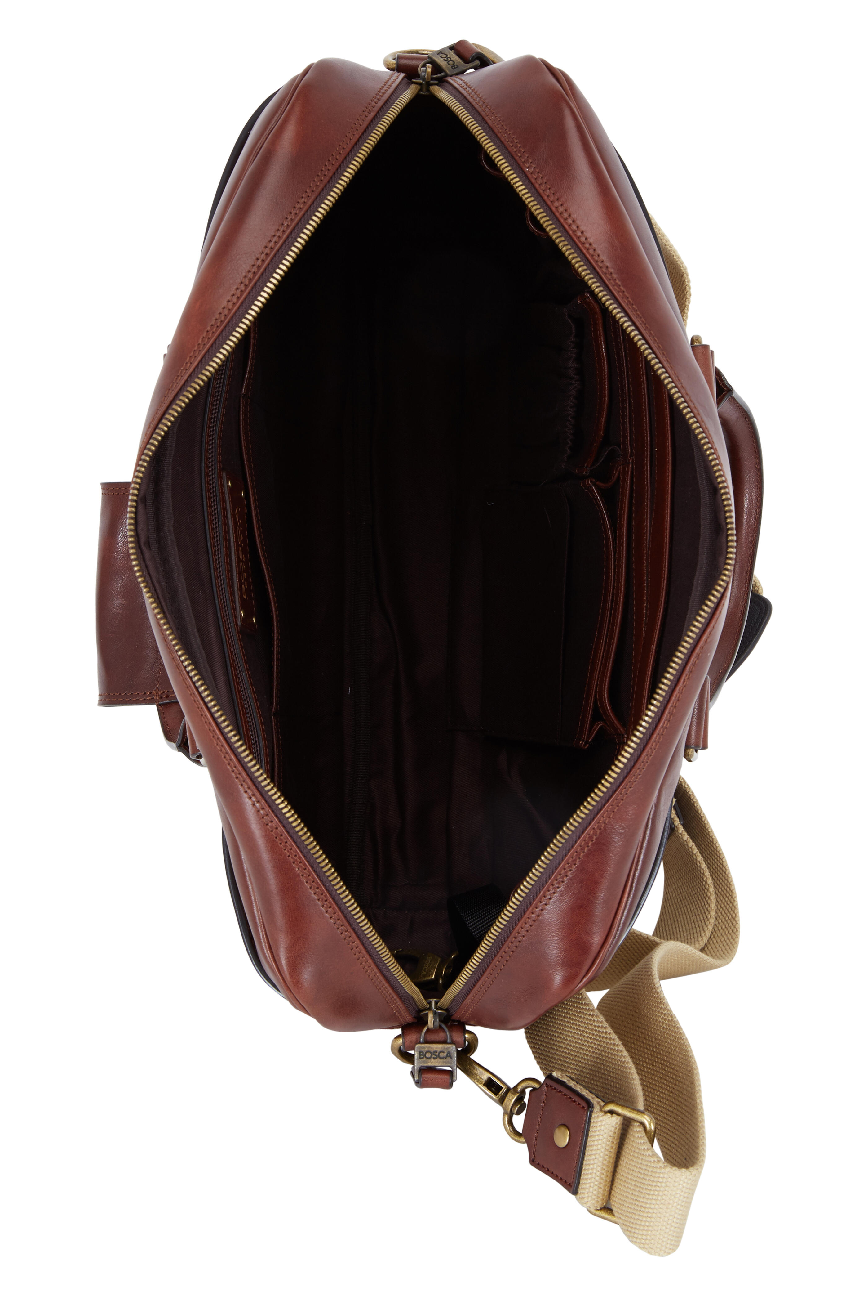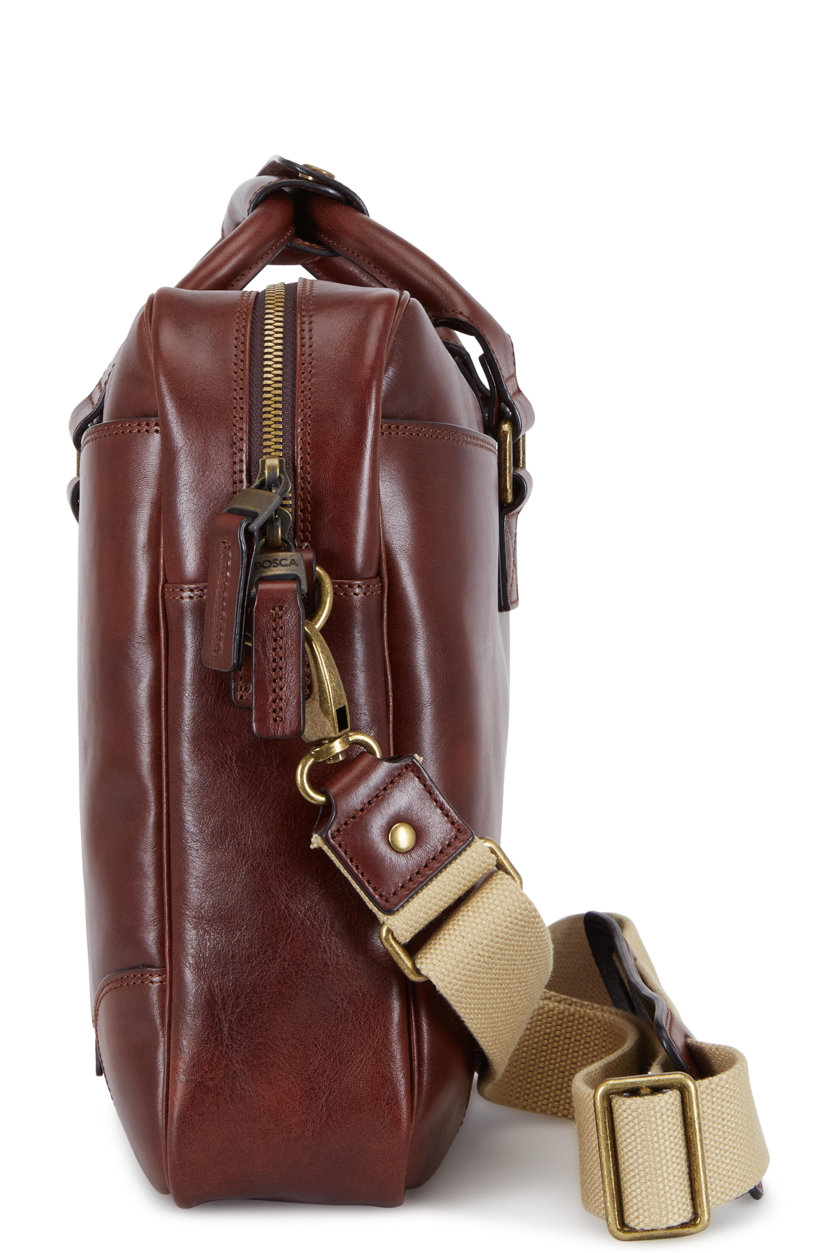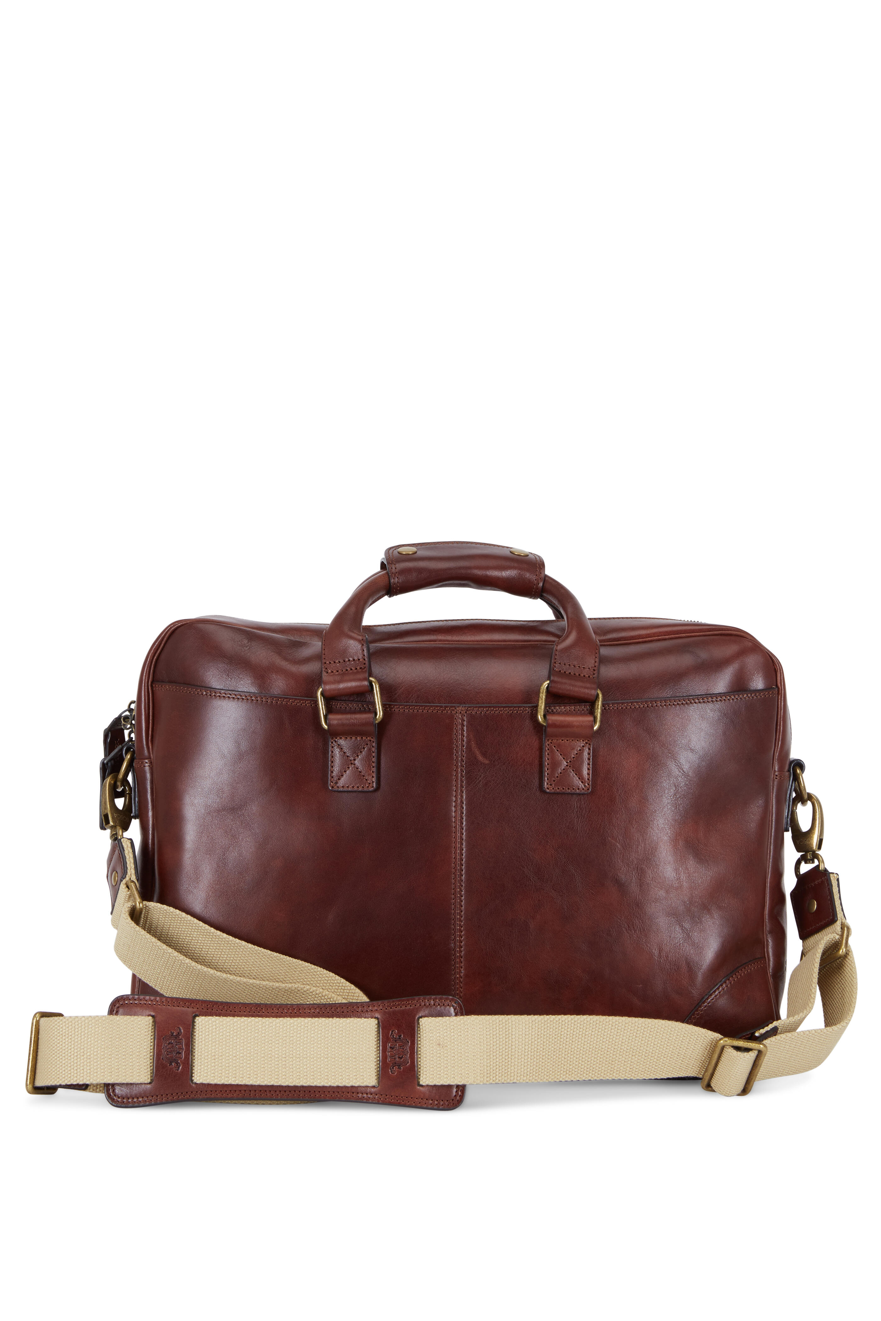 Hand-stained Italian leather. Dual top handles. Detachable and adjustable nylon web shoulder strap. Exterior front and back open pockets. Interior zipper pocket & two large open pockets. Organizational compartments. Fully lined. Imported. Accommodates up to a 15" computer. Width: 16 ". Height: 12". Depth: 4 ½".