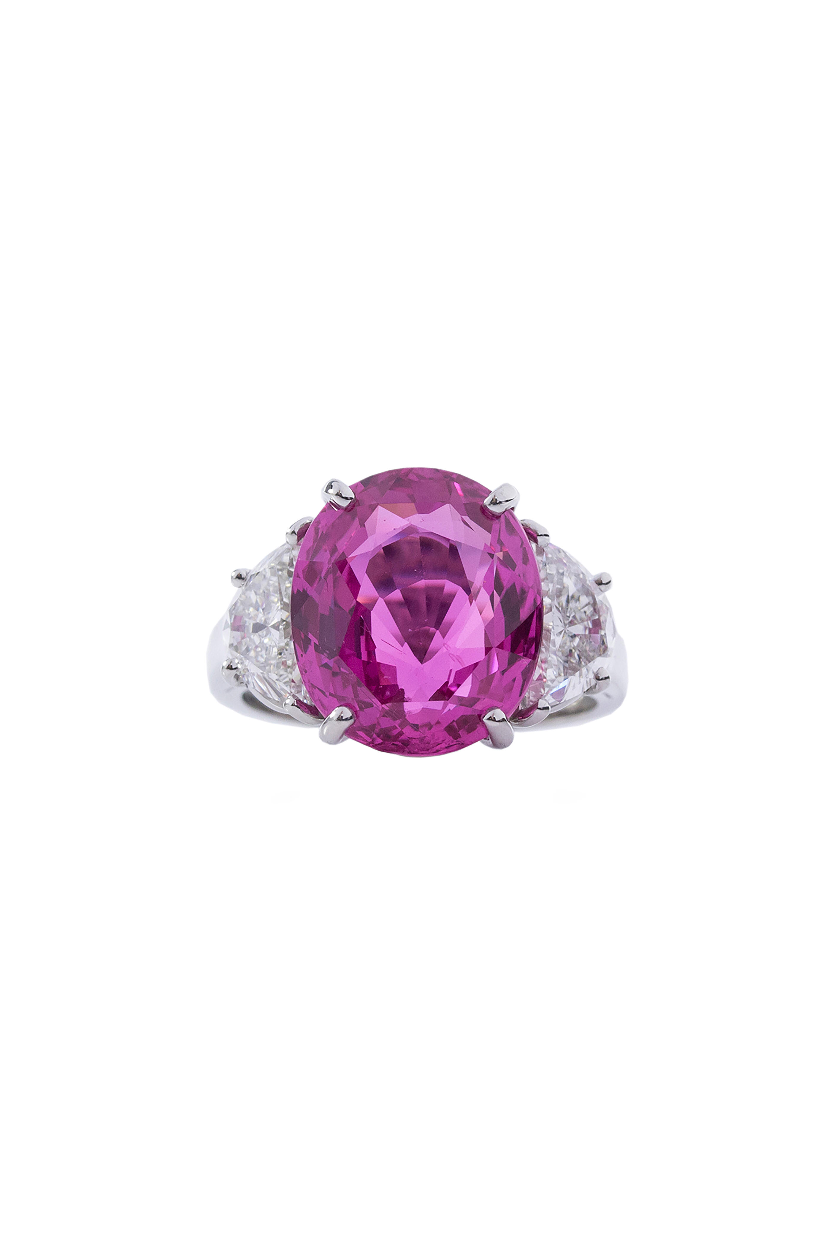Platinum. Pink sapphire, 9.82 total carat weight. Half moon diamonds, 1.73 total carat weight.