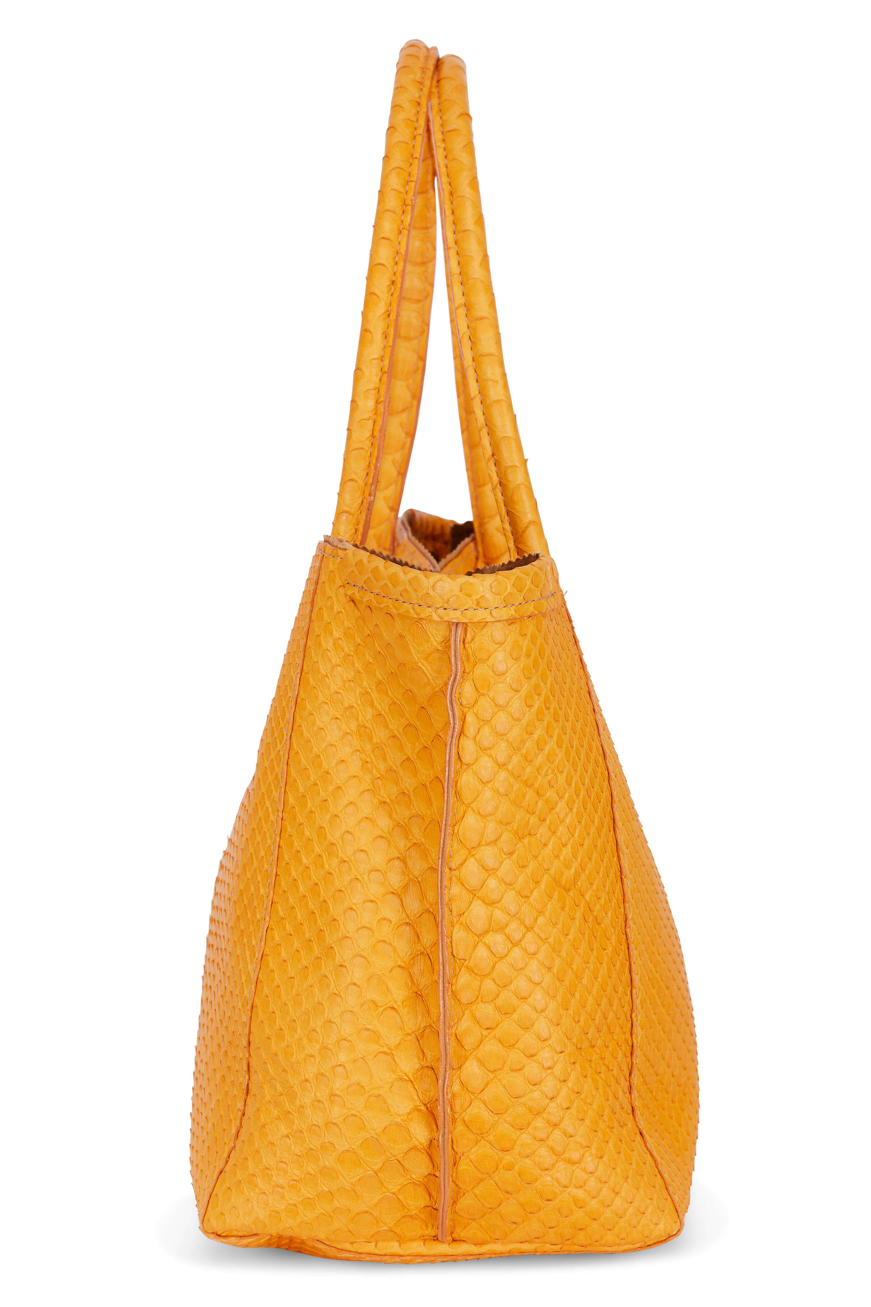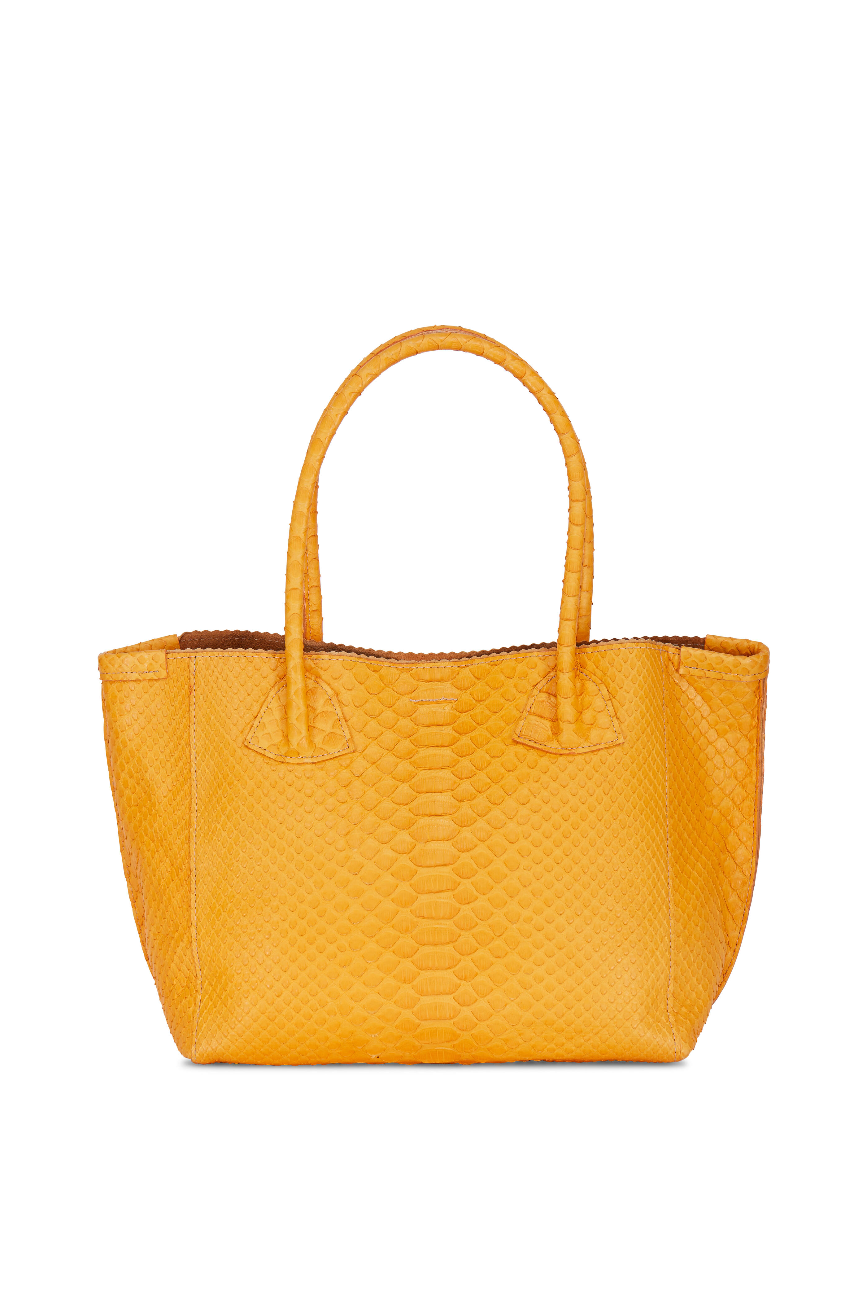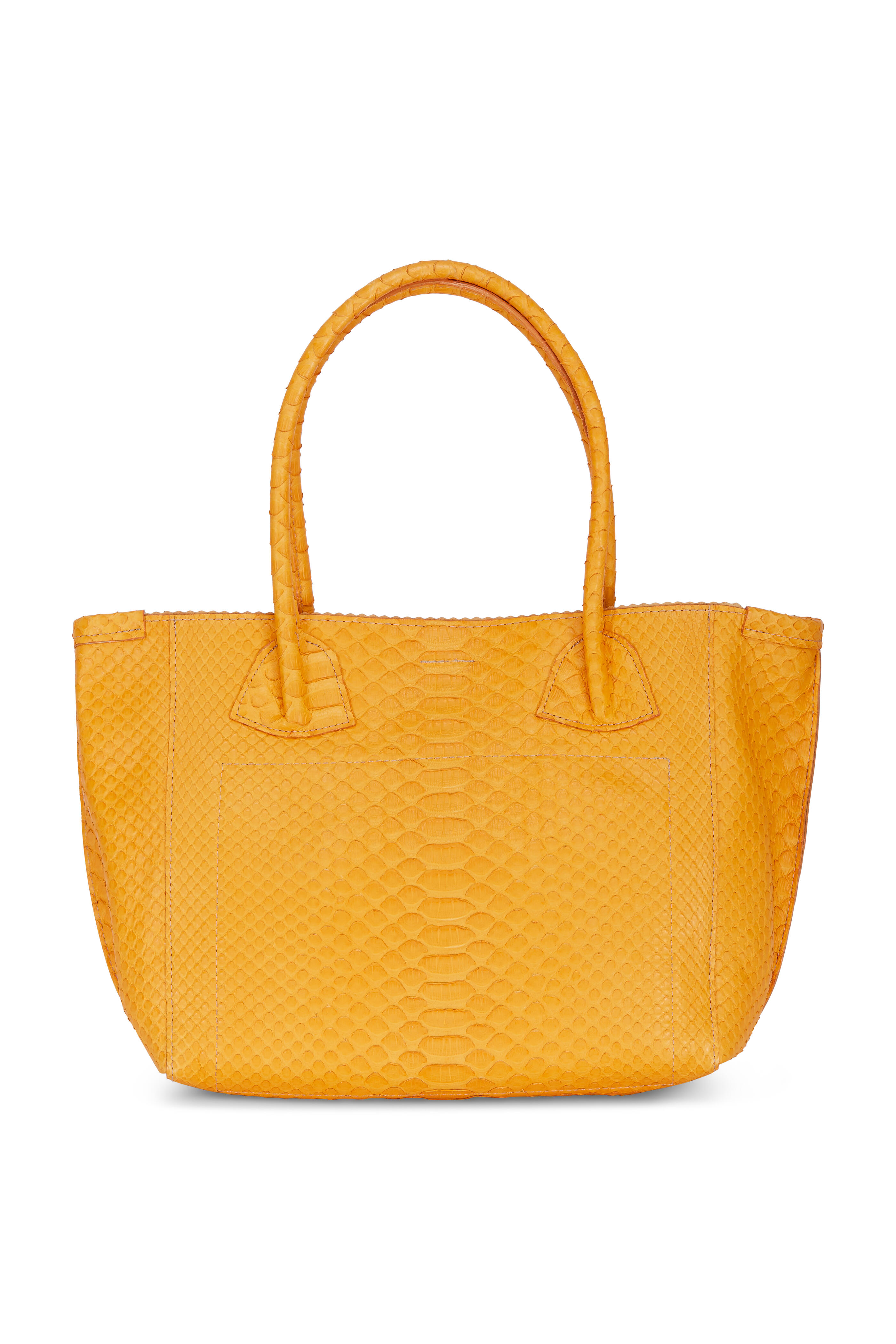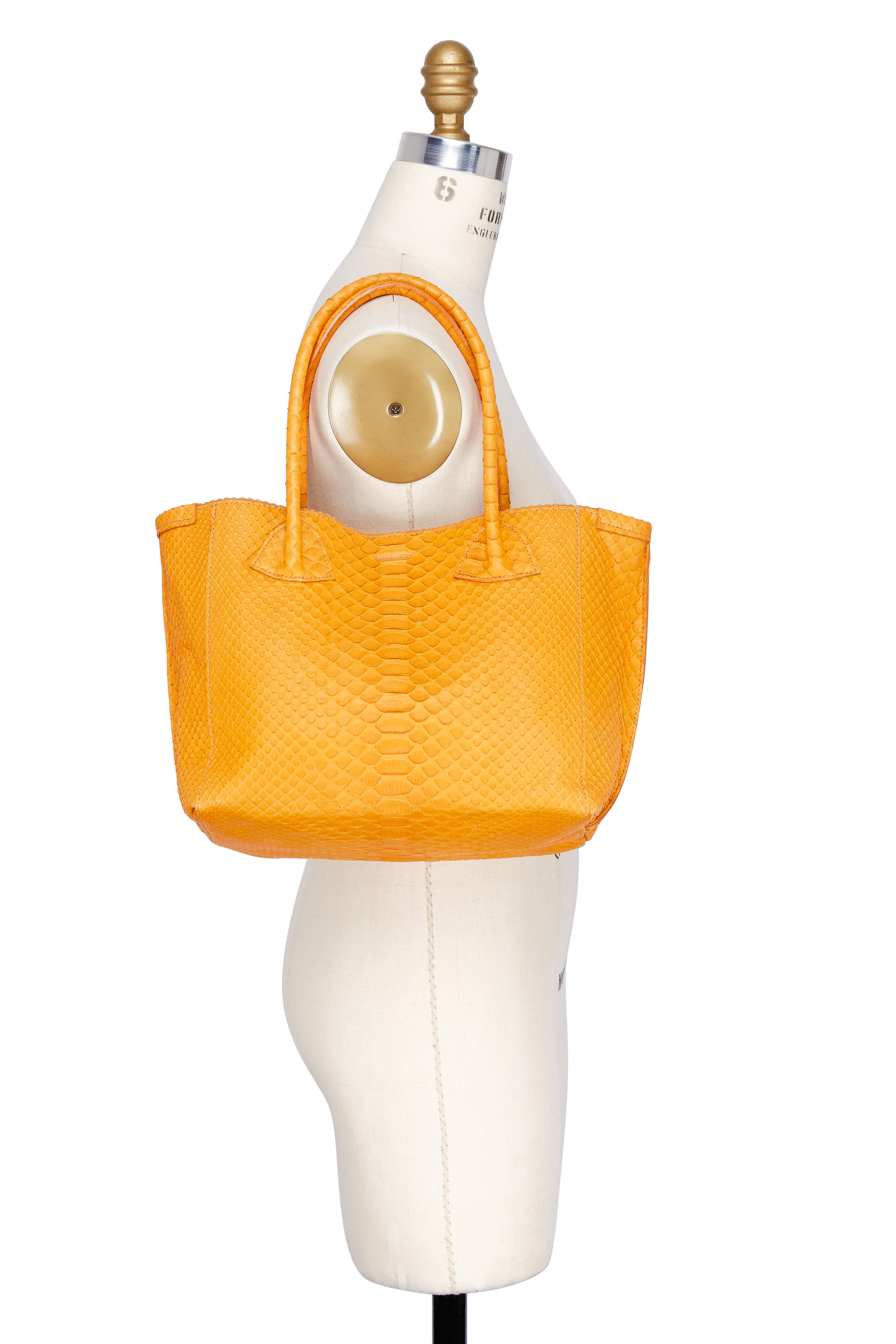 Python leather. Rolled top handles. Magnetic snap closure. Interior zip pocket, interior slip pocket. Fully suede lined. Made in the USA. Height: 9". Width: 11". Depth: 6 ½". Strap drop: 7".