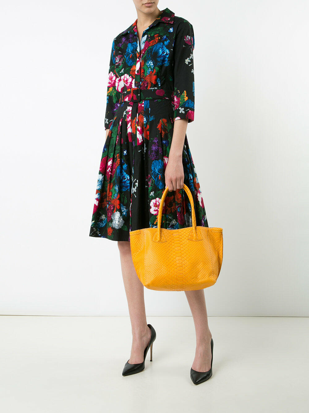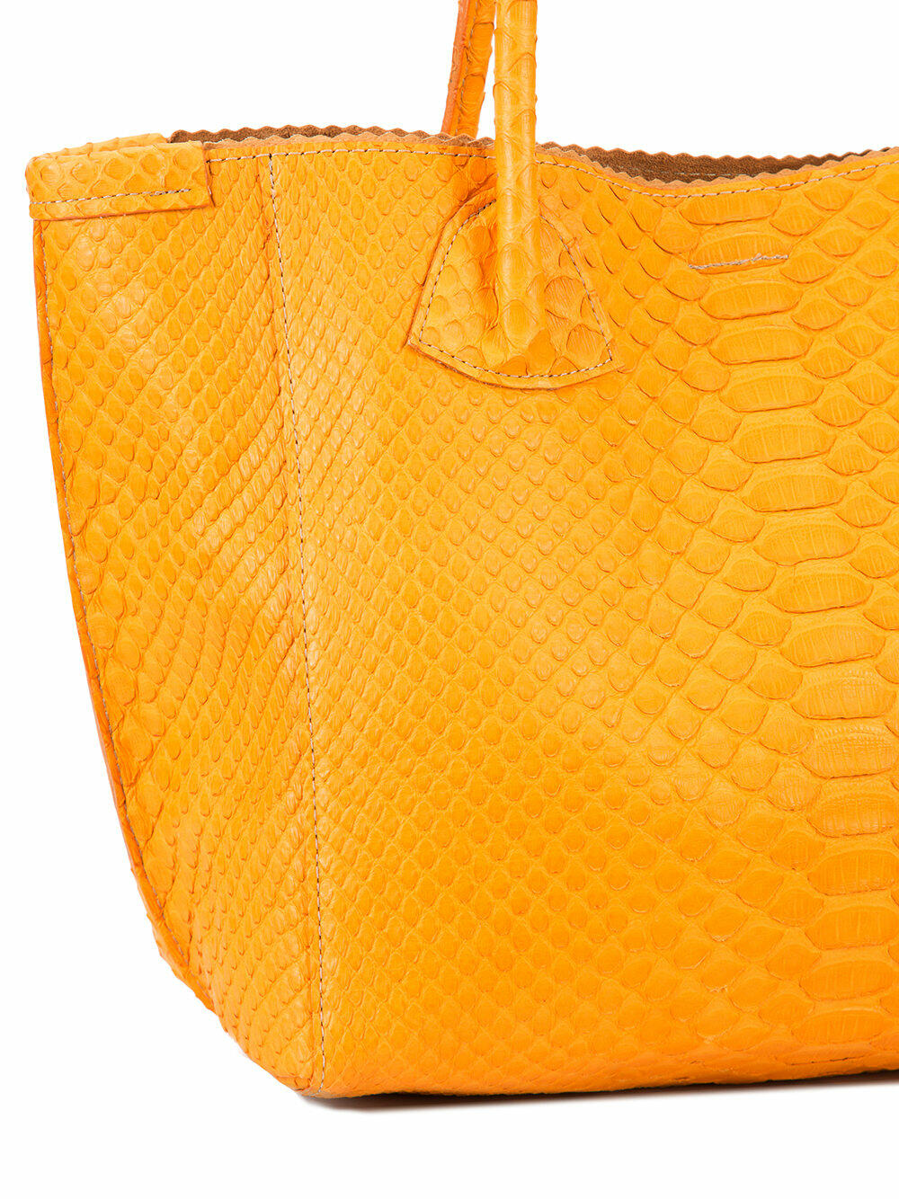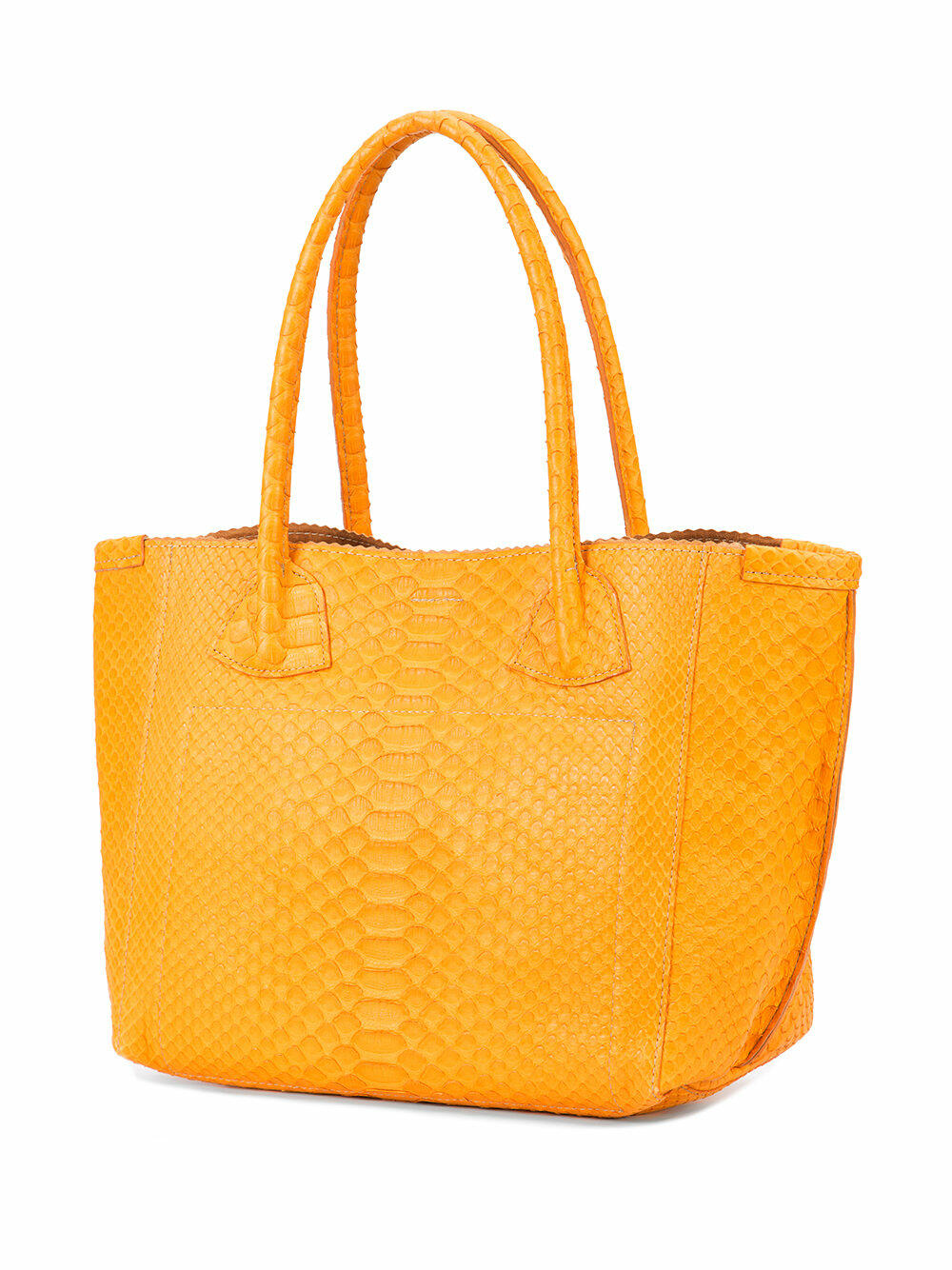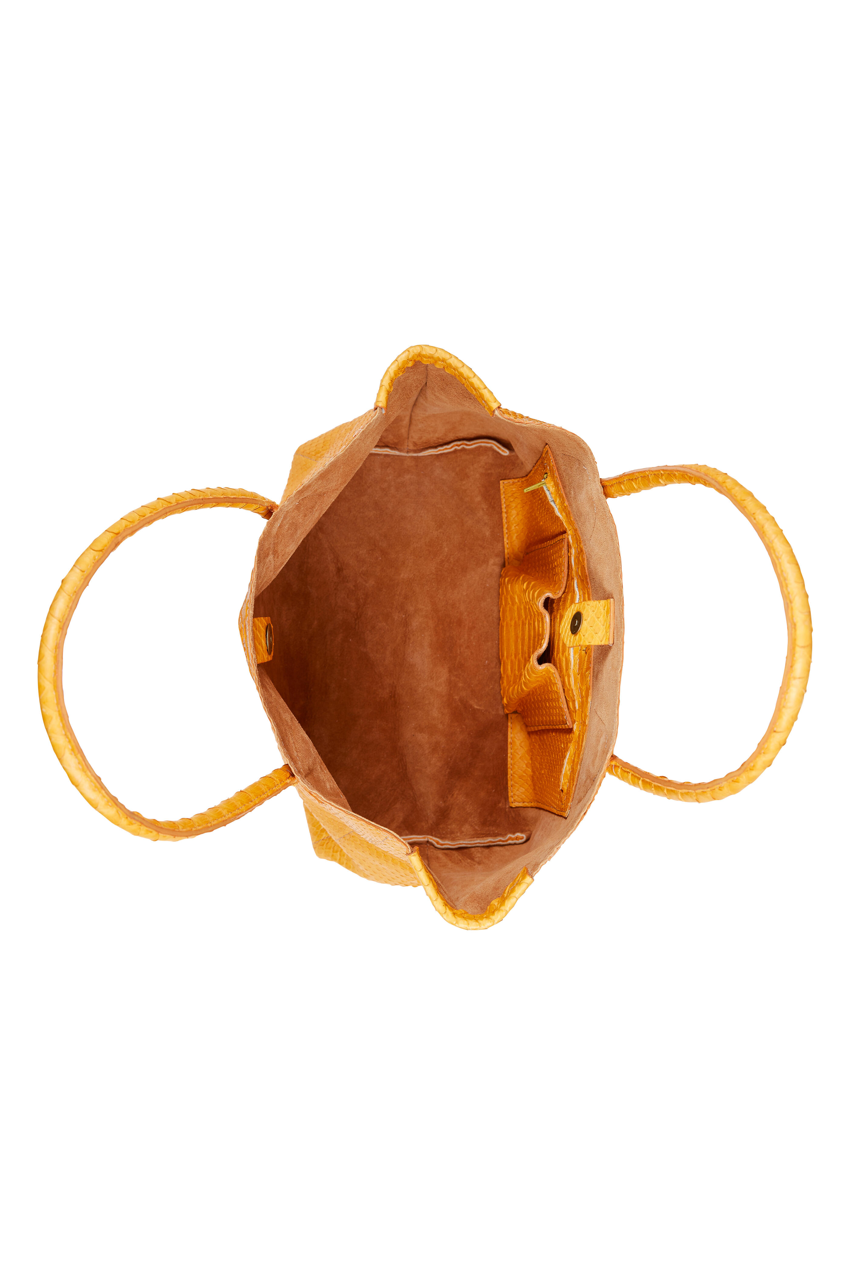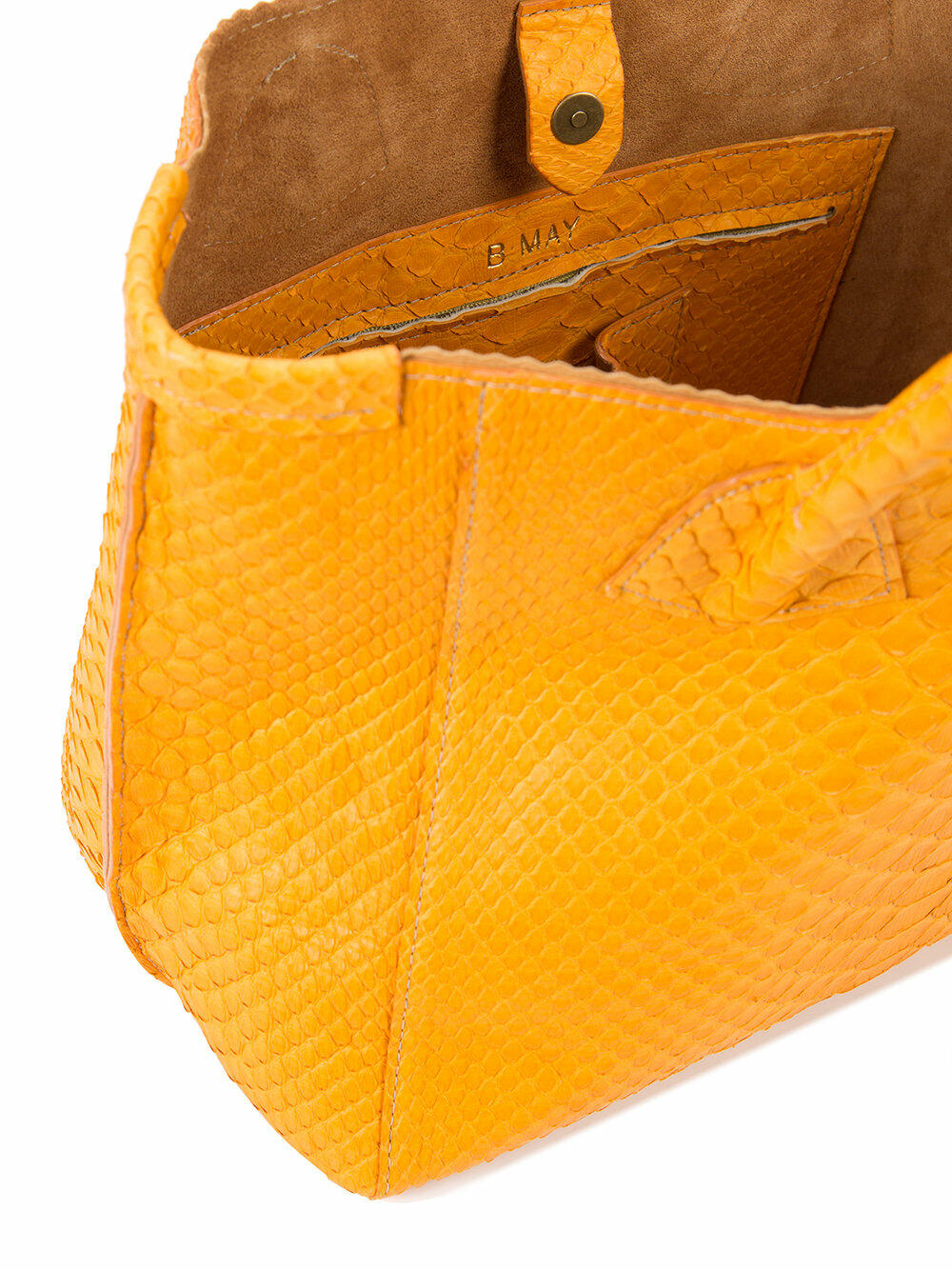 Python leather. Rolled top handles. Magnetic snap closure. Interior zip pocket, interior slip pocket. Fully suede lined. Made in the USA. Height: 9". Width: 11". Depth: 6 ½". Strap drop: 7".