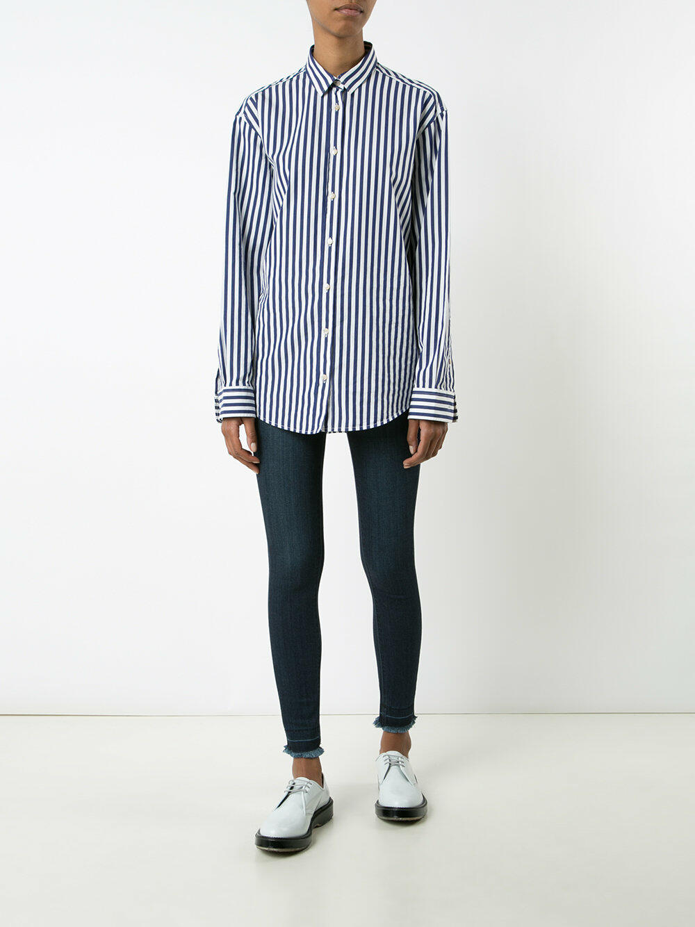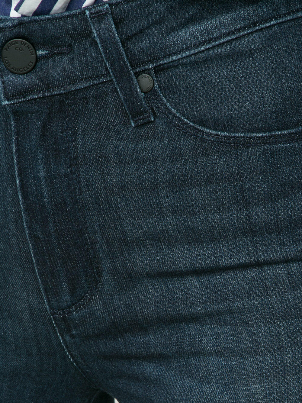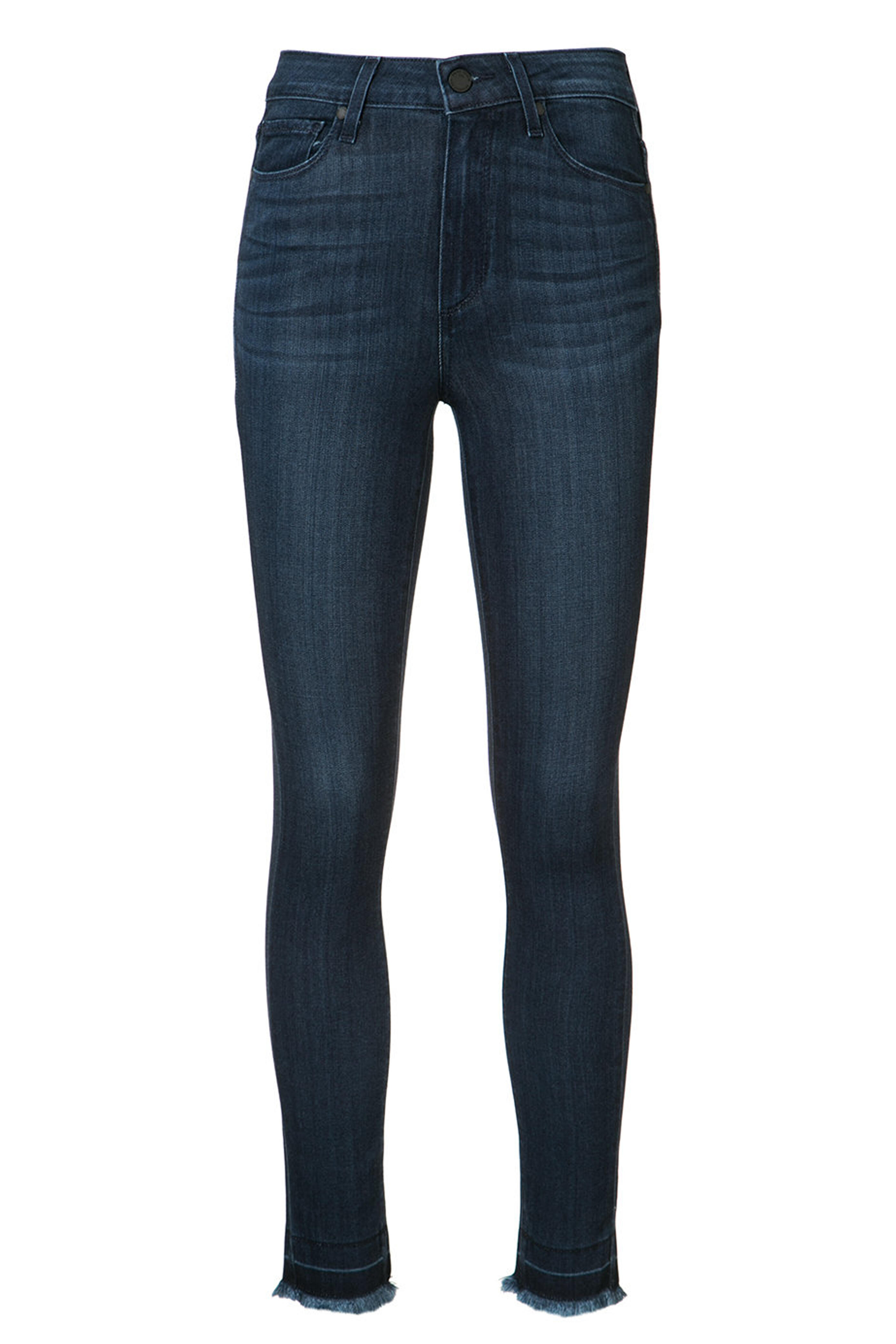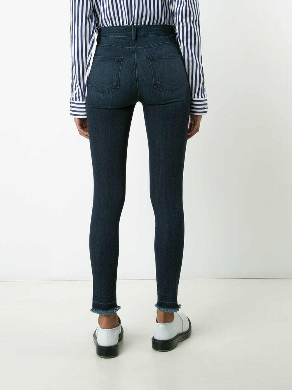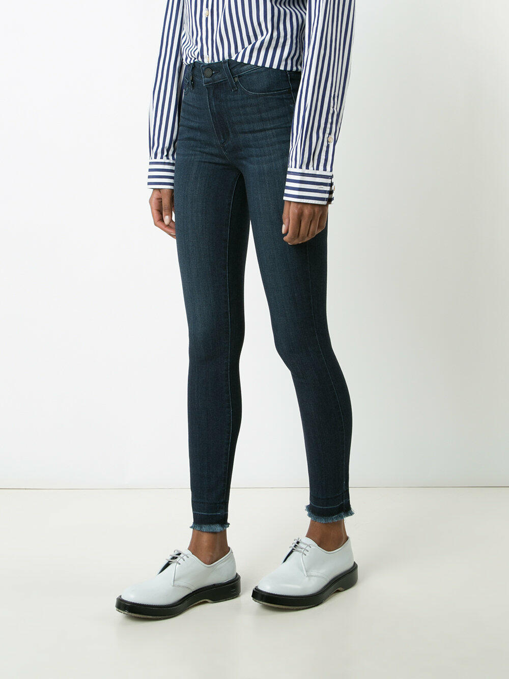 Five pocket styling. Light wiskering. Released hem. Made in the USA. High rise ankle skinny. Inseam: 28". Leg opening: 5". 54% rayon, 23% cotton, 22% polyester, 1% spandex. Machine wash cold.