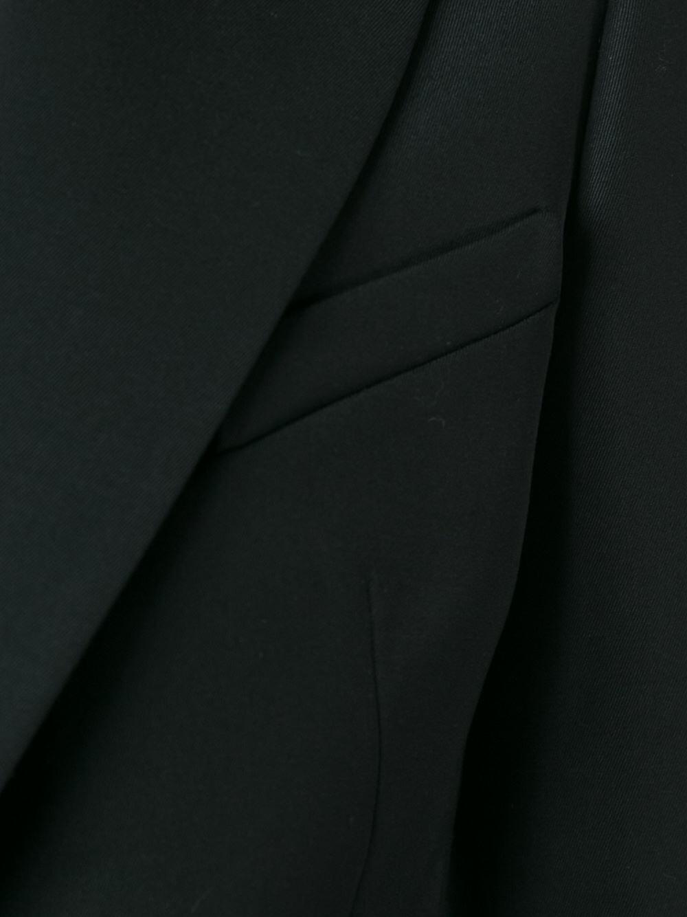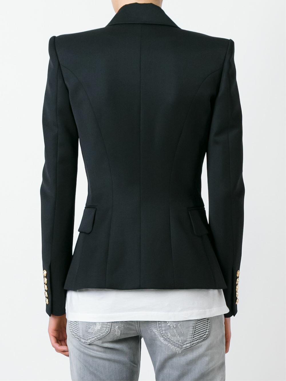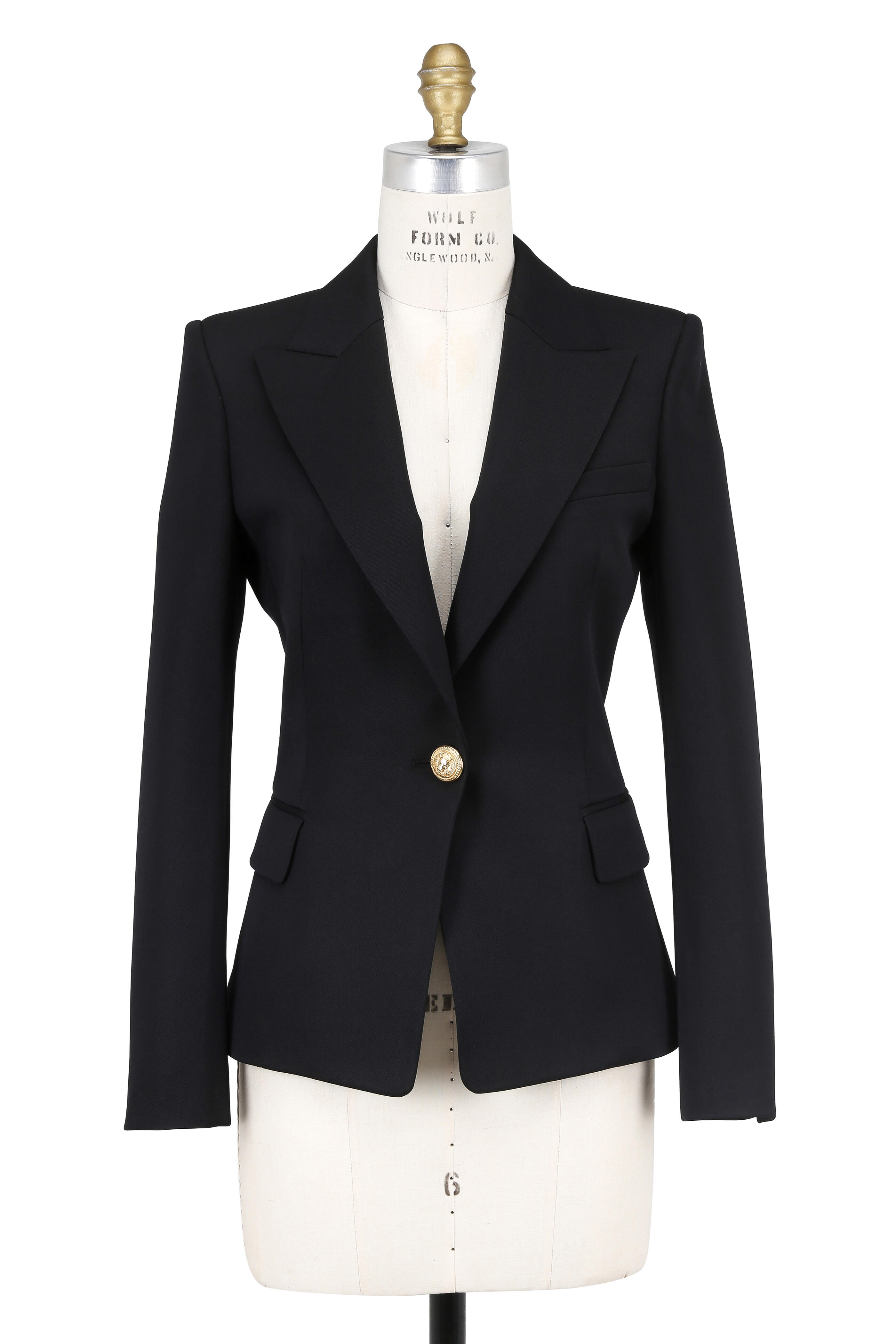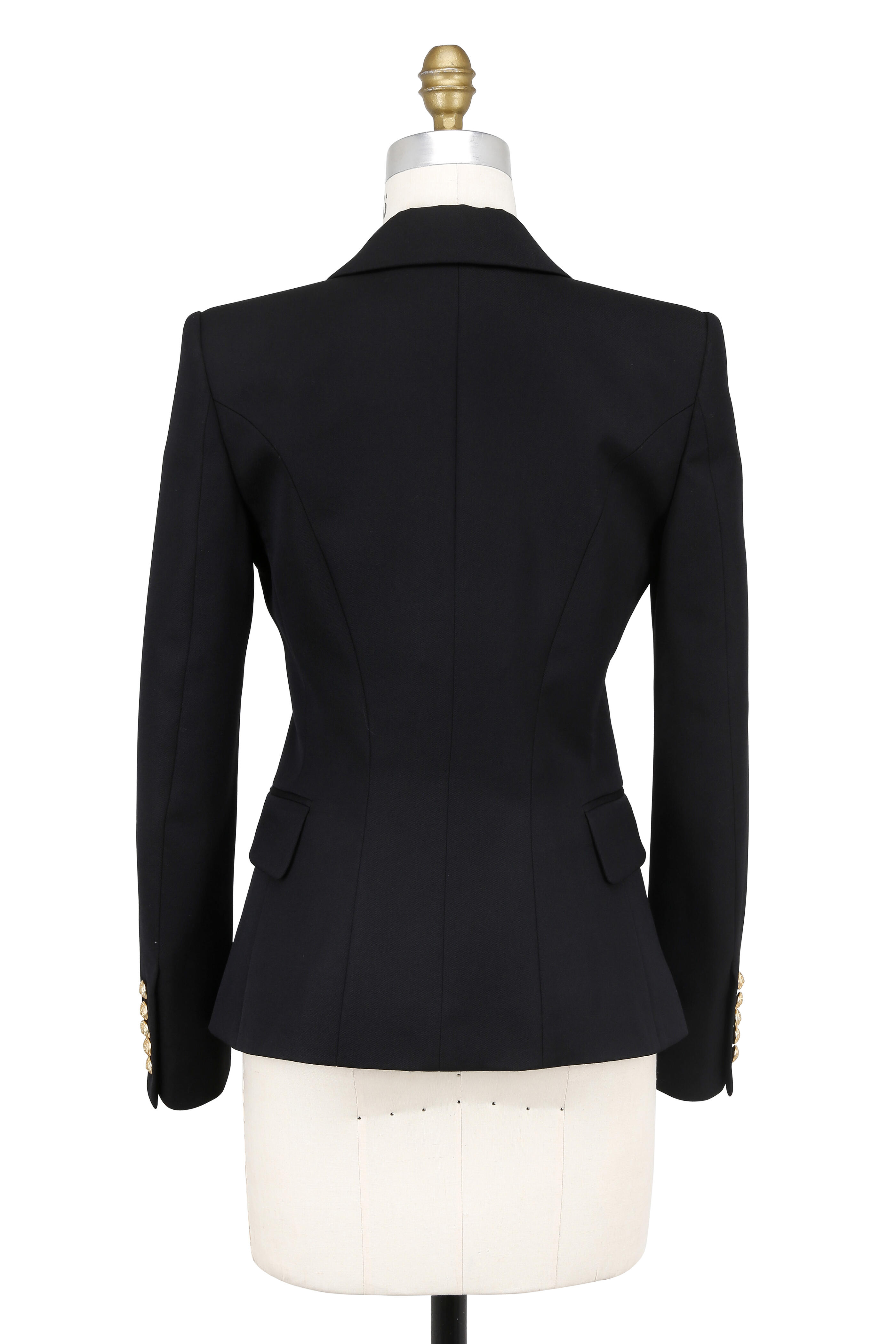 Peak lapels. Double-breasted front closure; signature lion embossed button front closure. Chest welt pocket, waist flap pockets. Five signature lion embossed buttoned cuffs. Imported. 25" shoulder to hem. 100% virgin wool; fully lined. Dry clean.