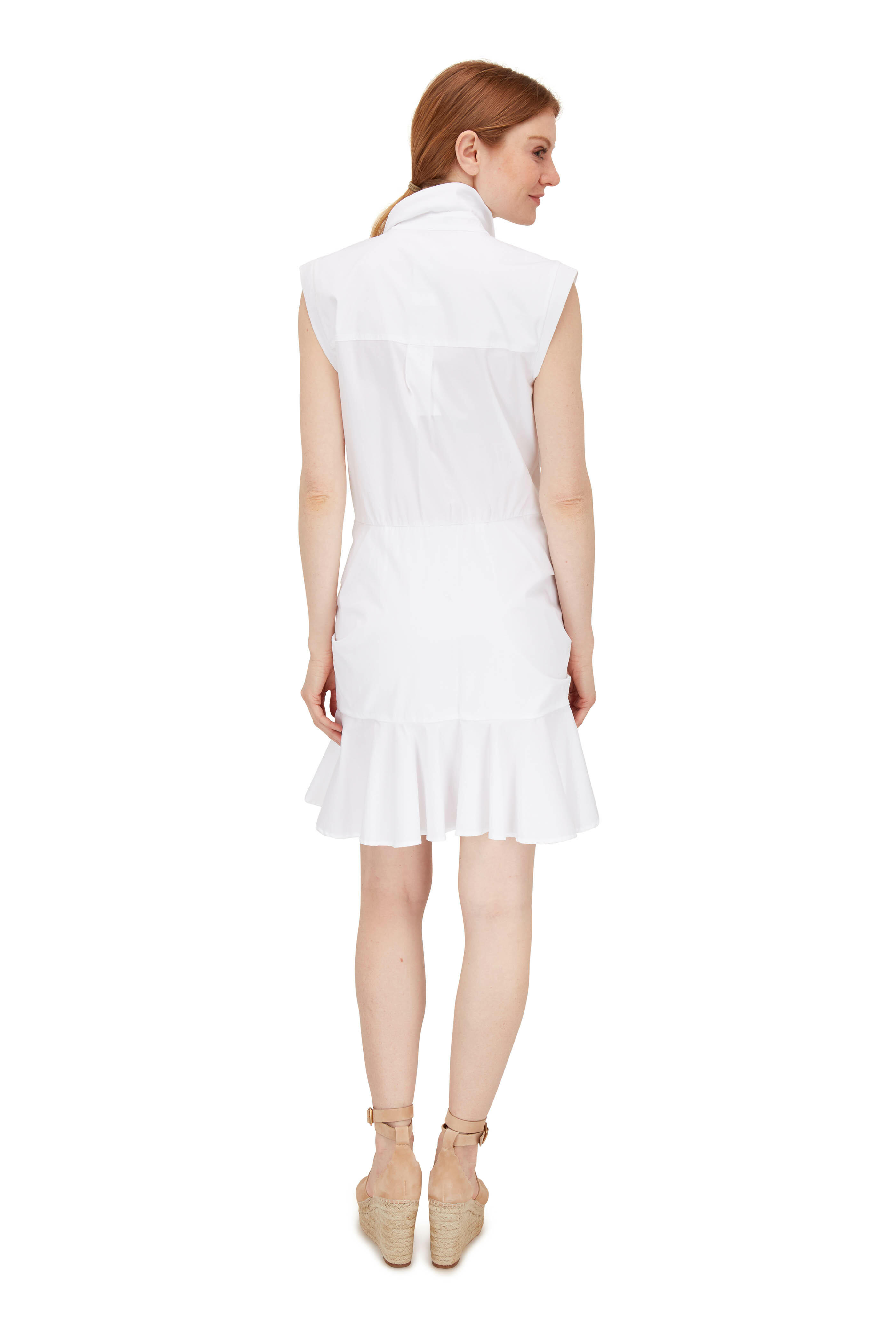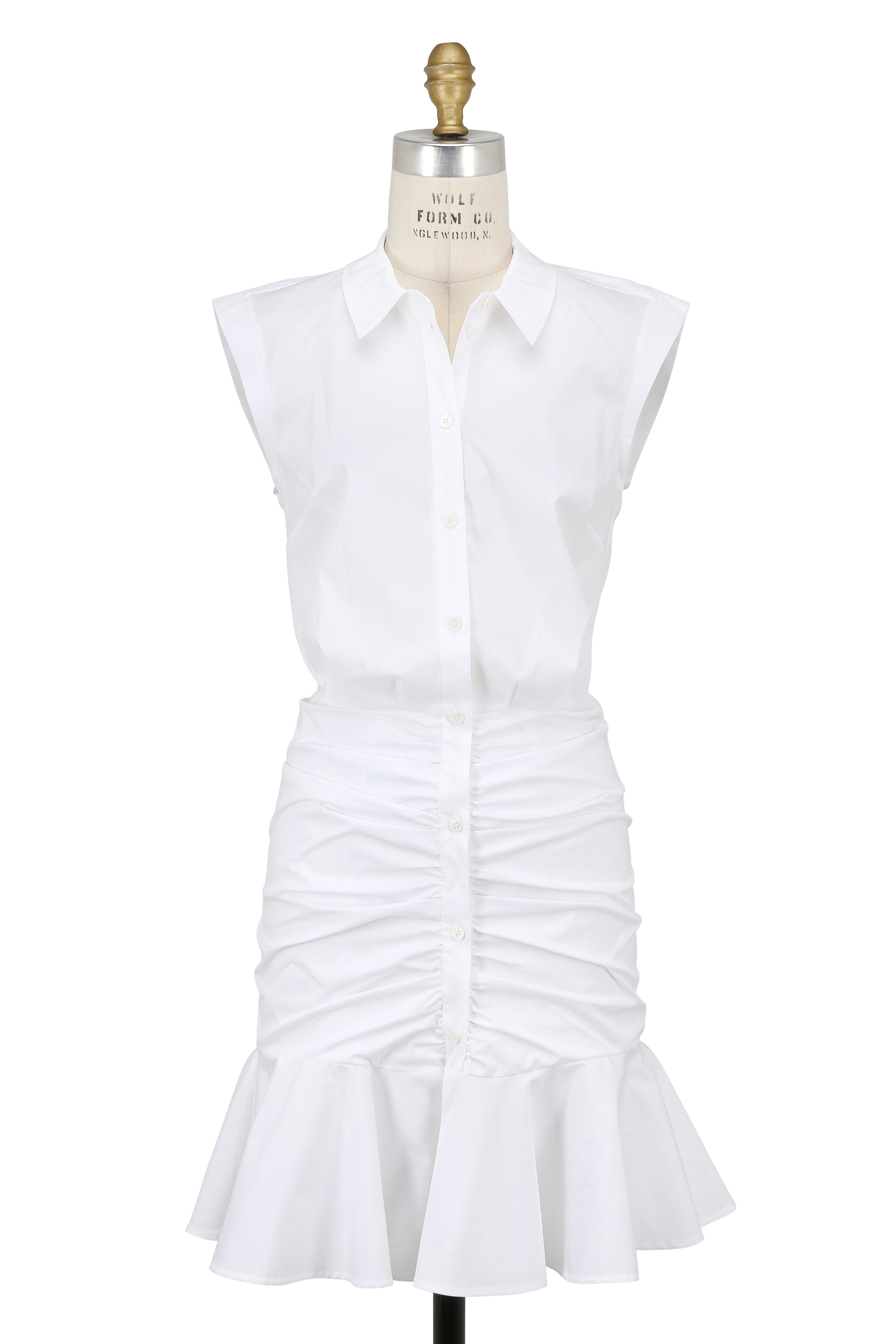 Spread collar. Button placket. Cap sleeves. Bust darts. Ruching at skirt. Ruffled hem. Imported. 36" shoulder to hem. 97% cotton, 3% elastane. Dry clean.