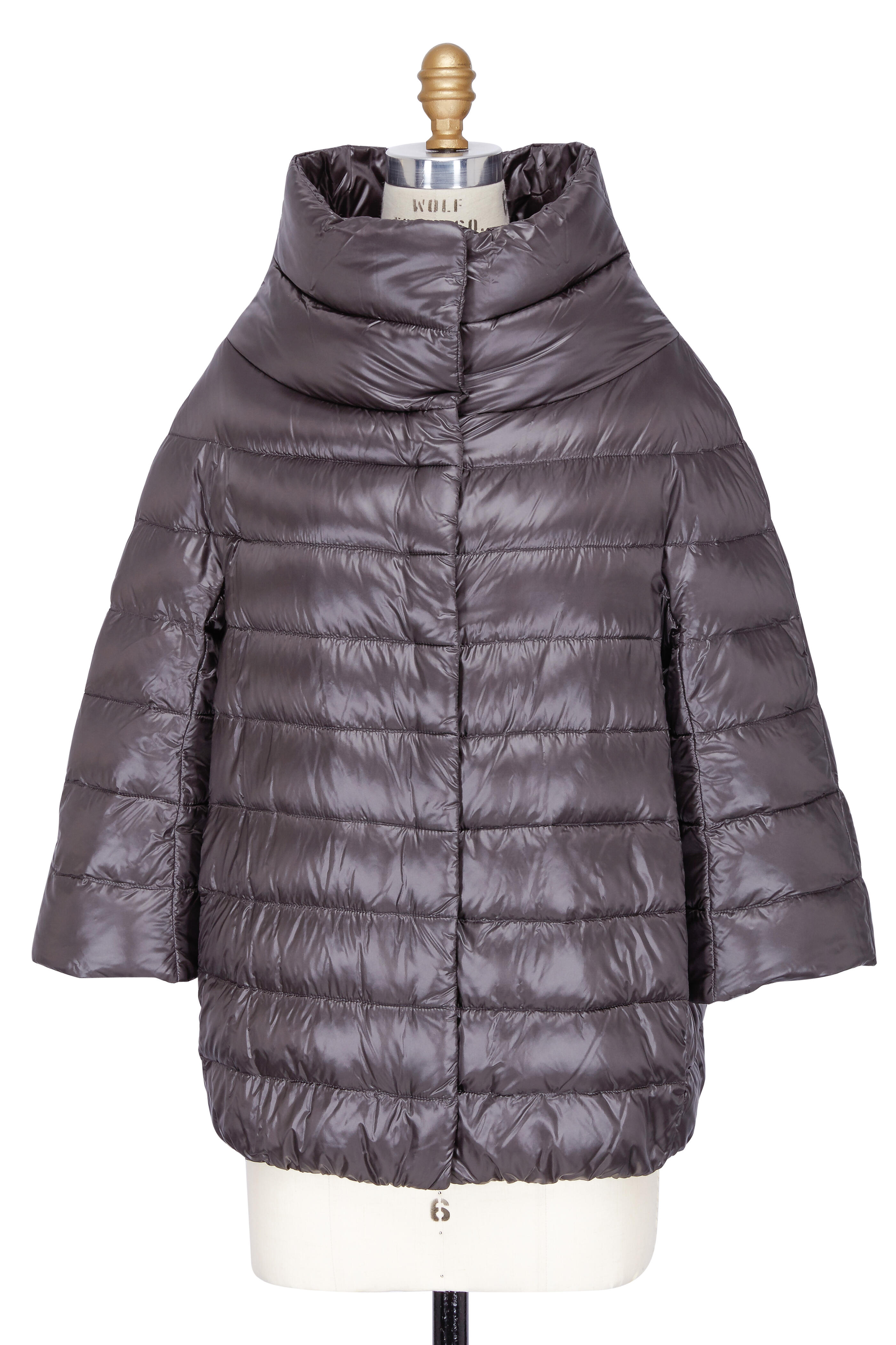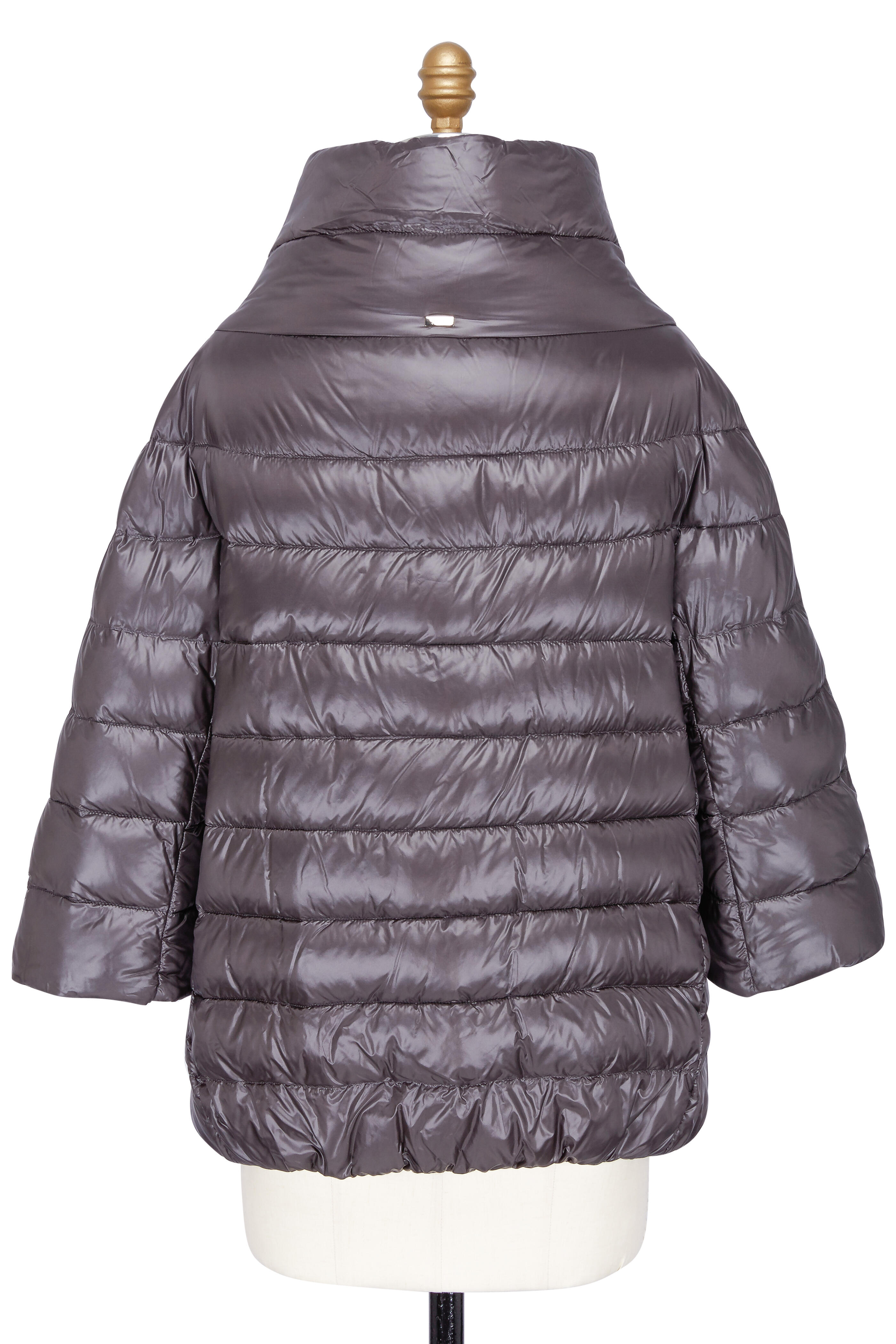 Funnel neckline. Button-snap front closure. Three-quarter sleeves. Front slip pockets. Imported. 100% polyamide; filling: 90% goose down, 10% goose feather. Hand wash cold.
