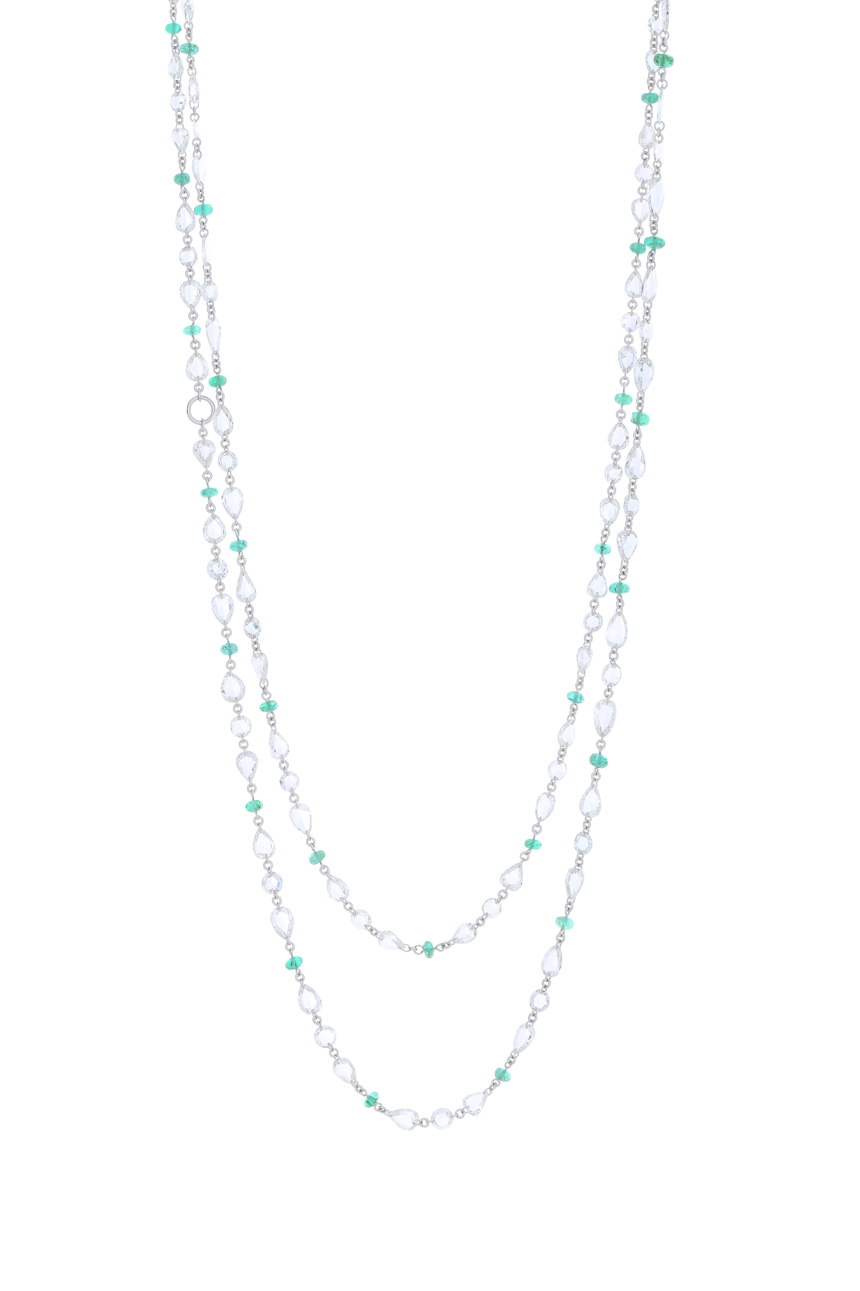 Platinum. Diamonds, 13.20 total carat weight. Emerald, 3.48 total carat weight. 32" L.
