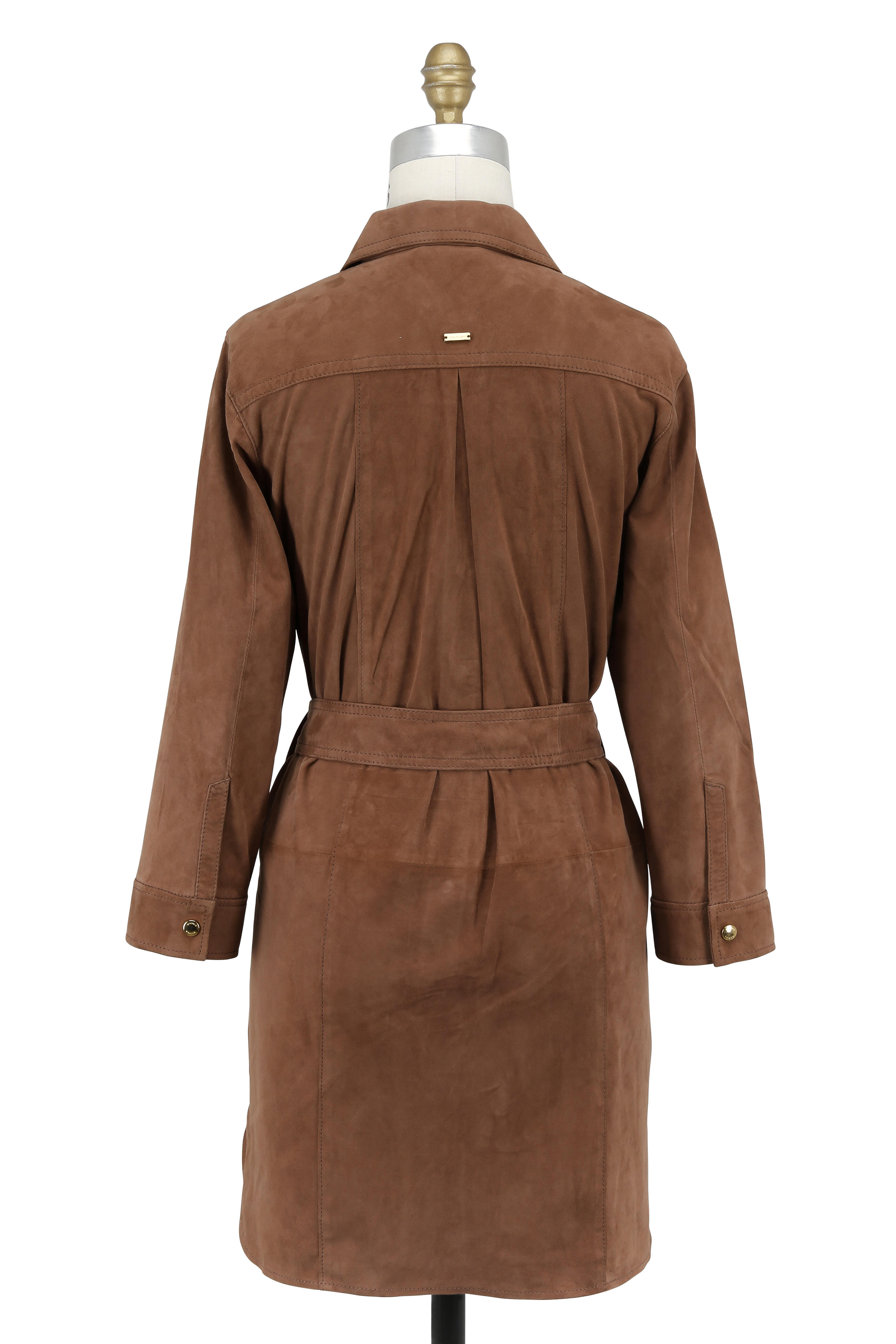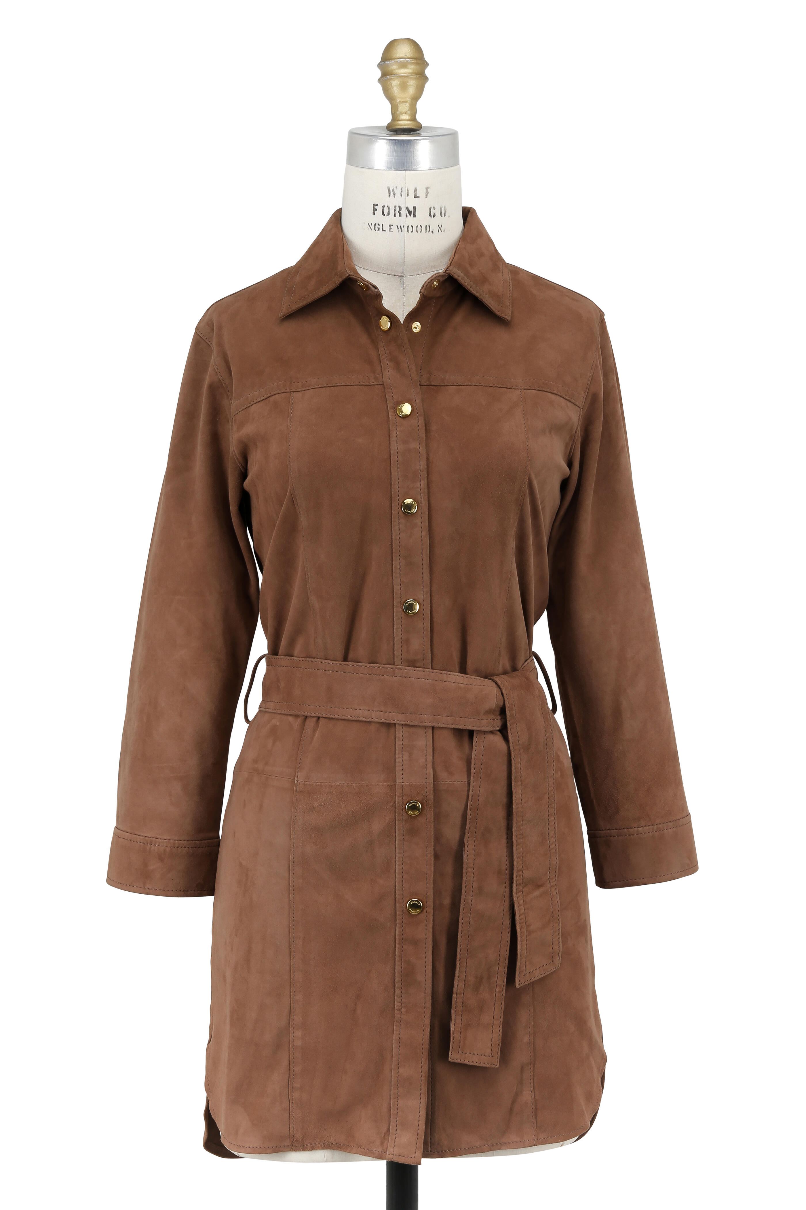 Specialist clean. Spread collar. Exposed gold-toned snap front closure. Self belt. Curved hem; side slits. Imported. 31" shoulder to hem. 100% goat leather.
