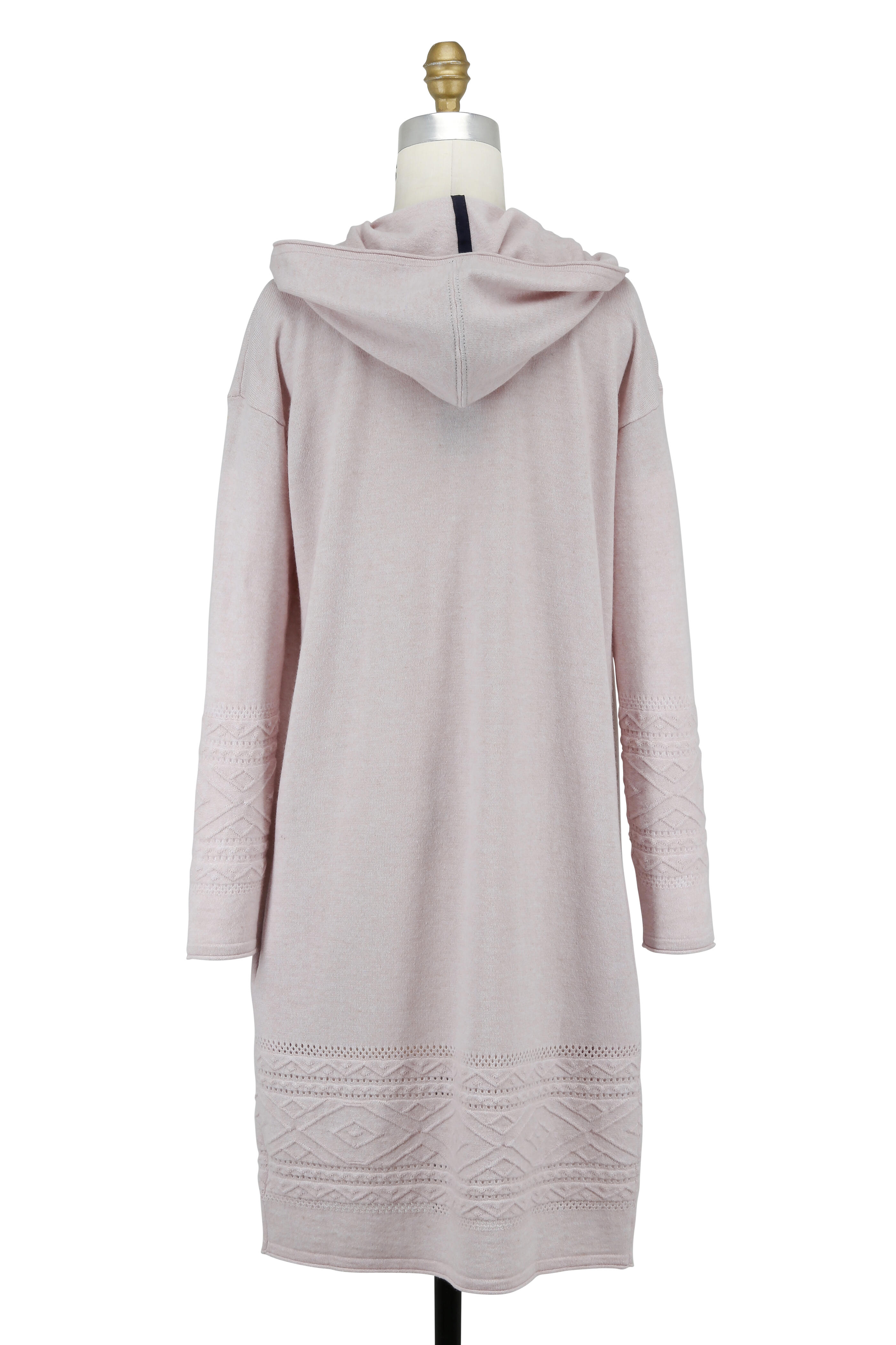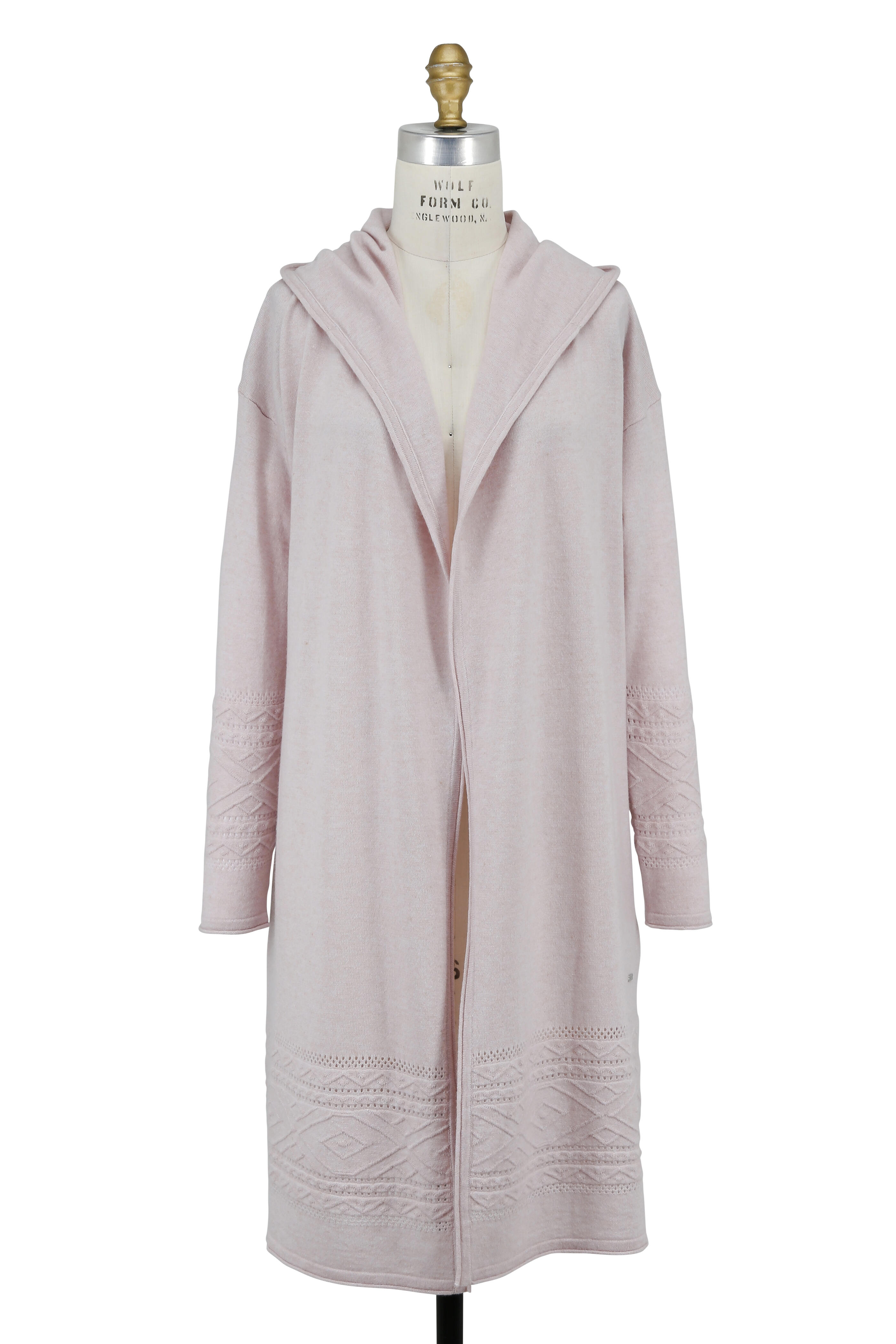 Hooded. Open front. Pointelle stitching detail at sleeves and hem. Imported. 38" shoulder to hem. 70% wool, 15% cotton, 9% cashmere. Dry clean.