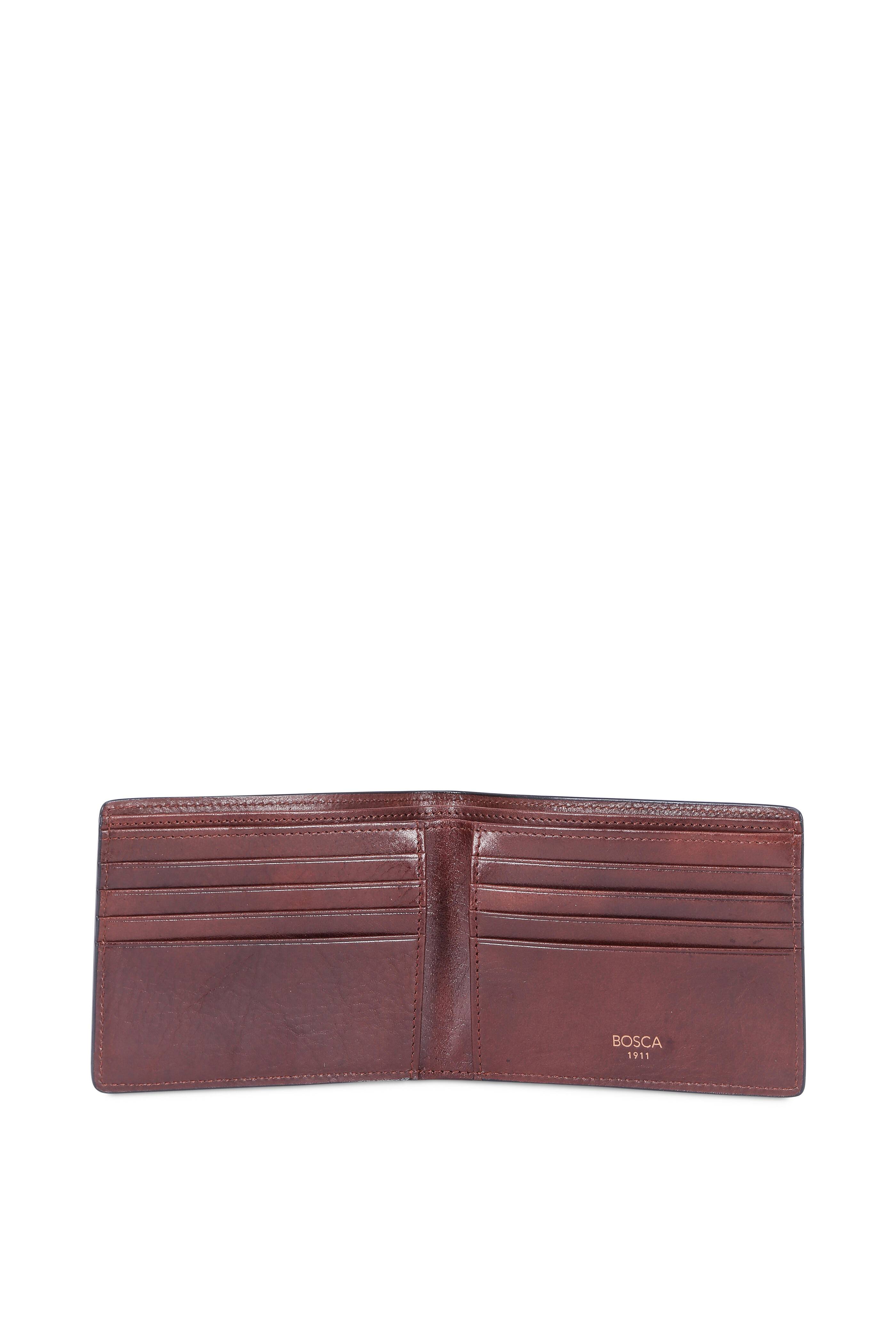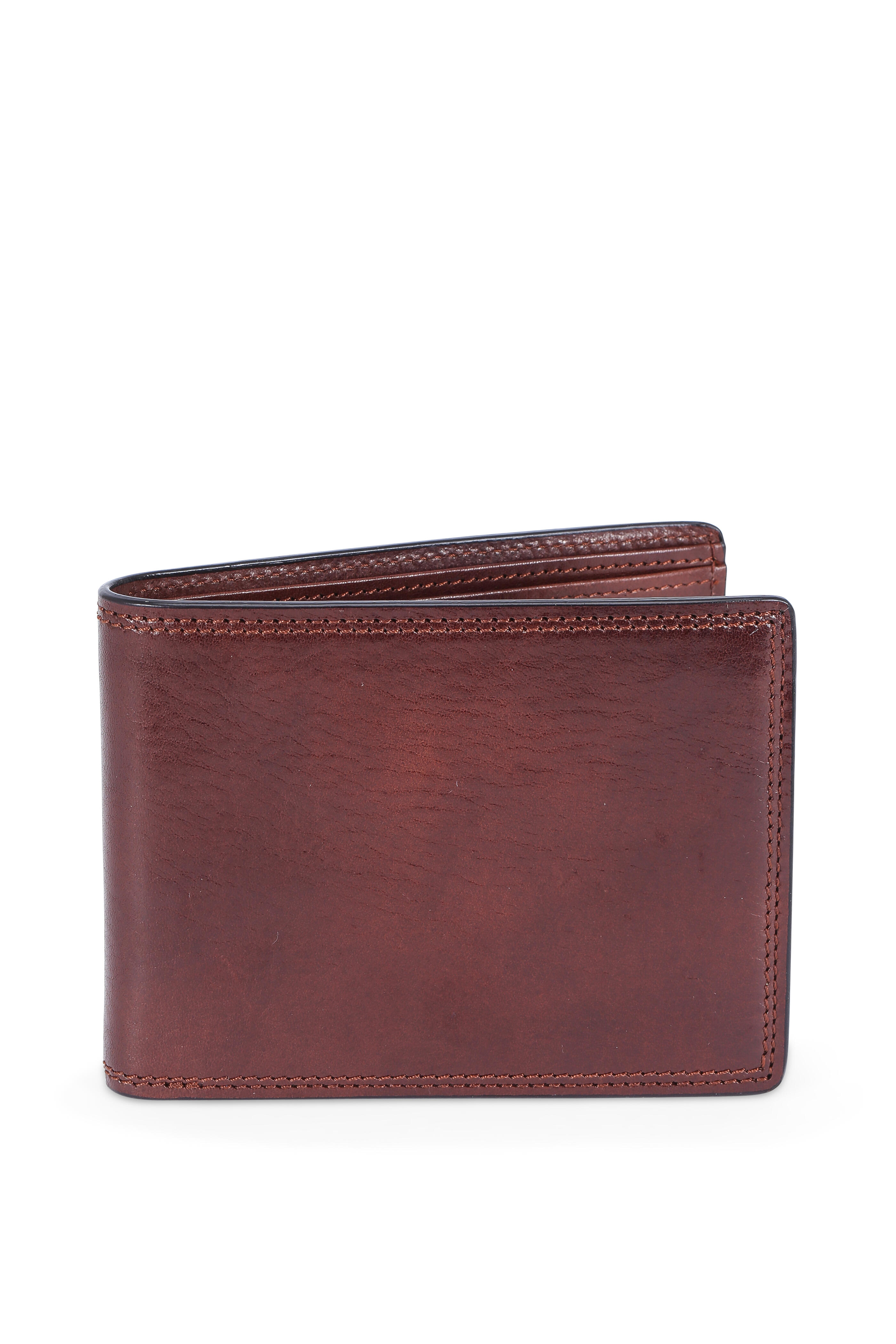 Hand-stained Italian leather. Divided currency well. Eight card slots. Two vertical stash pockets. Hand-stitched detailing. Imported. Width: 4 ½". Height: 3 ½".