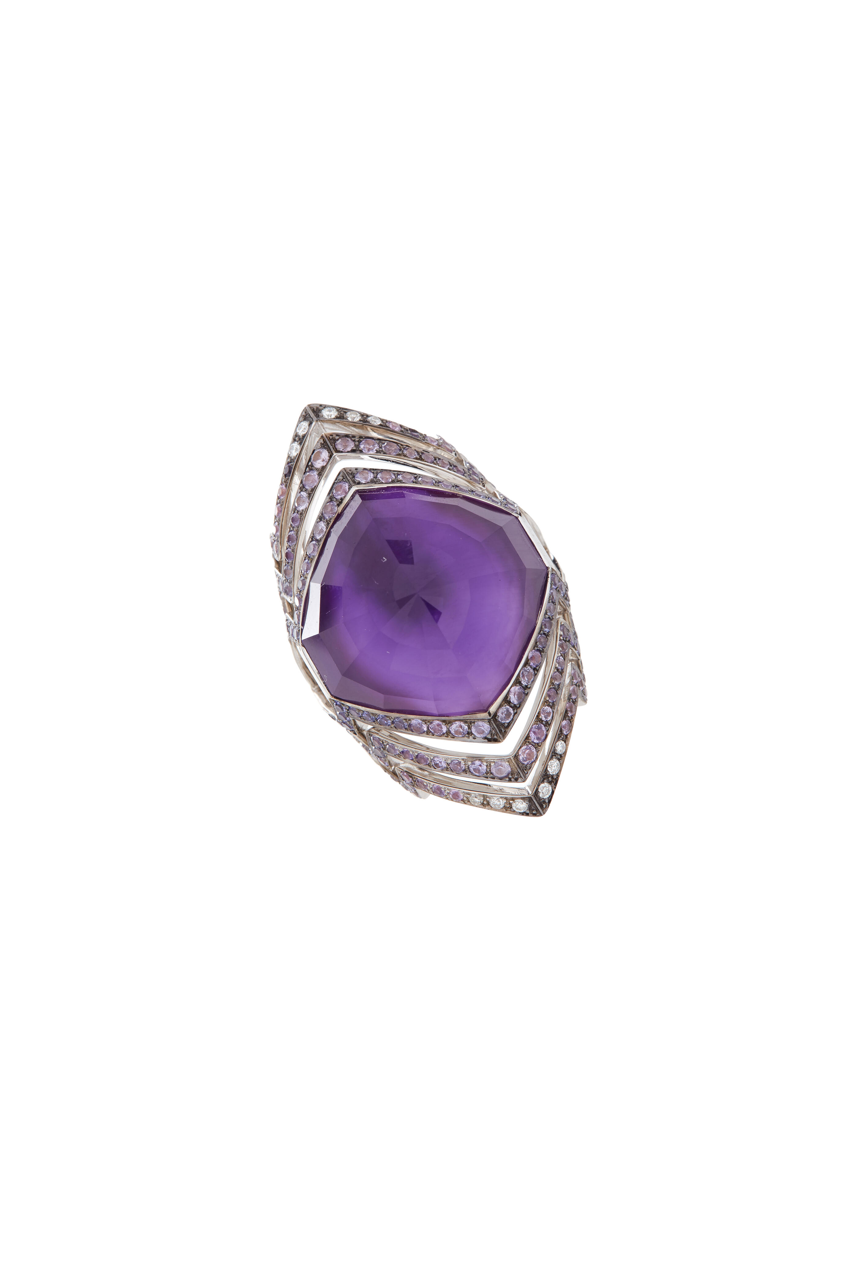 18K whtie gold. Amethyst, 20.63 total carat weight. Purple sapphires, 1.77 total carat weight. Diamonds, 0.09 total carat weight.