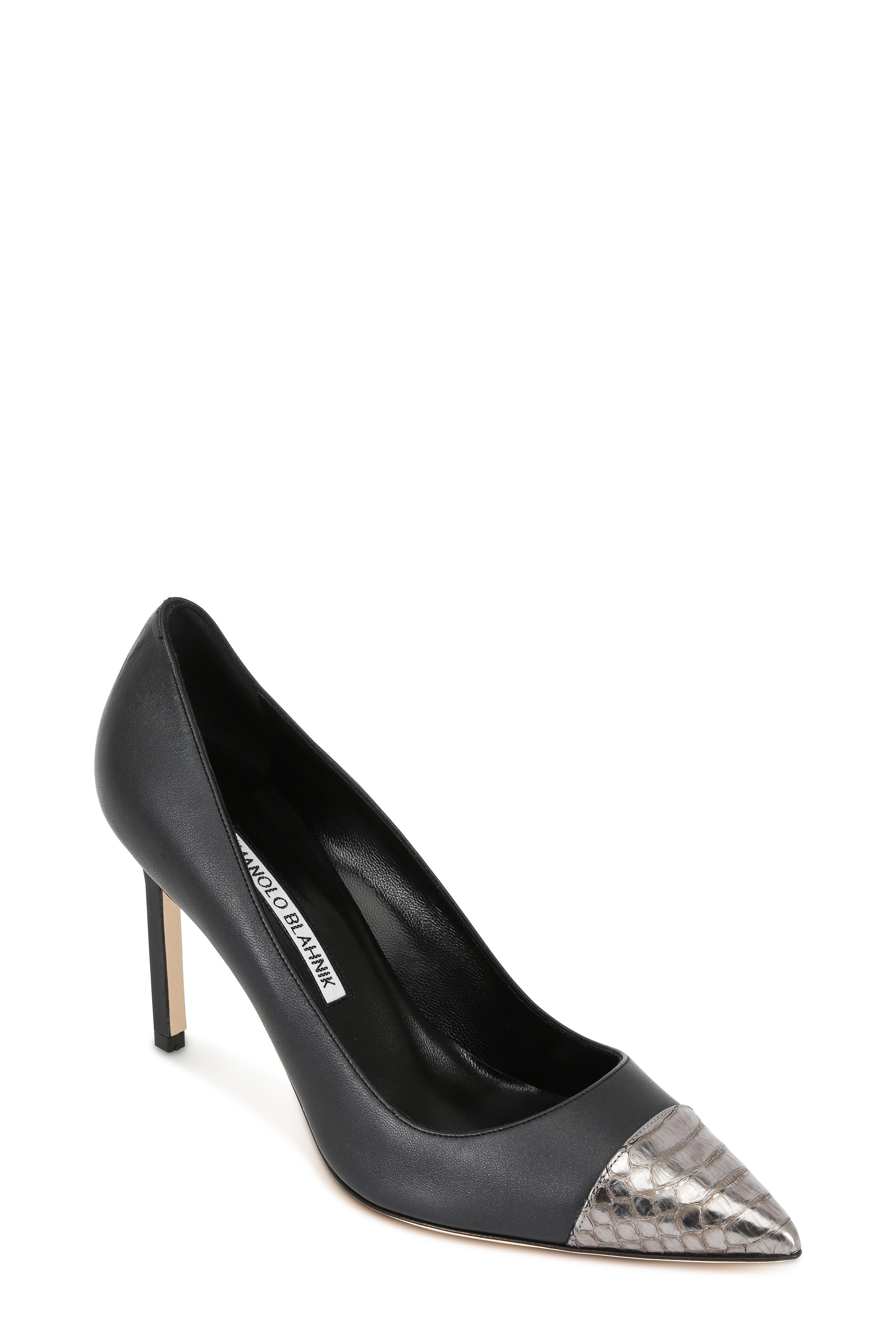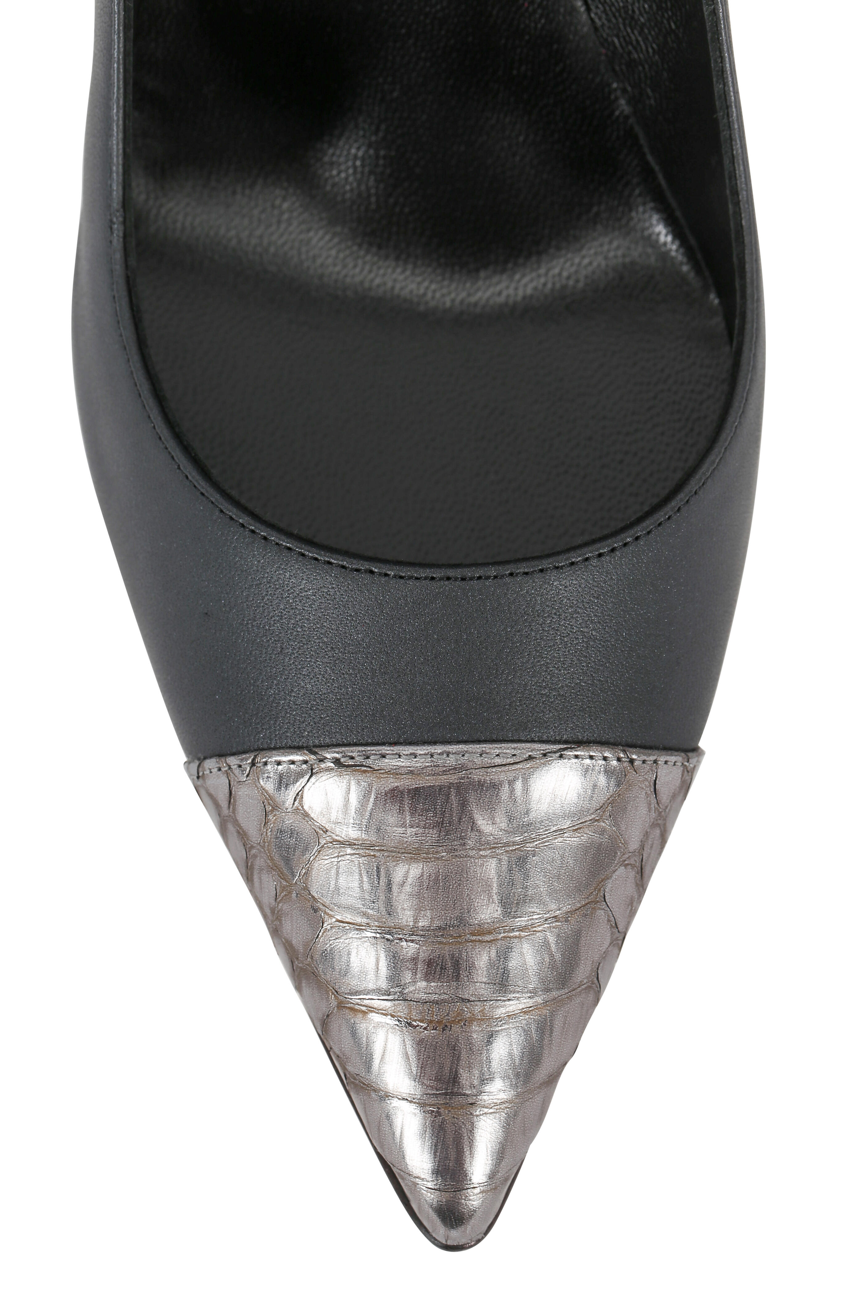Matte calfskin leather and snakeskin. Gunmetal snakeskin po9inted cap-toe. Leather lining and insole. Self covered heel. Leather sole. Made in Italy. Heel measurement: 90mm (3 ½").