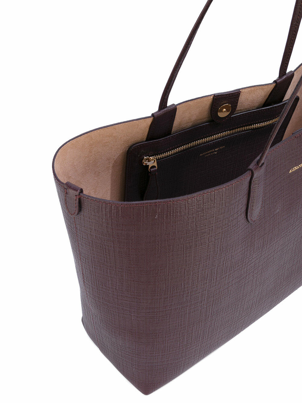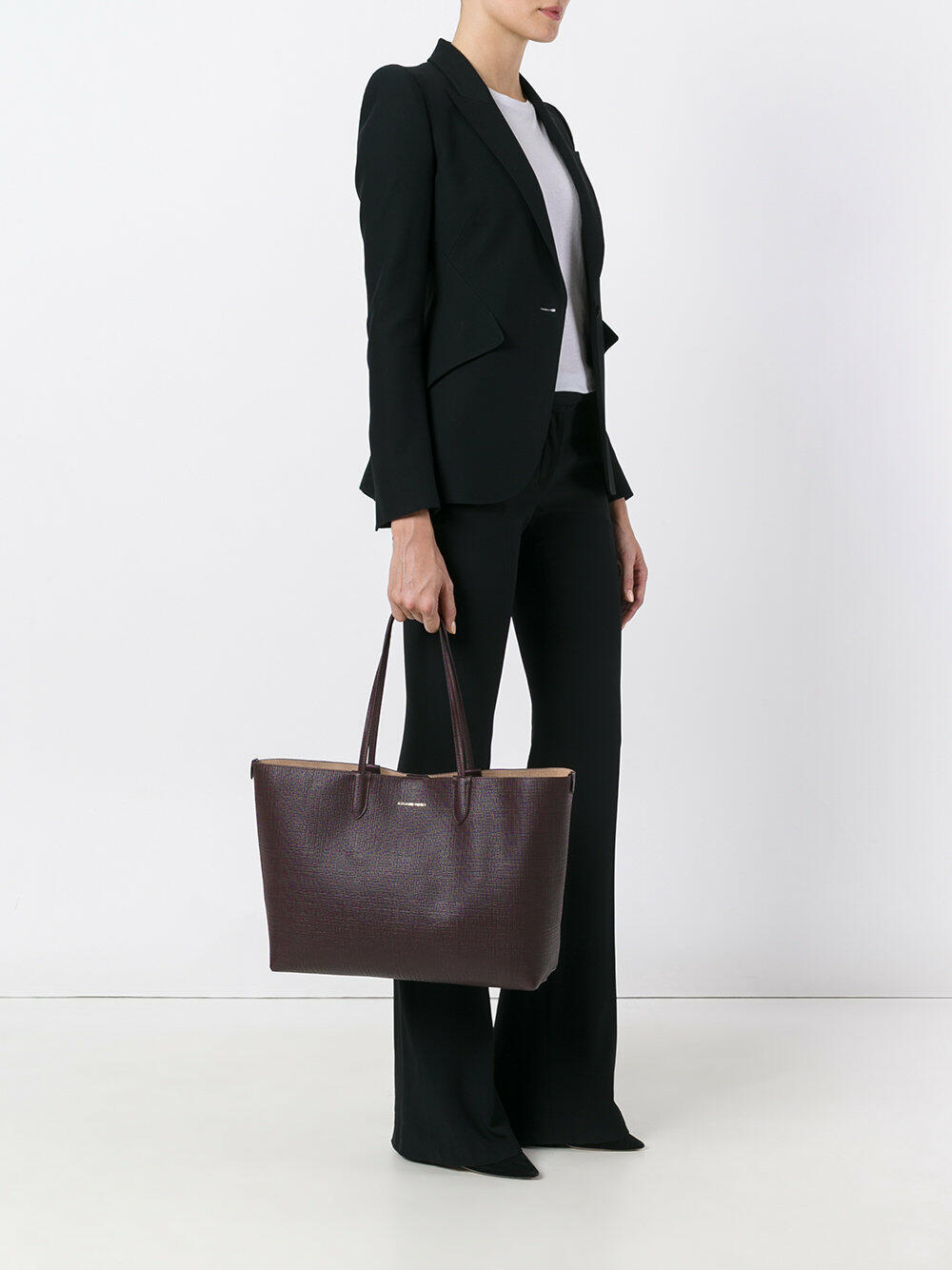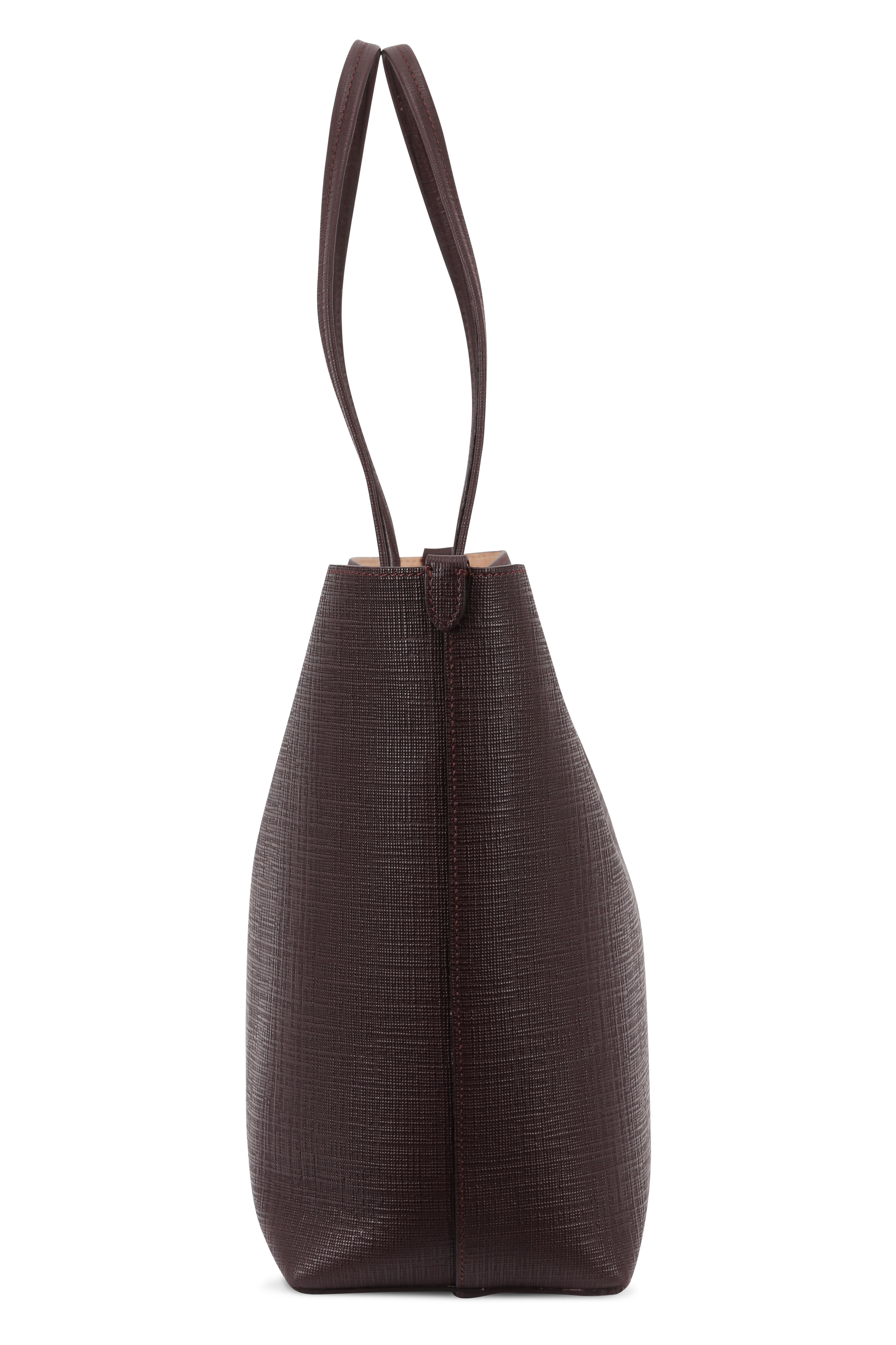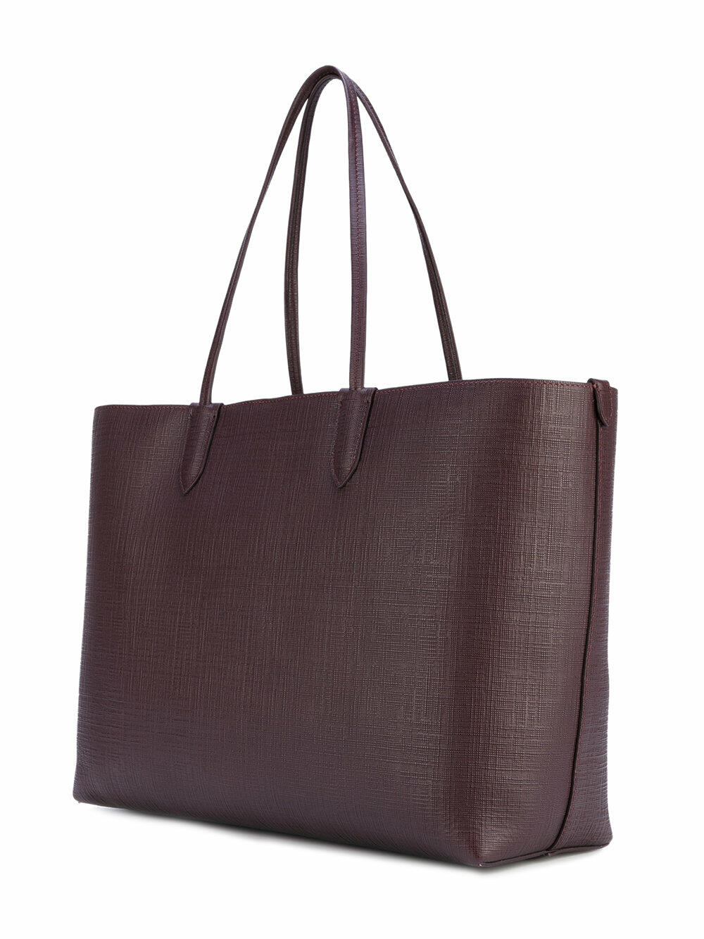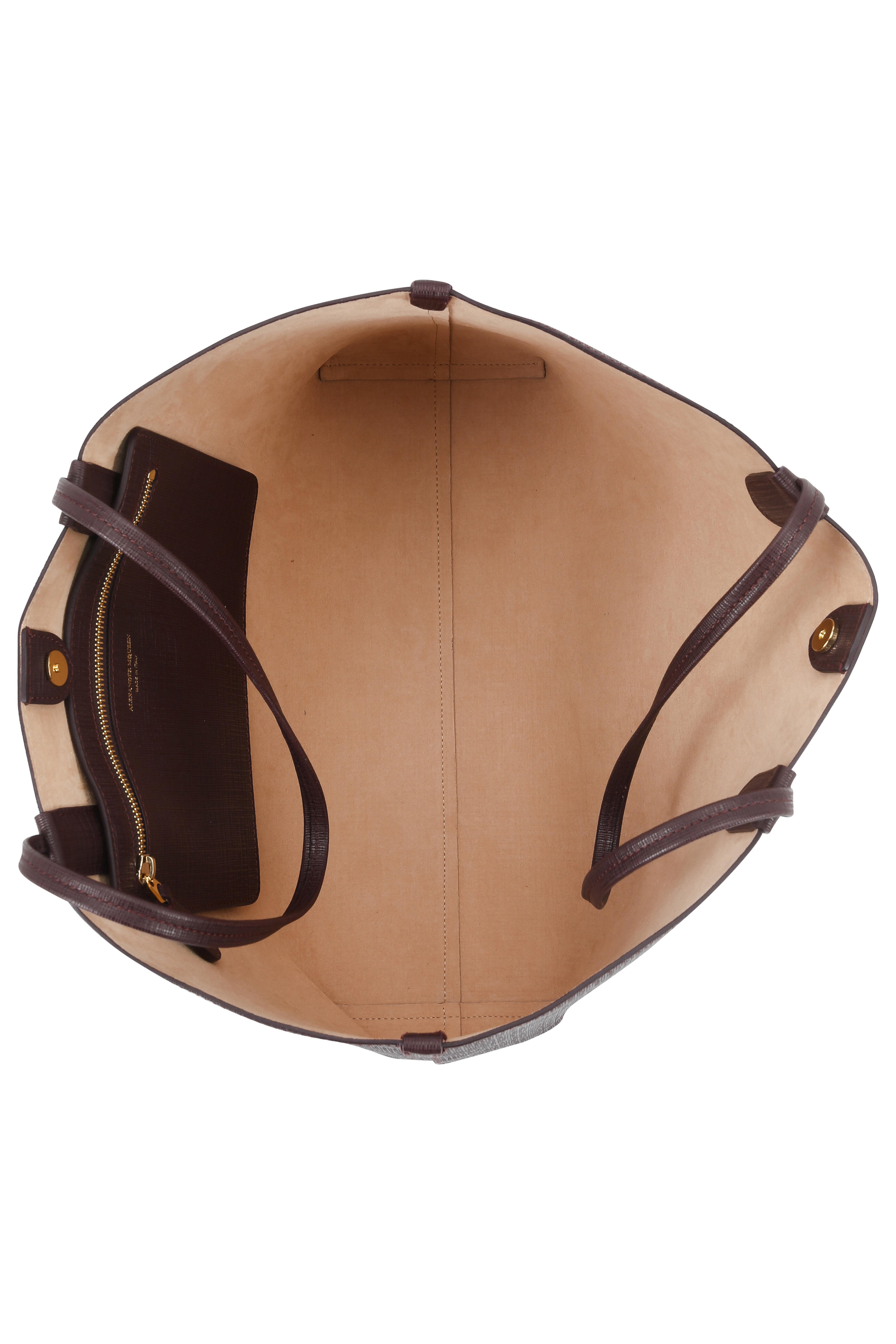 Metallic textured calfskin leather. Dual flat straps. Center snap closure. Interior detachable zip pouch pocket. Lined in suede. Made in Italy. Width: 14". Height: 11". Depth: 5". Strap drop: 9 ½".