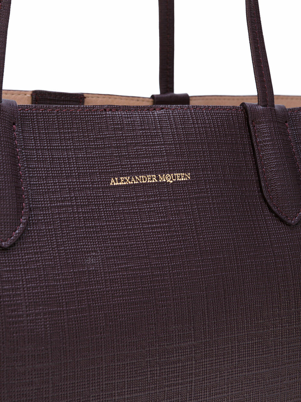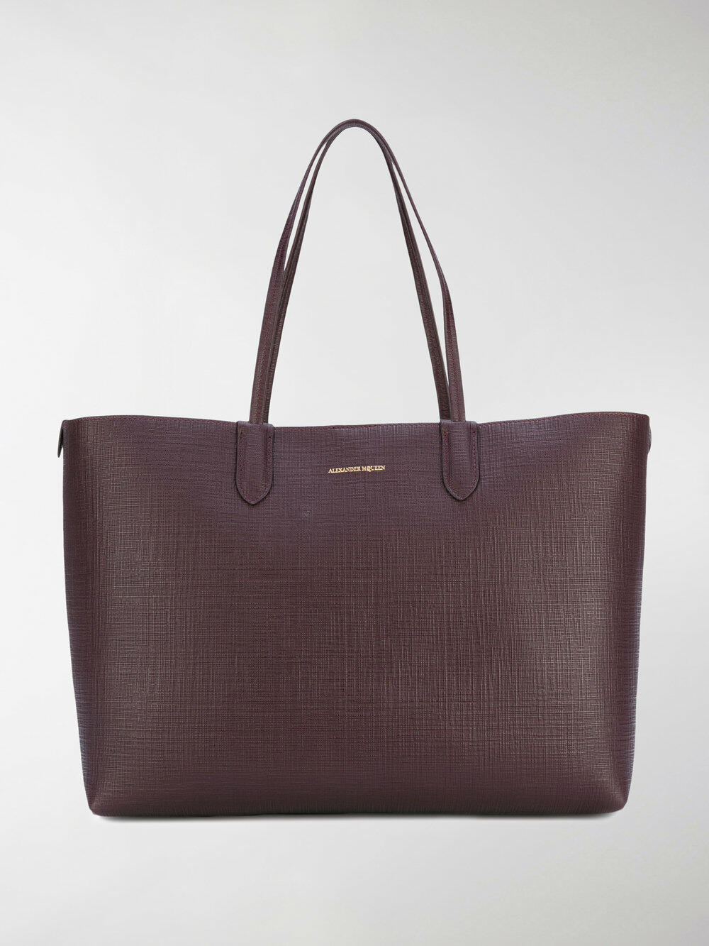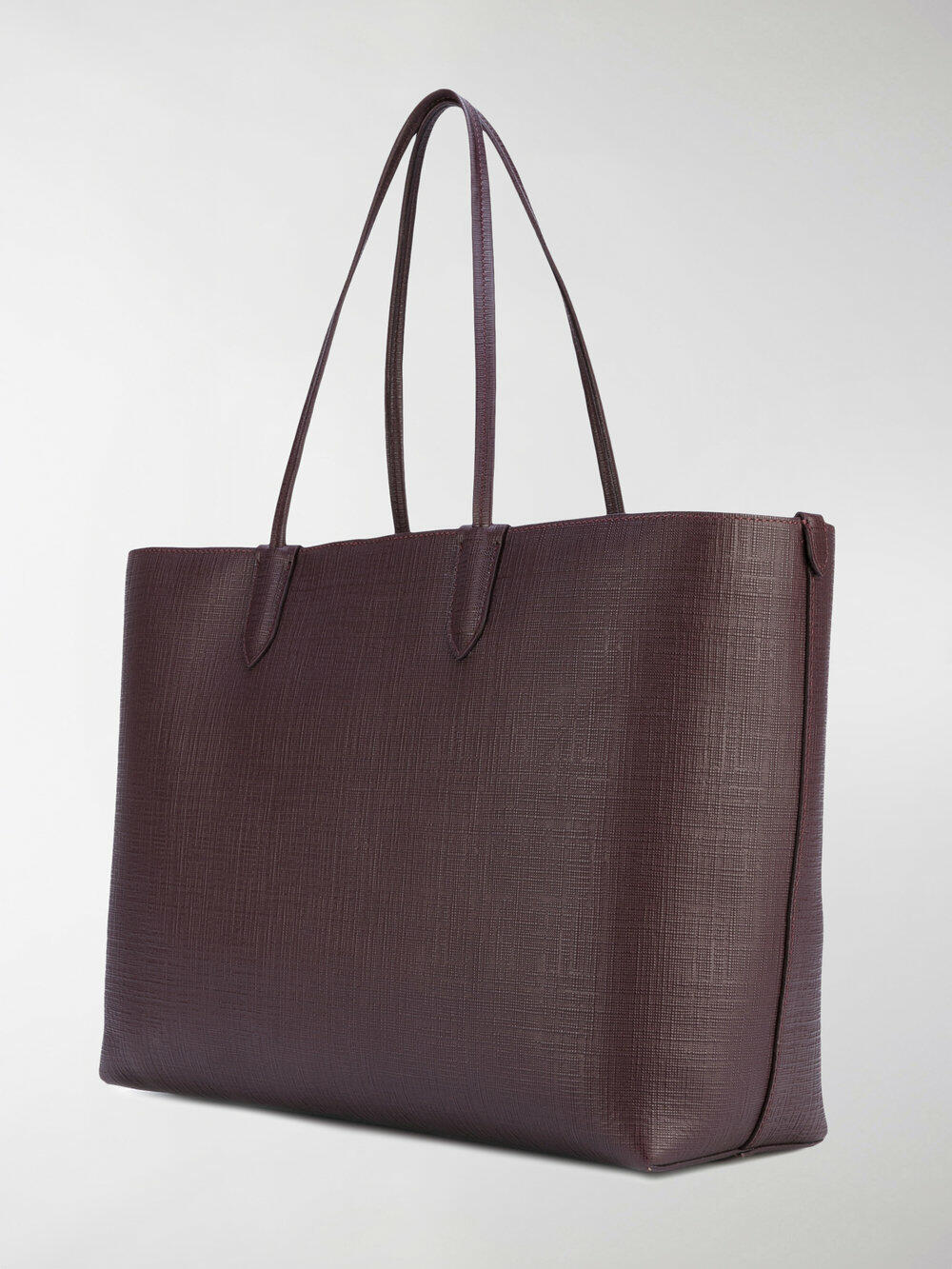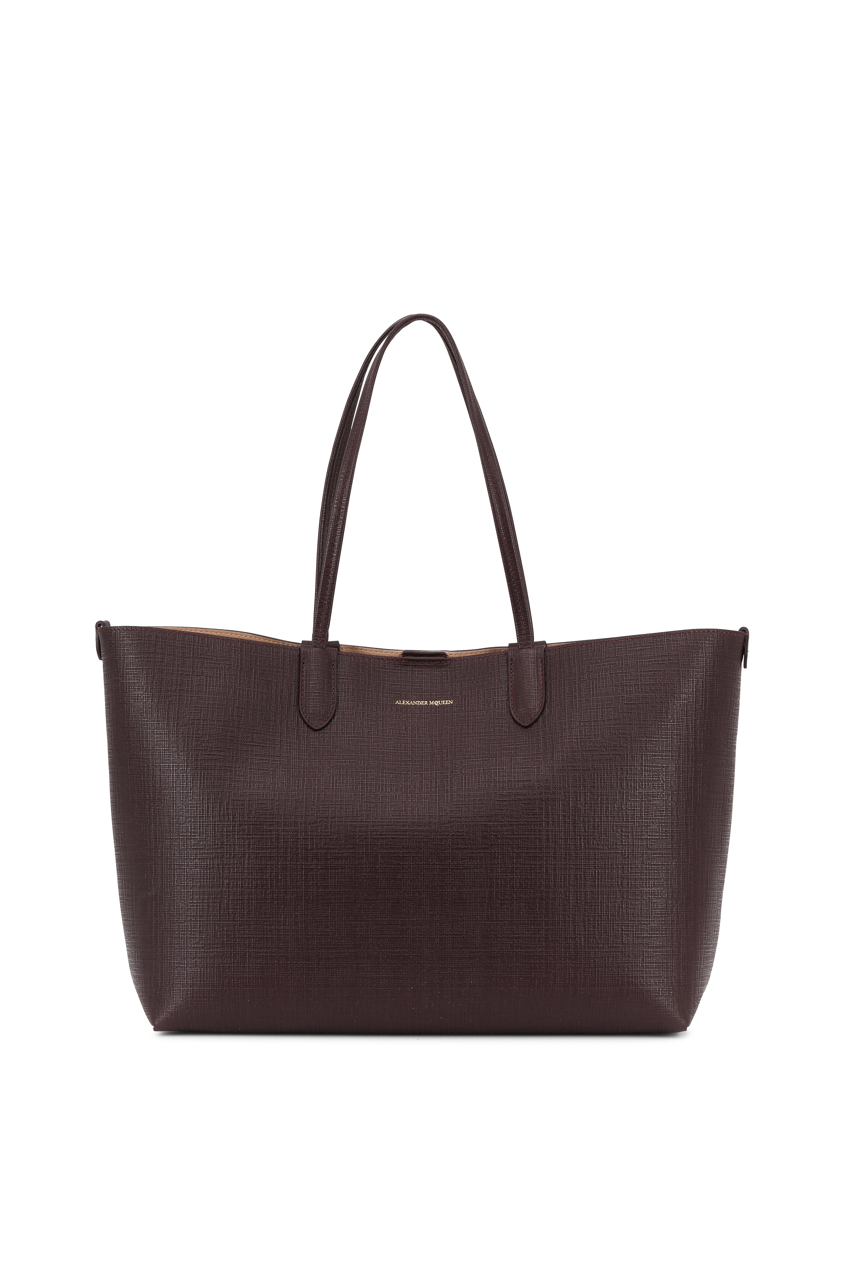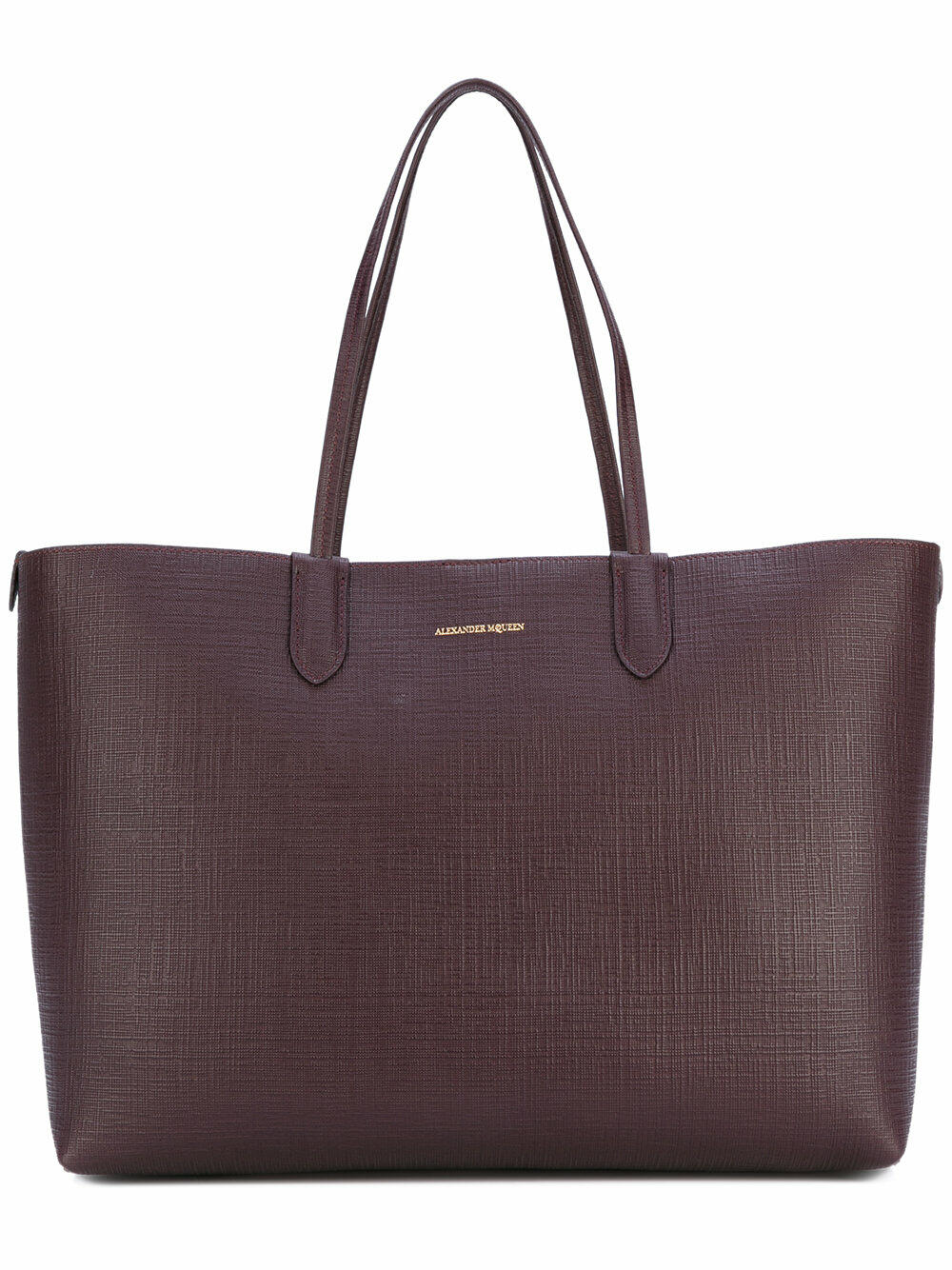 Metallic textured calfskin leather. Dual flat straps. Center snap closure. Interior detachable zip pouch pocket. Lined in suede. Made in Italy. Width: 14". Height: 11". Depth: 5". Strap drop: 9 ½".