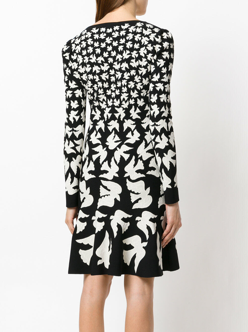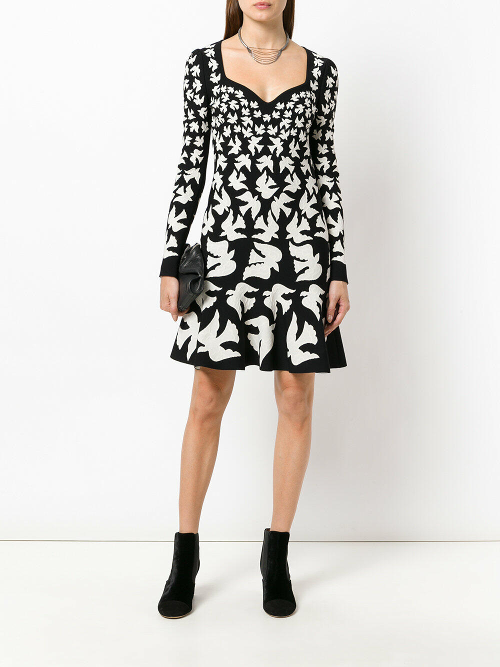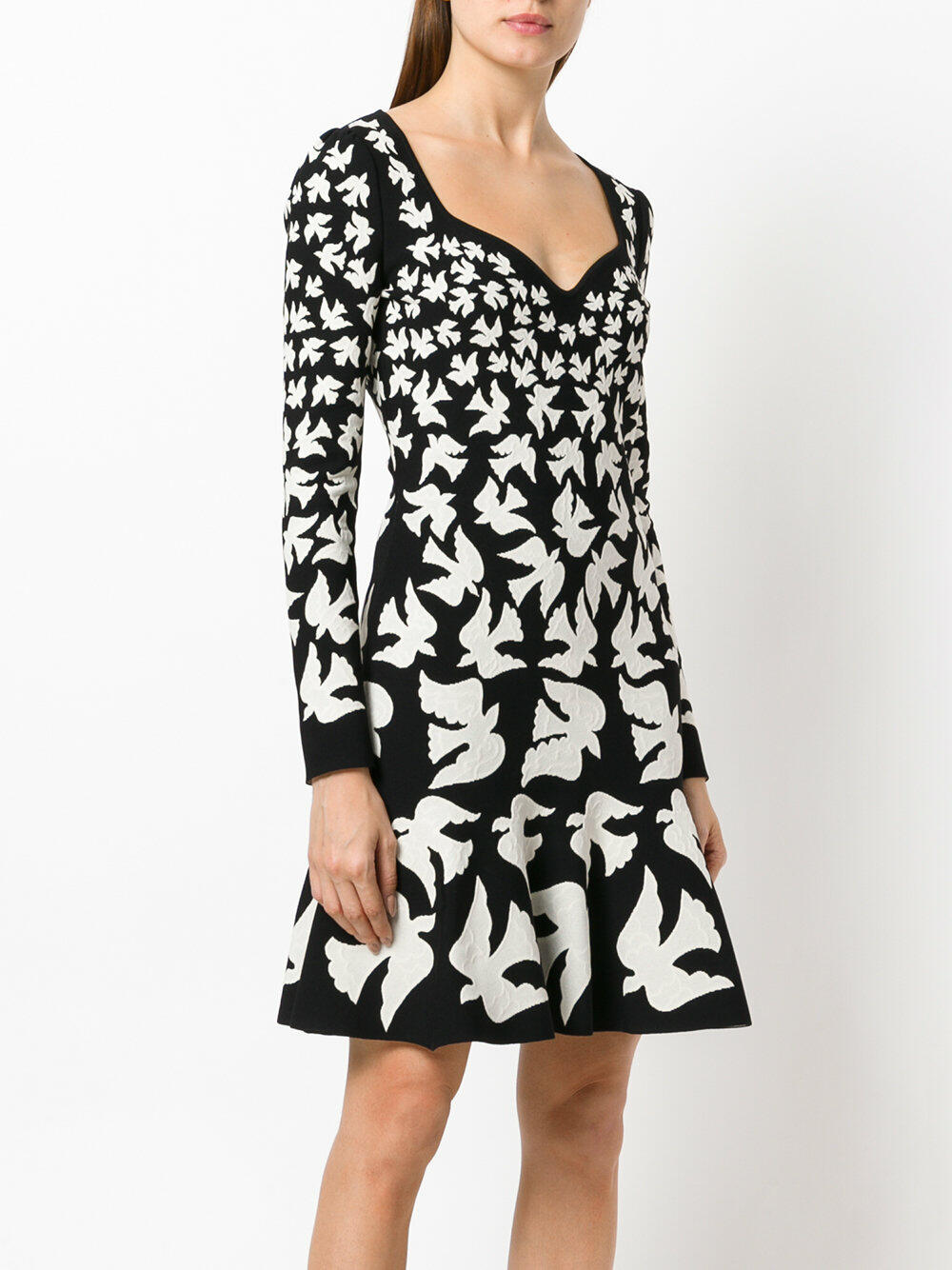 Sweetheart neckline. Pull-over styling. Nipped in at natural wasit. Ruffled hem. Made in Italy. Fit and flare silhouette. 76% viscose, 15% polyester, 7% polyamide, 2% elastane; unlined. Dry clean.