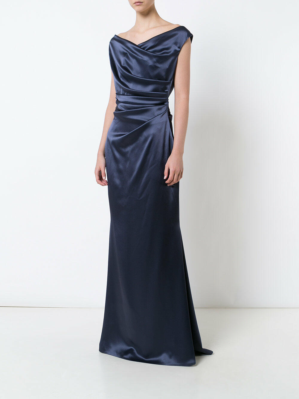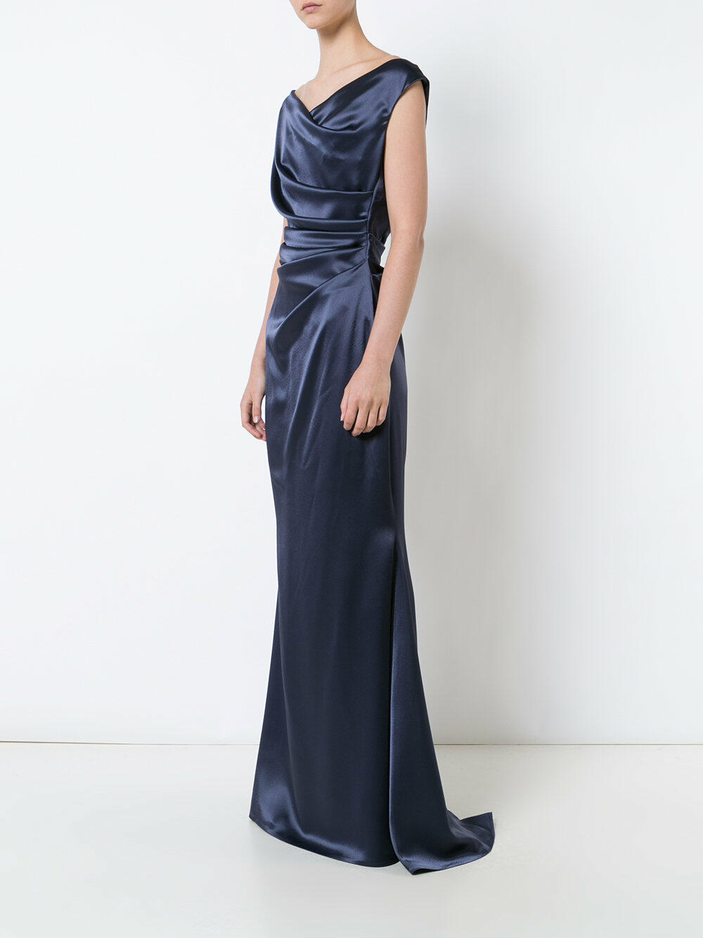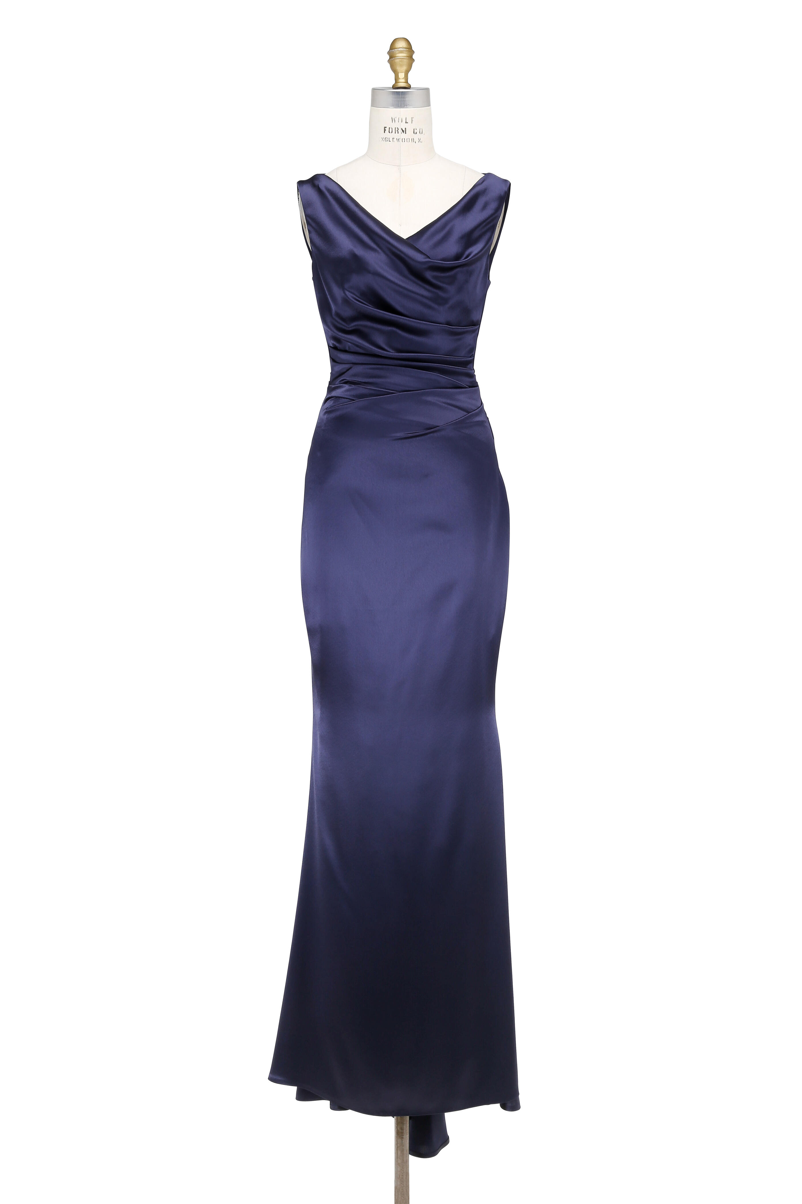 Surplice neckline. Concealed back zip closure. Ruching and draping detail. Godet train at back. Imported. Fitted sihouette. 80% triacetate, 20% polyester; fully lined. Dry clean.