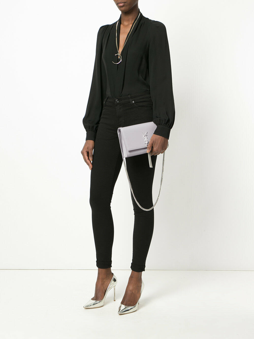 Calfskin leather. Silver-toned chain strap. Flap front with snap closure. Silver-toned YSL logo and chain tassel detail. One interior slot pocket. Fully lined. Made in Italy. Width: 9 ½". Height: 6". Depth: 2". Strap drop: 22".