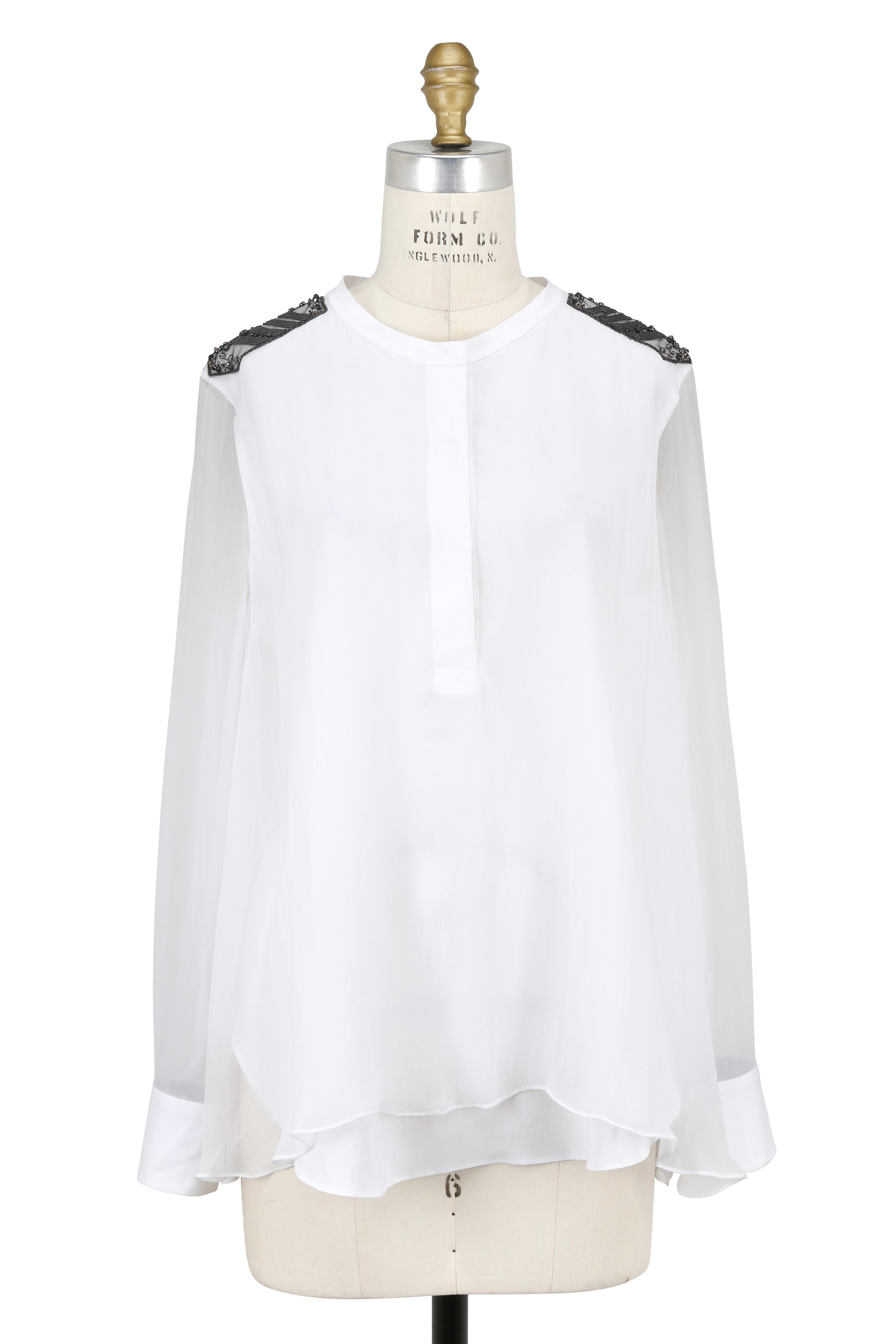White Silk Chiffon Monili Epaulette Henley Blouse