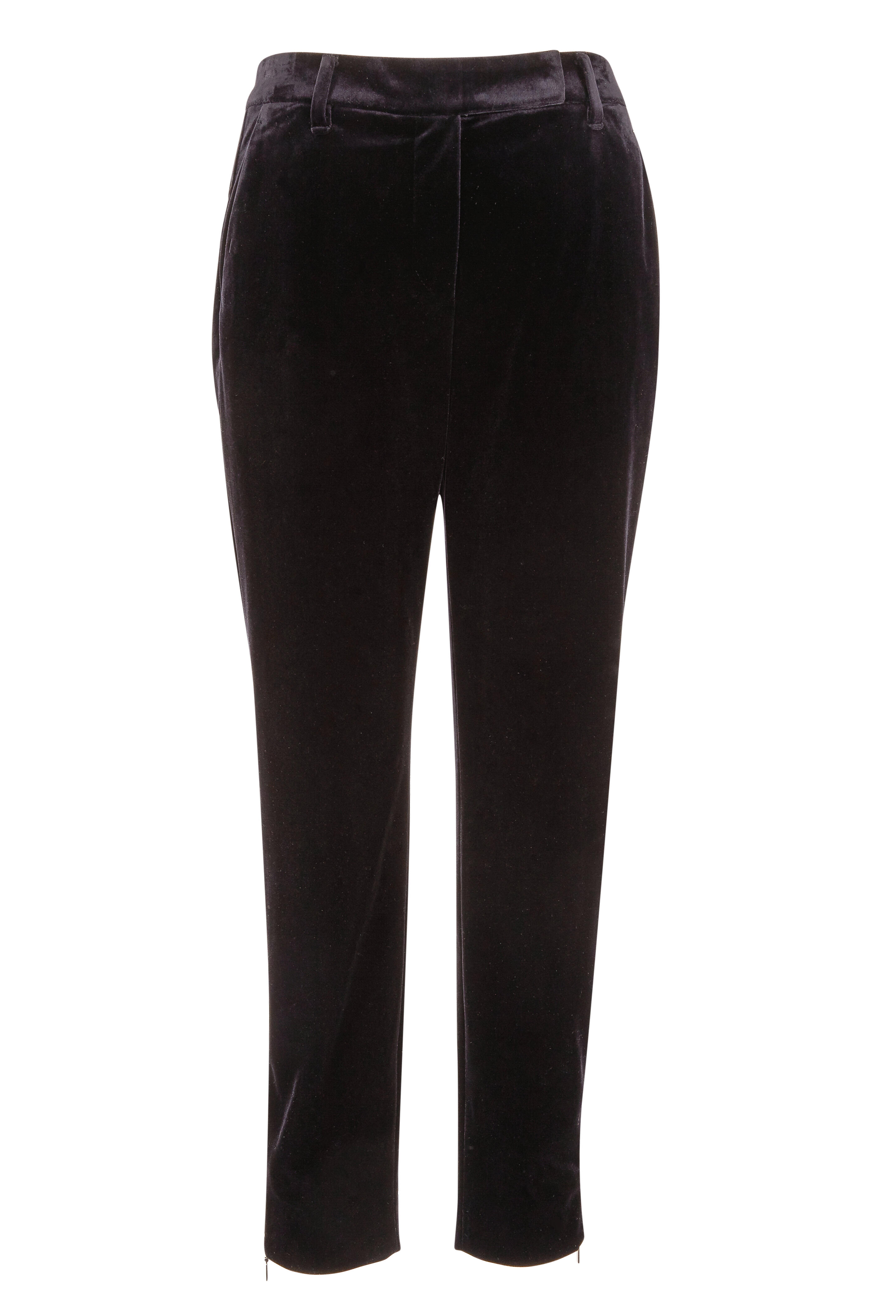 Banded waist; belt loops. Side slash pockets. Zips at cuffs. Made in Italy. Inseam: 27". 78% tricacete, 22% polyester. Dry clean.