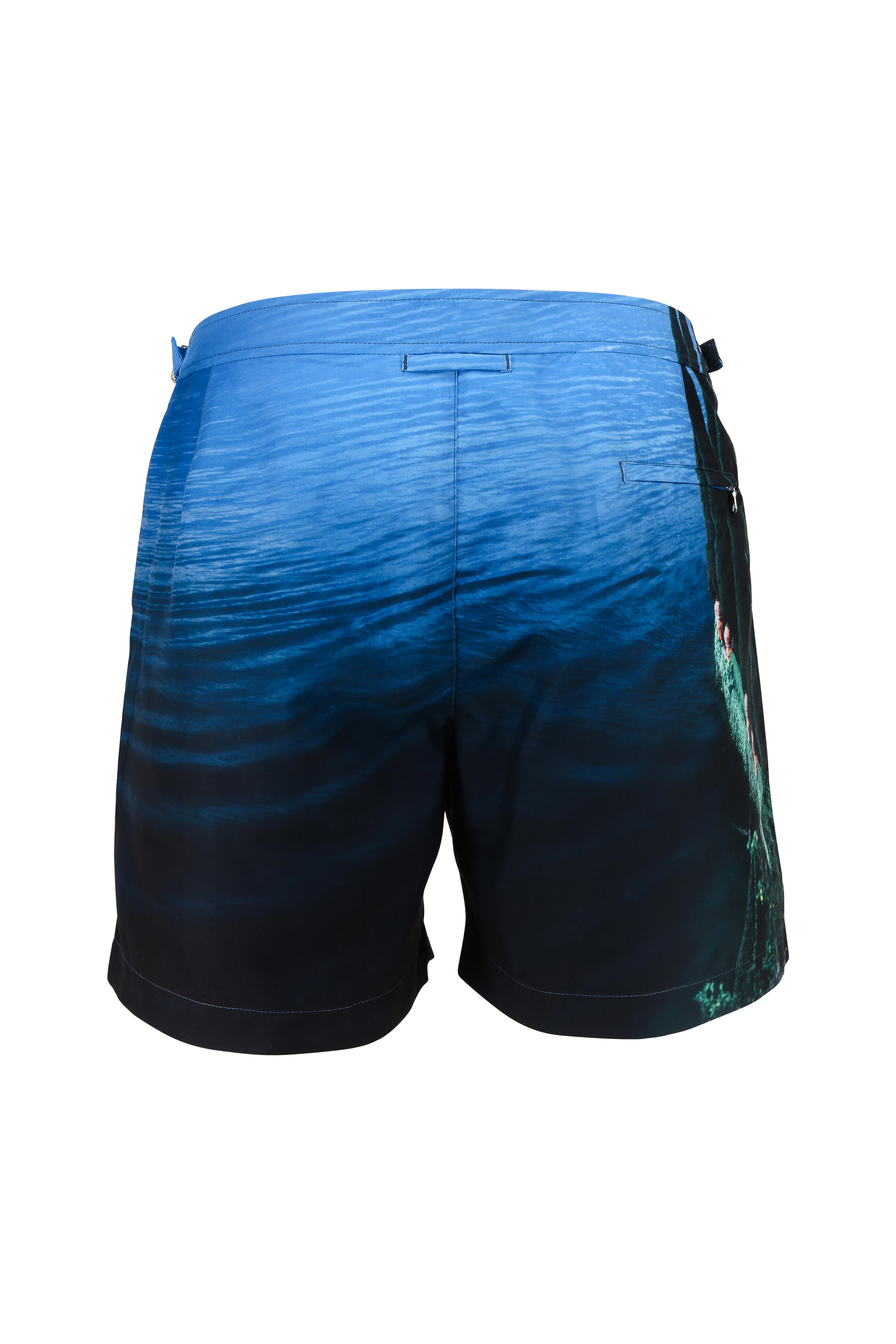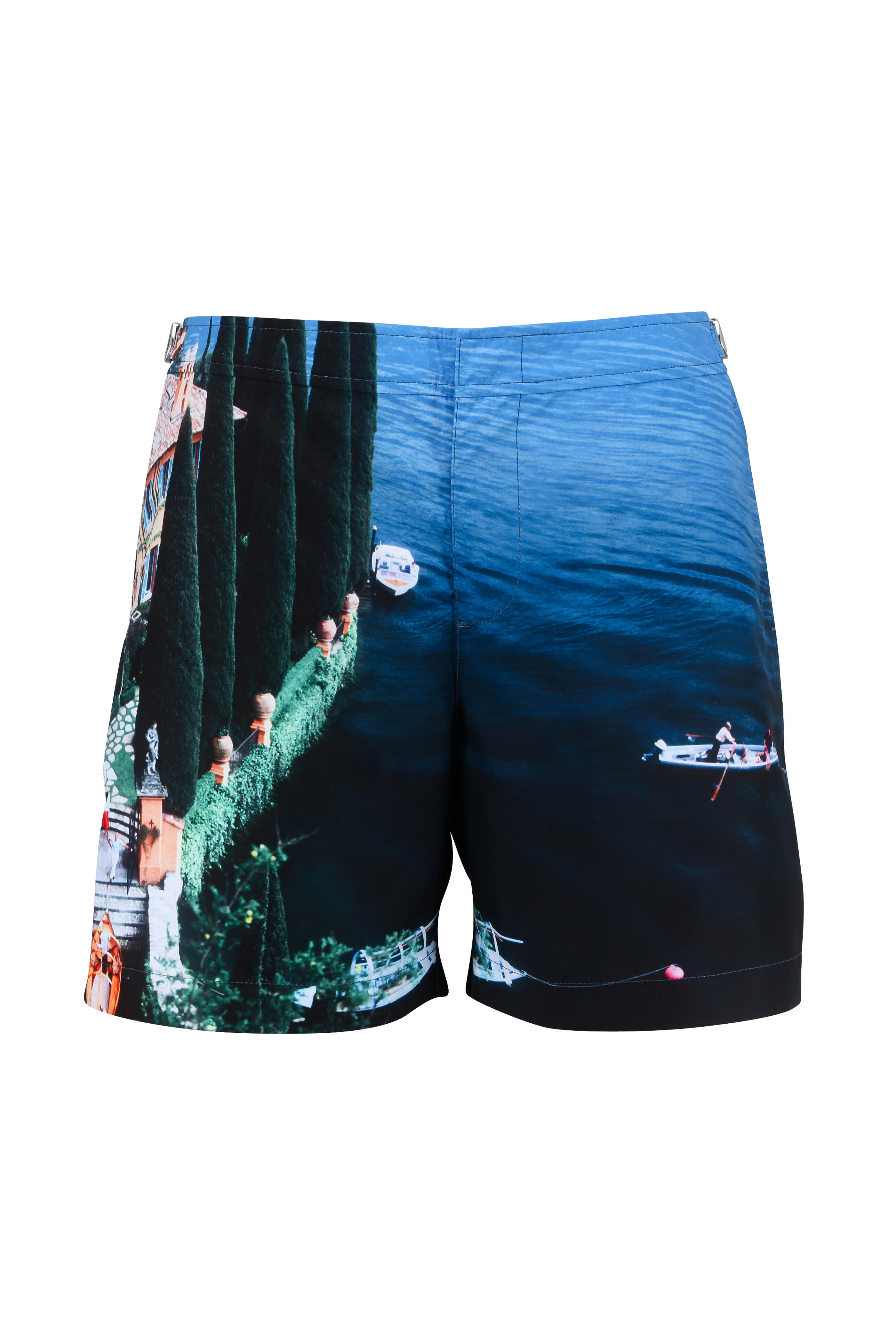 Exclusive to Mitchells Stores! Orlebar Brown's tonal-blue brushed-fabric Bulldog swim shorts are part of the label's OB Editions collection. They feature a colorful Mario Lake Como photographic print – originally taken by Slim Aarons.