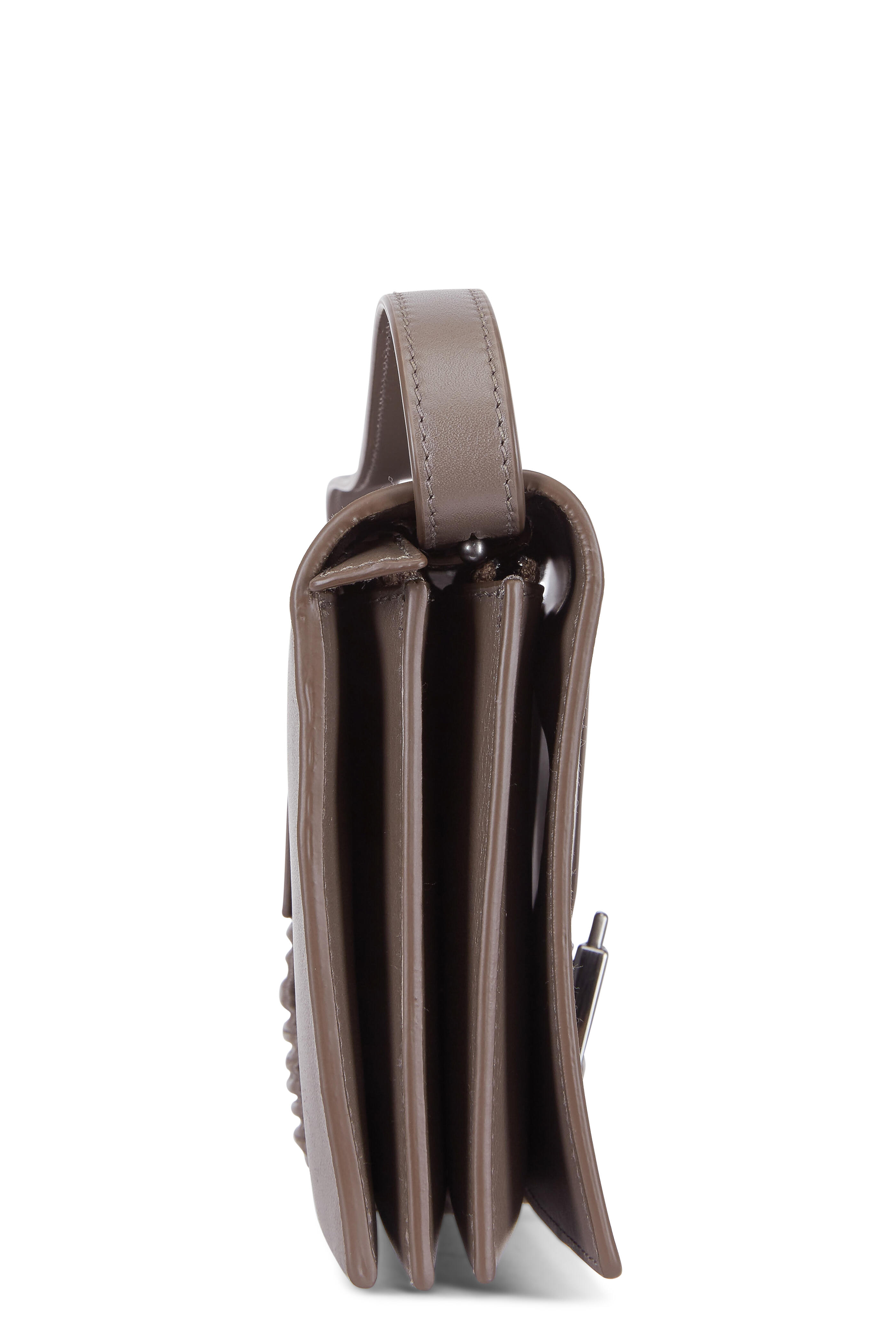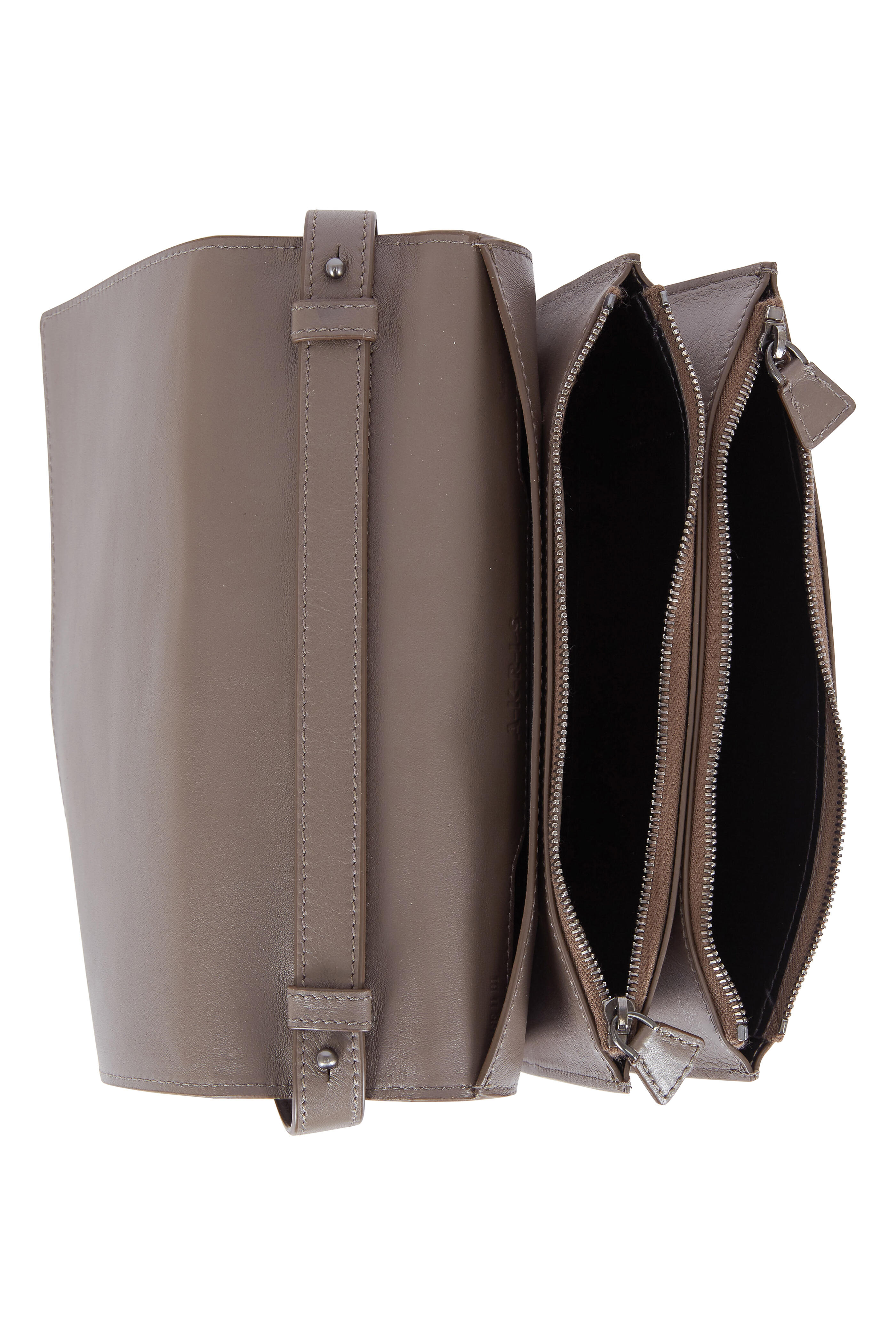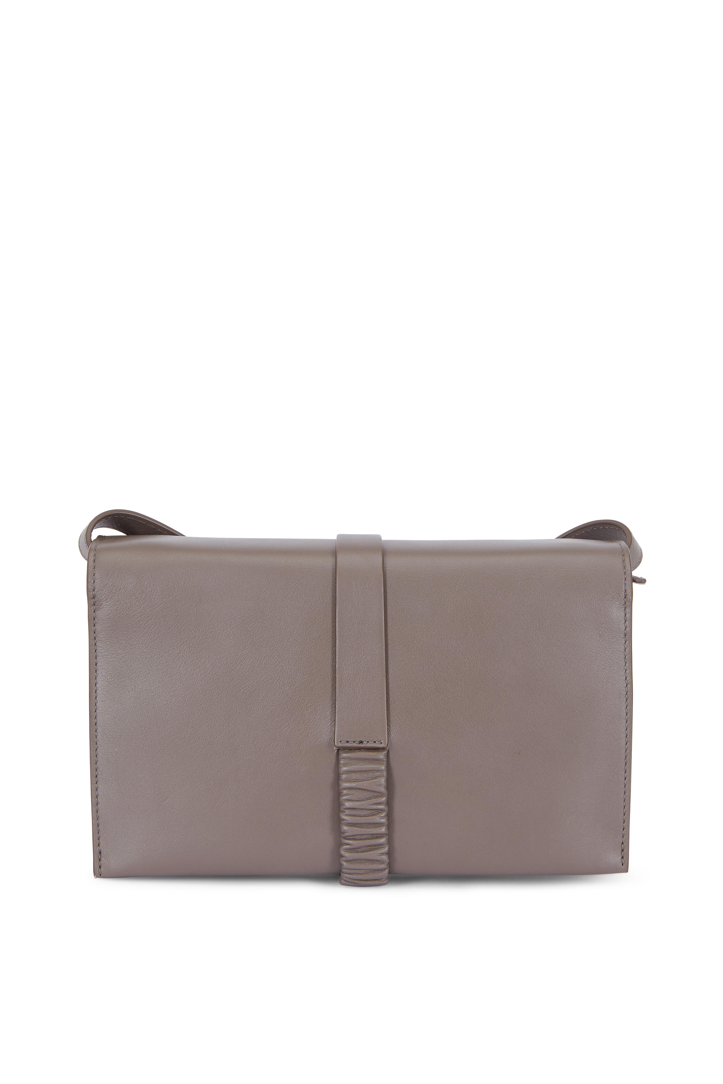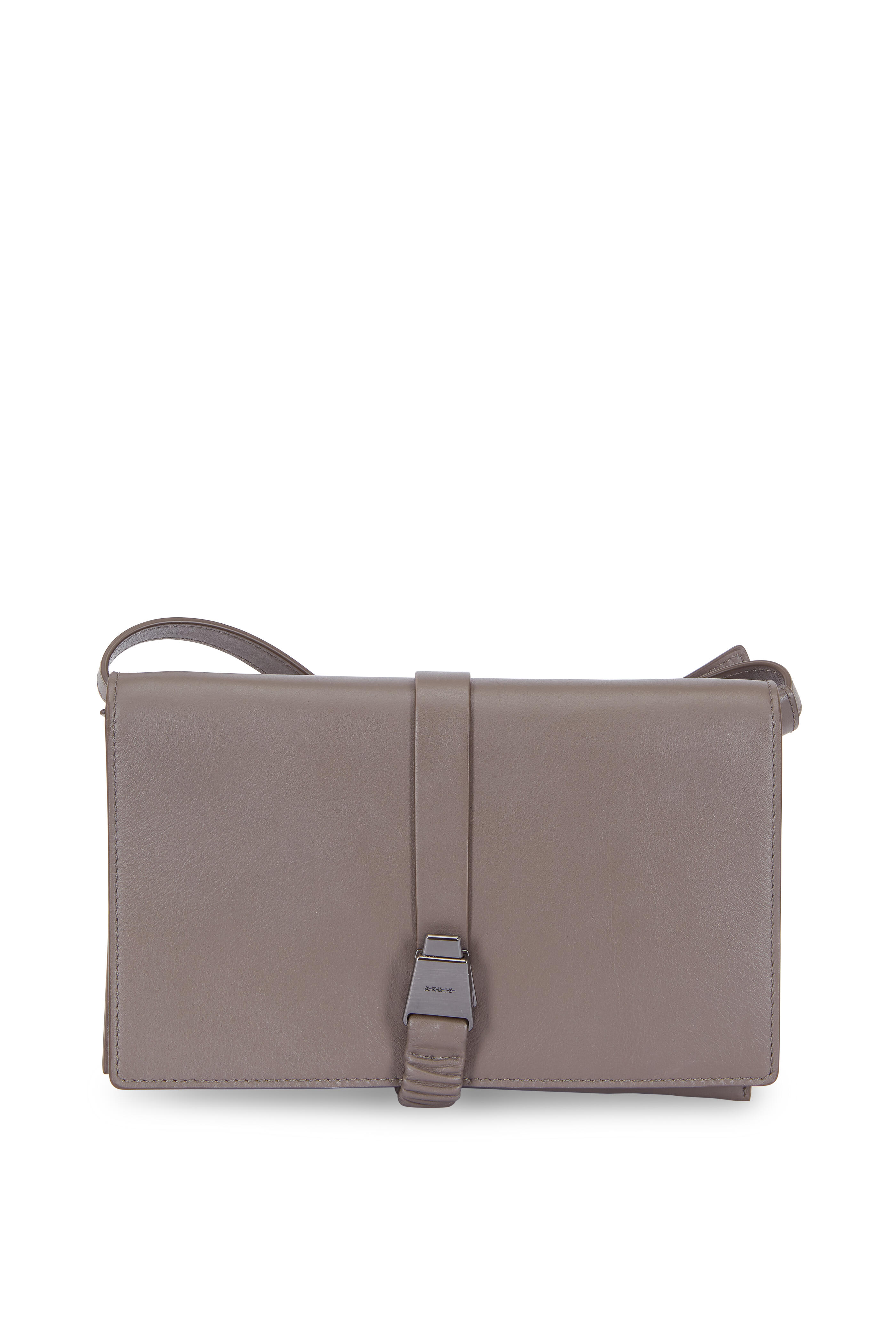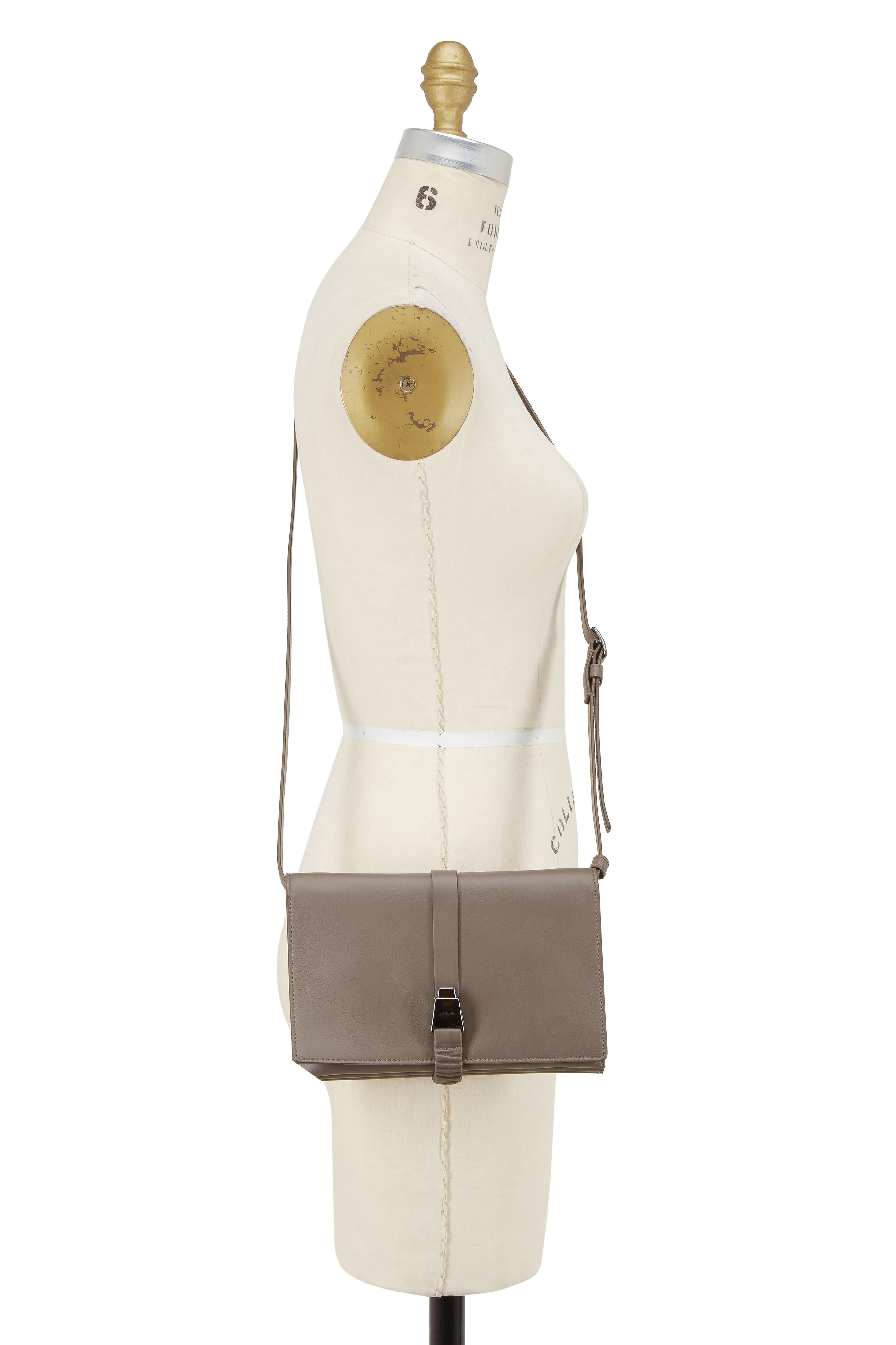 Calfskin leather. Detachable and adjustable strap. Flap front; elasticized tab with push-lock closure. Two interior zip compartments; one open compartment and four card slots. Lined in leather. Imported. Width: 9". Height: 5 ½". Depth: 2". Strap drop: 21".