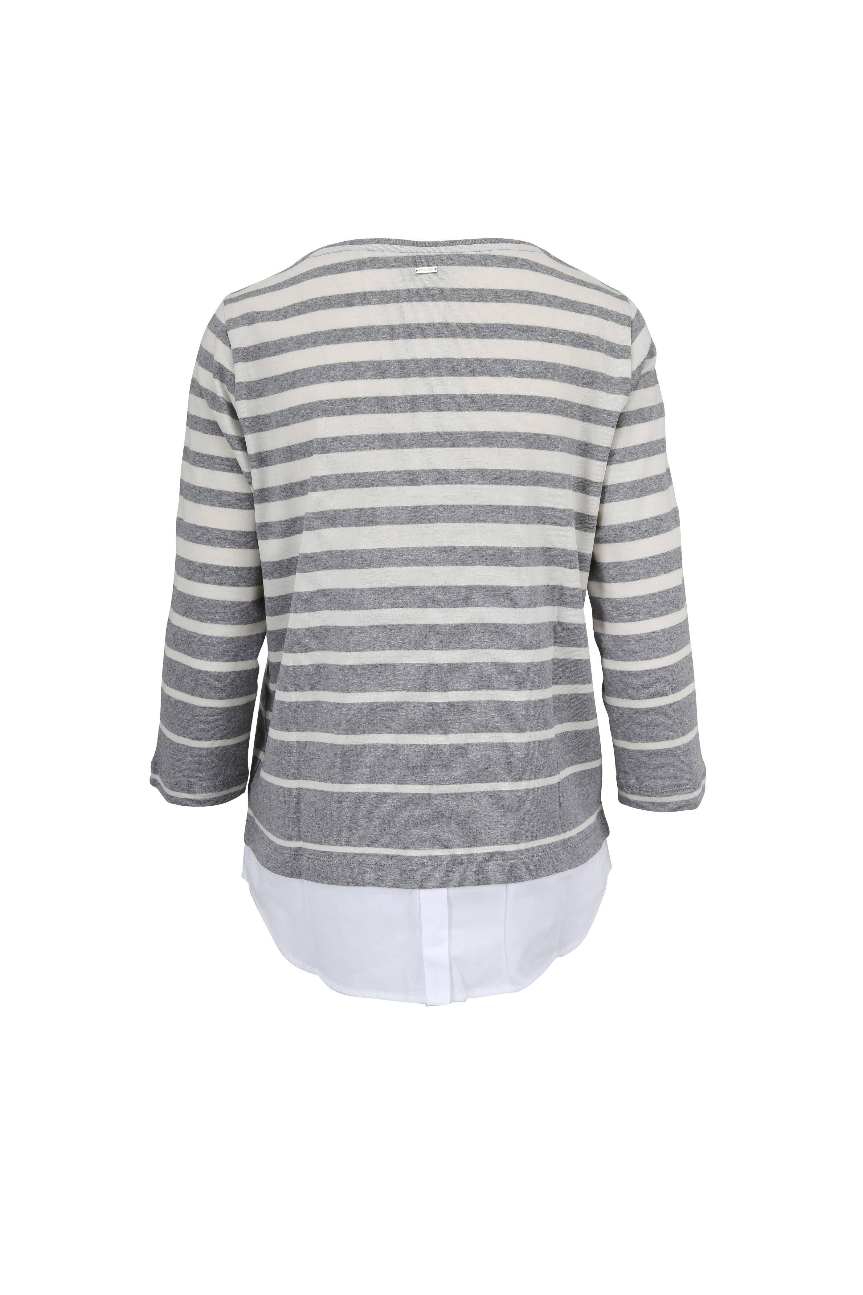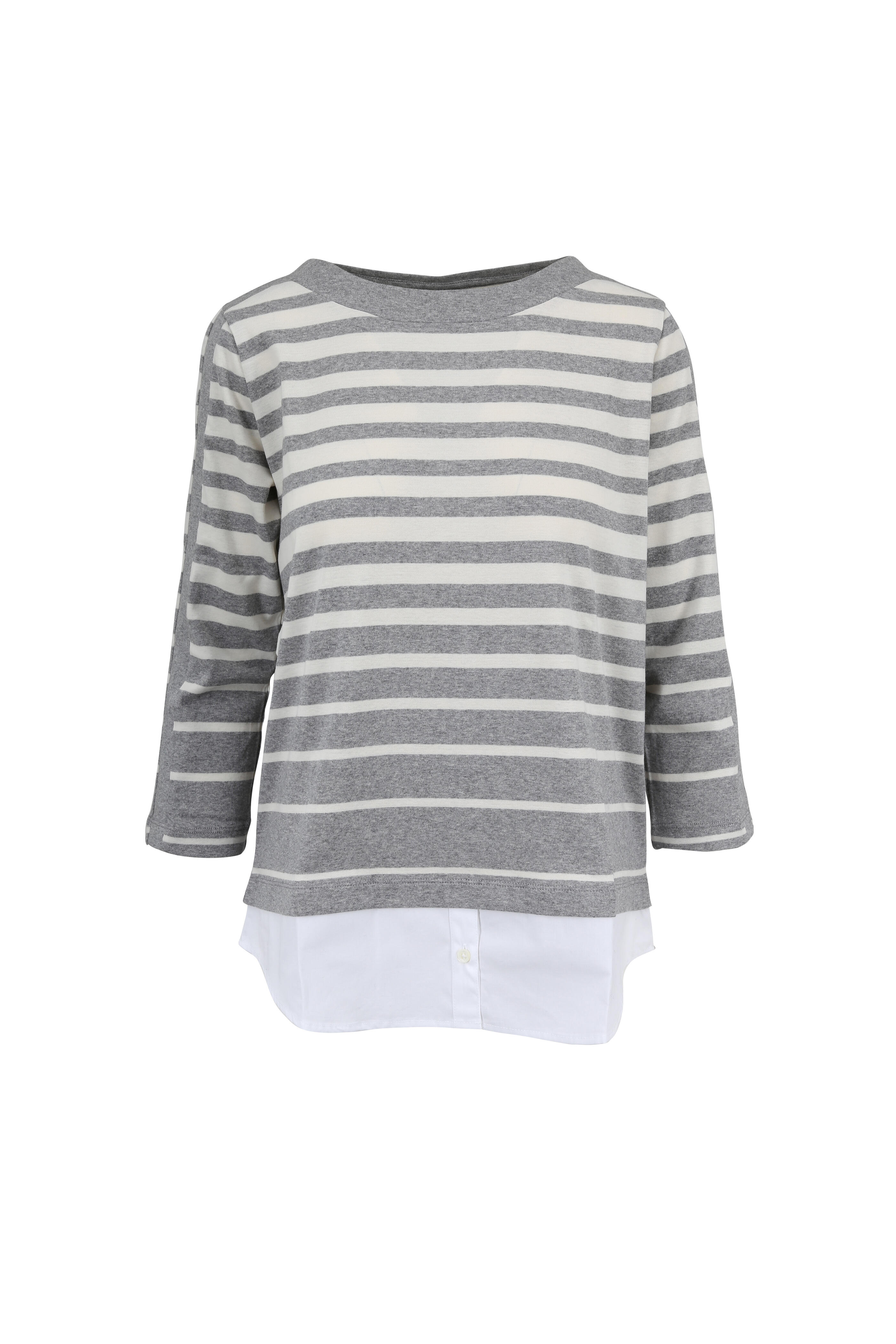 Boat neckline. Three-quarter sleeves. White poplin hem. Imported. 100% cotton. Machine wash.
