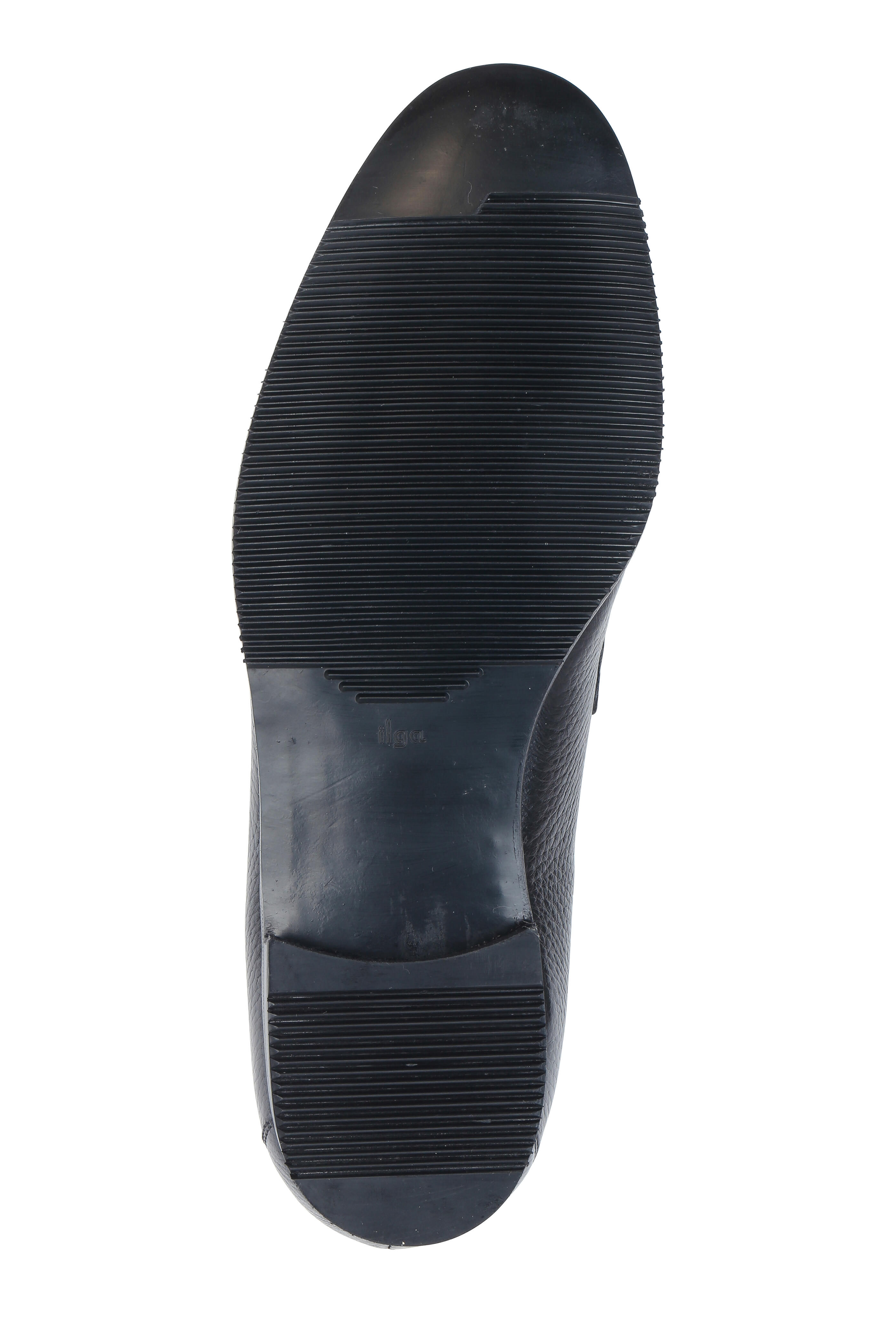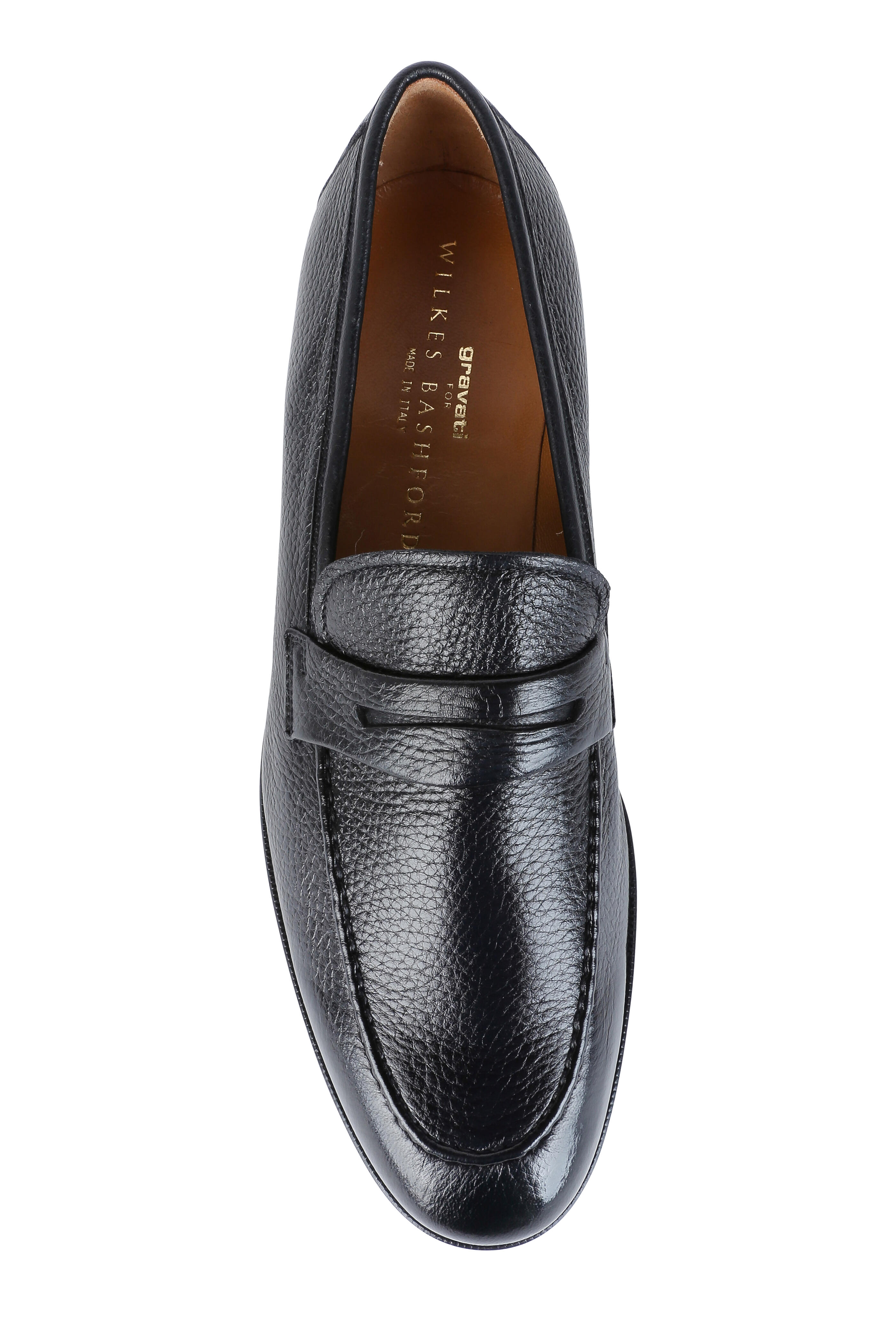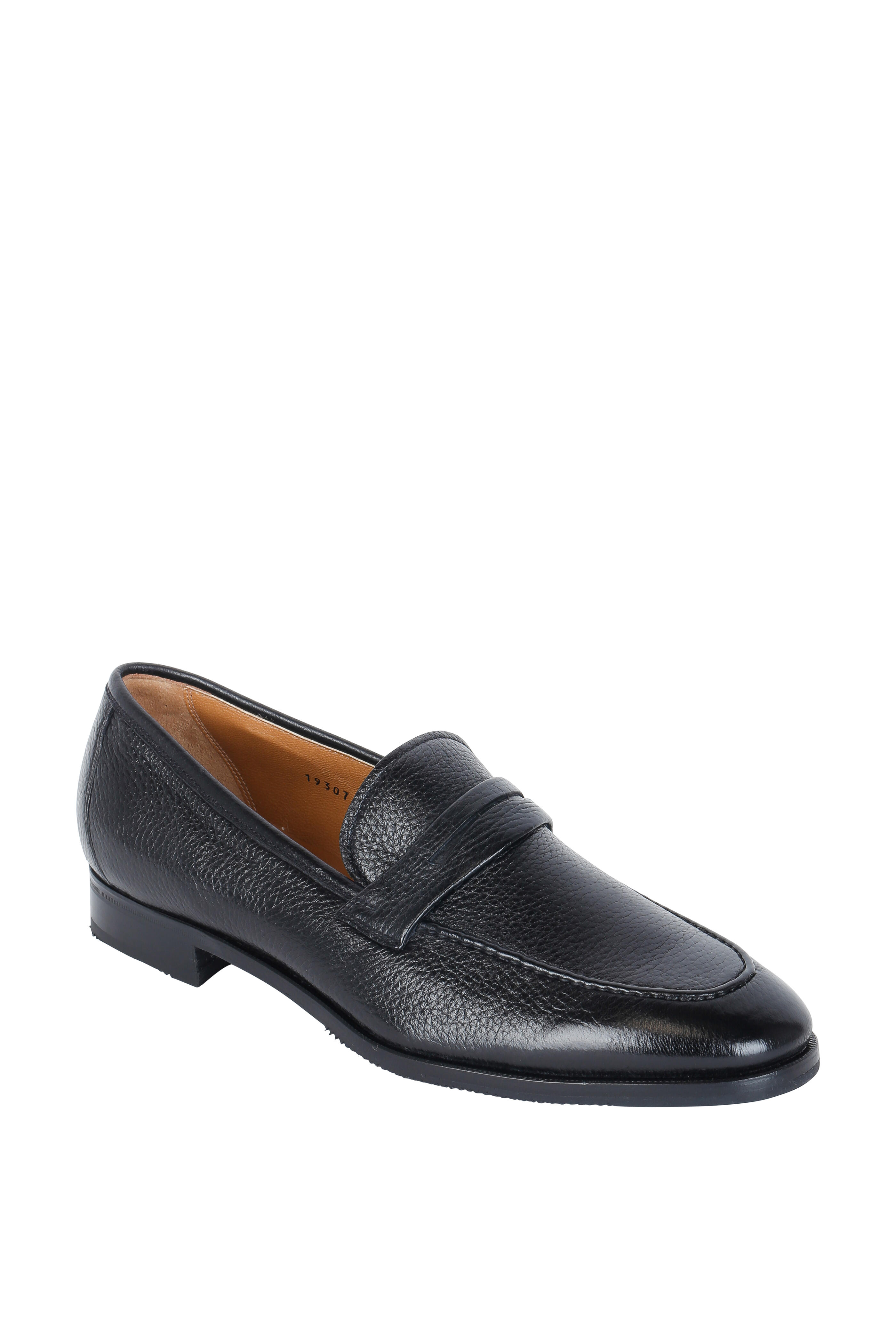 Pebbled deerskin leather. Apron toe. Penny strap across vamp. Leather lining and insole. Stacked wooden heel. Rubber sole. Made in Italy.