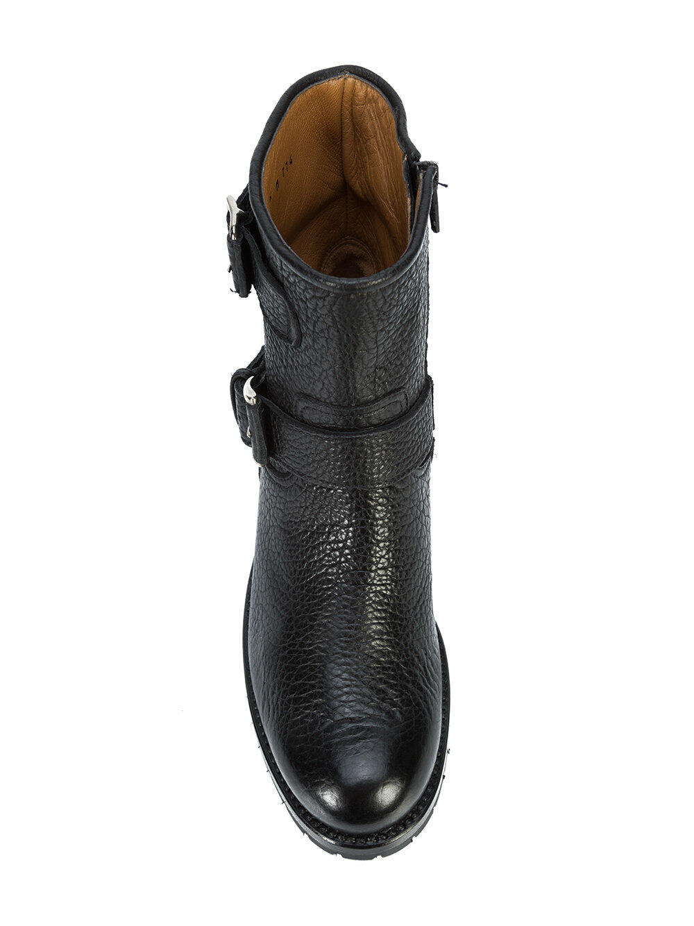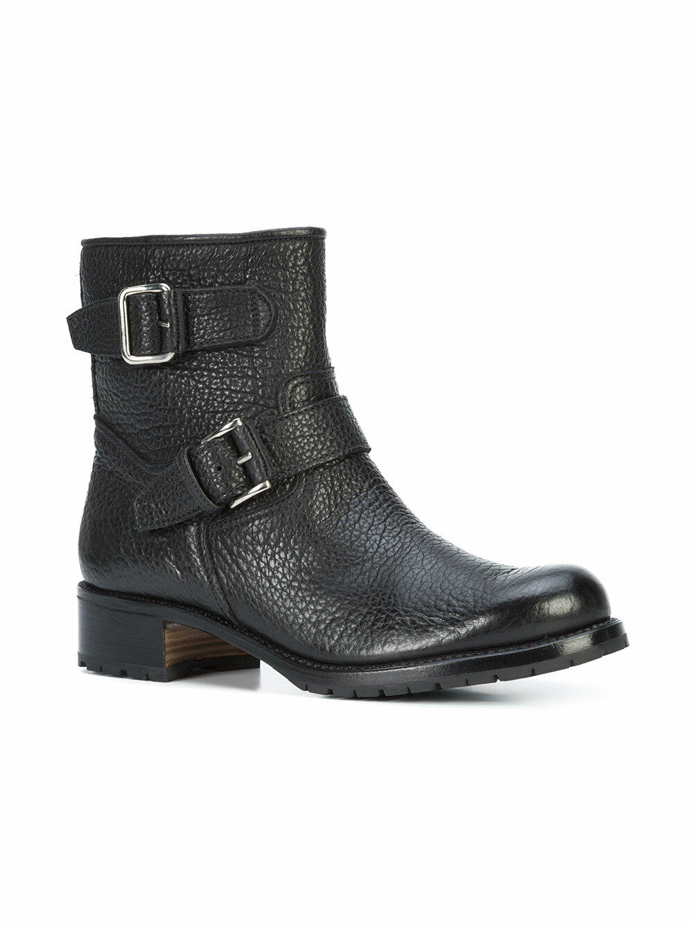 Bison leather upper. Round toe. Side zip closure. Double strap with adjustable buckles. Leather lining and insole. Stacked wooden heel. Vibram® lug rubber sole. Made in Italy. Heel measurement: 25mm (1"). Shaft: 6".