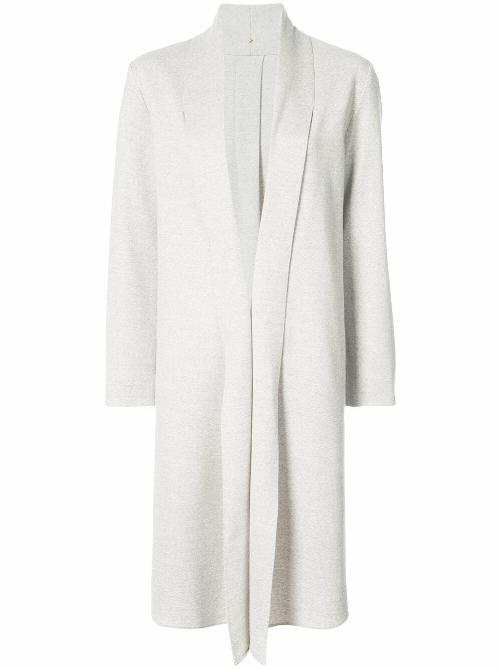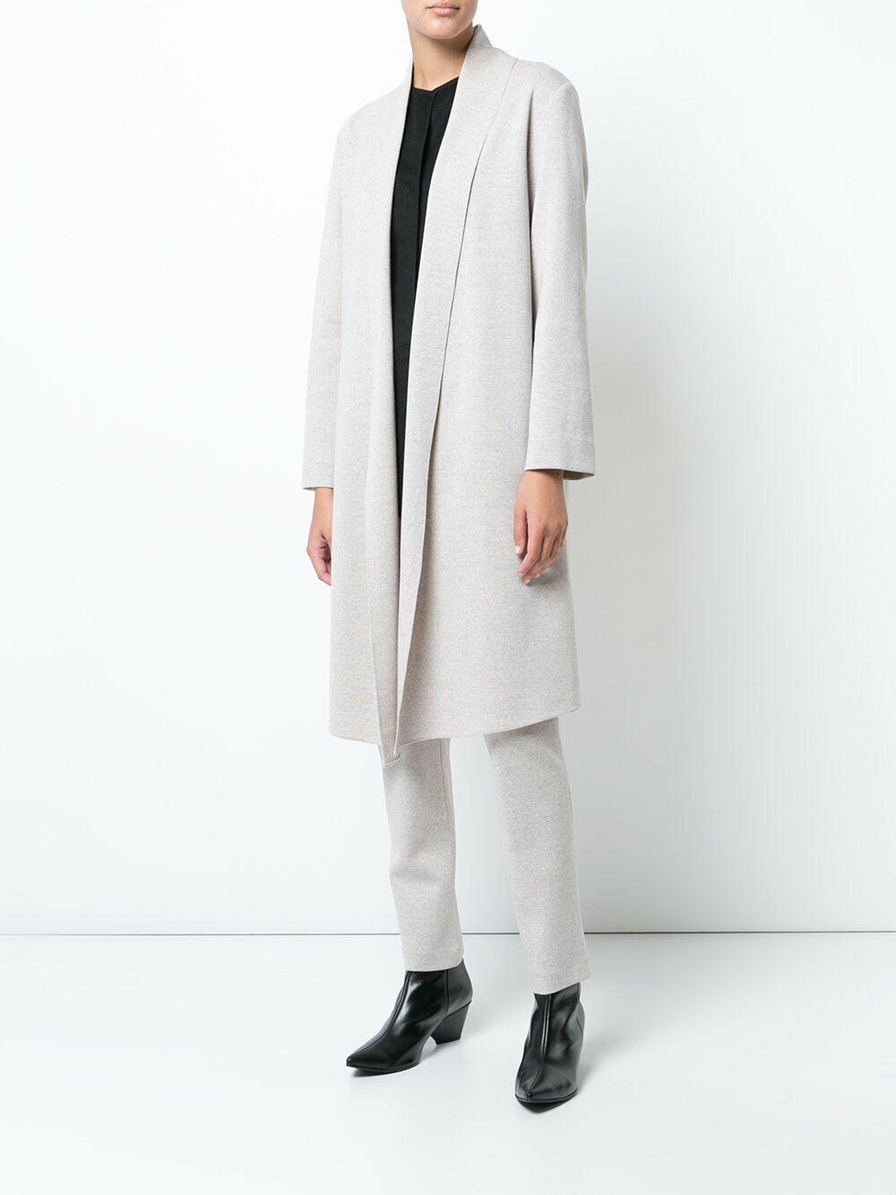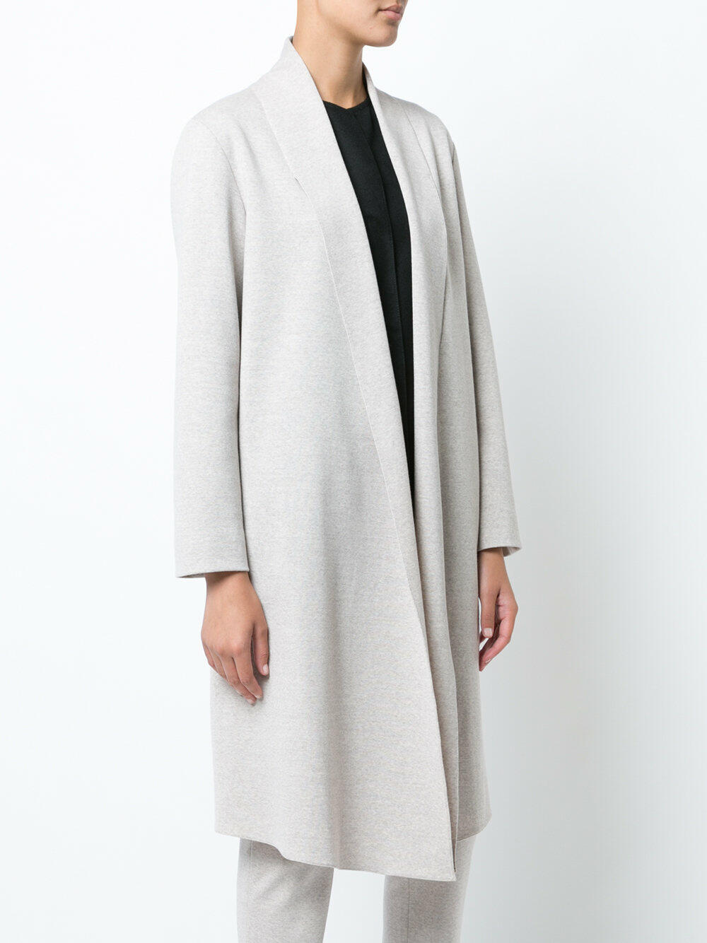 Shawl lapels. Open front. Made in the USA. Shoulder to hem: 41". 100% wool. Dry clean.