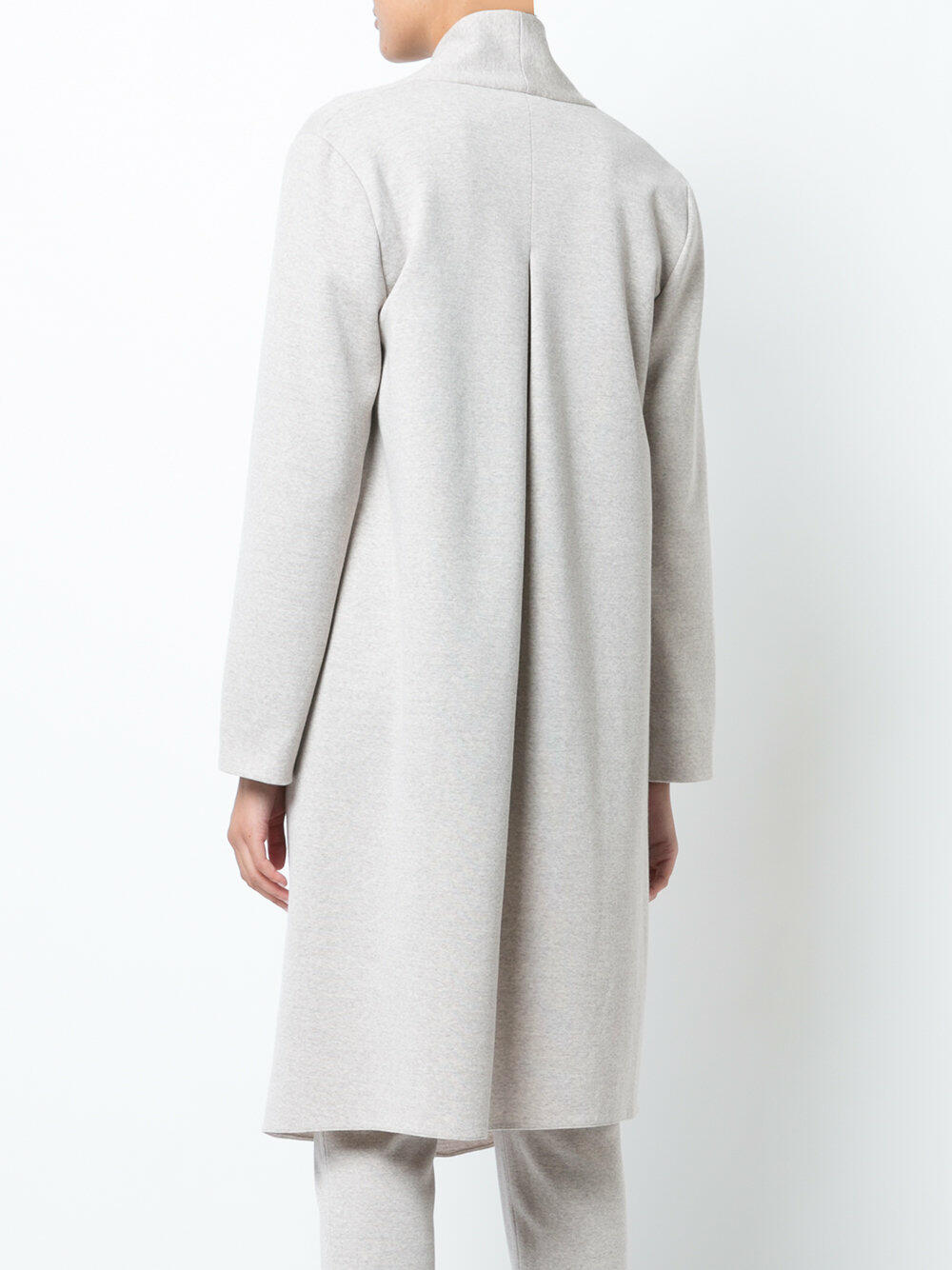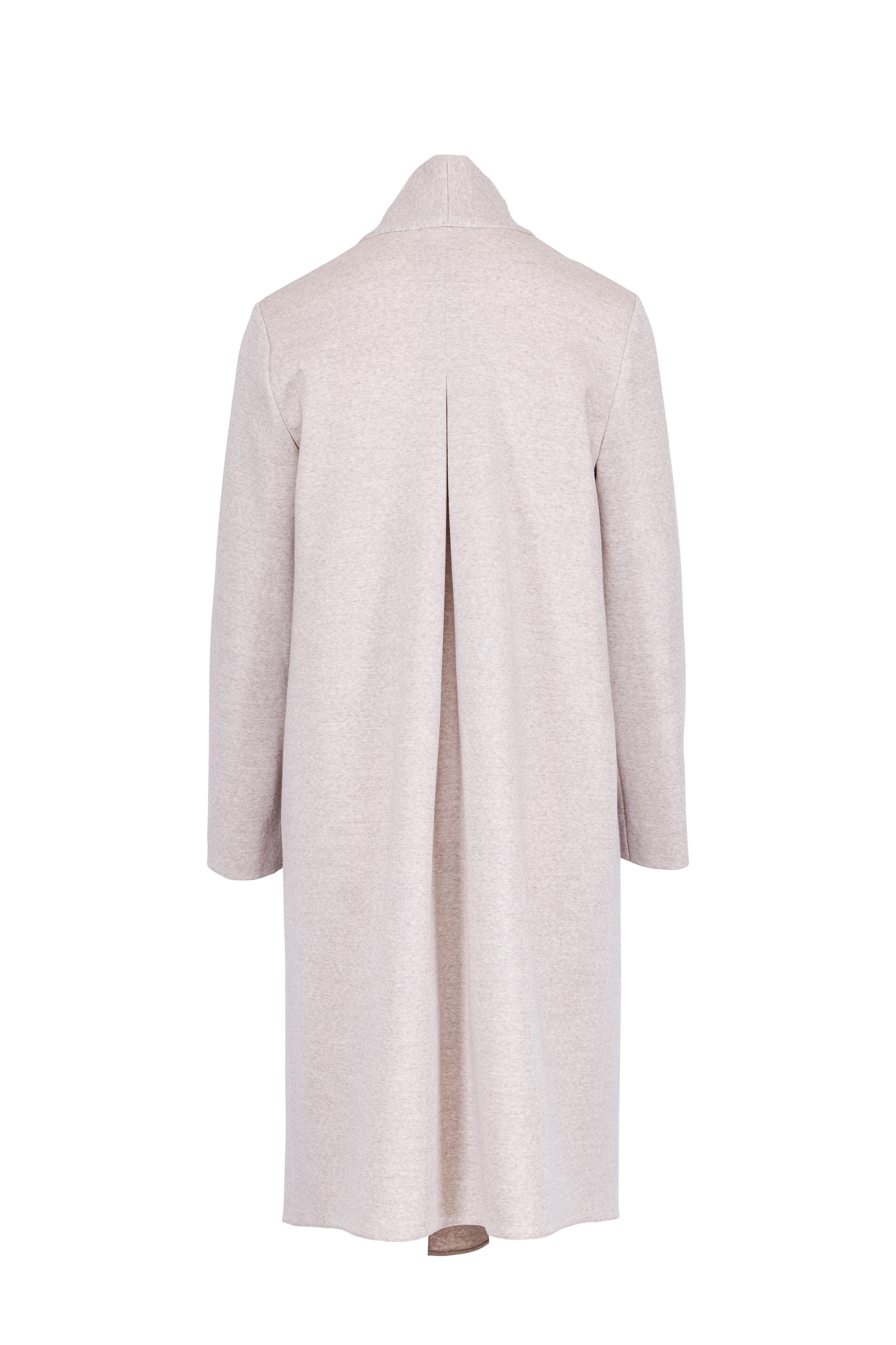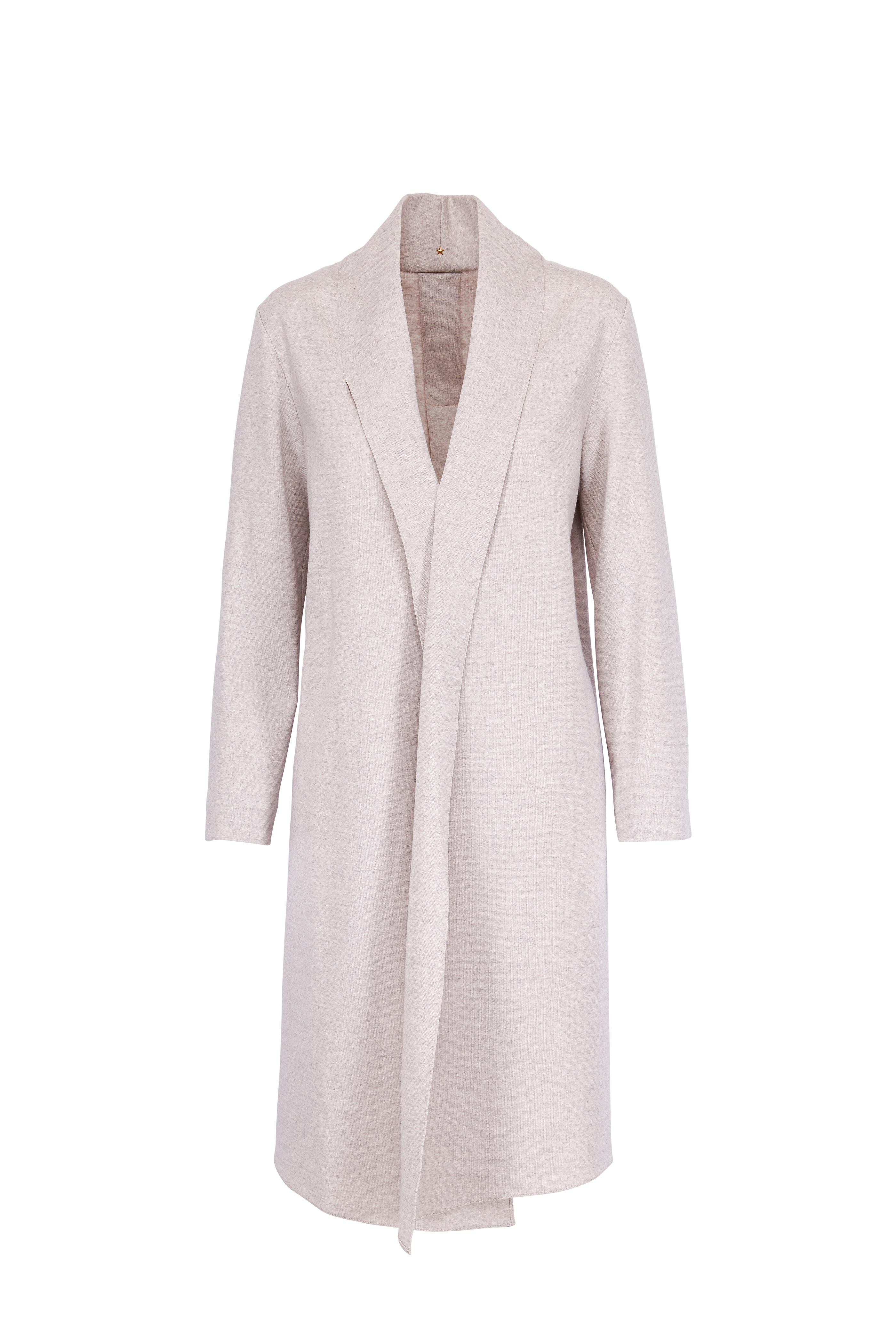 Shawl lapels. Open front. Made in the USA. Shoulder to hem: 41". 100% wool. Dry clean.
