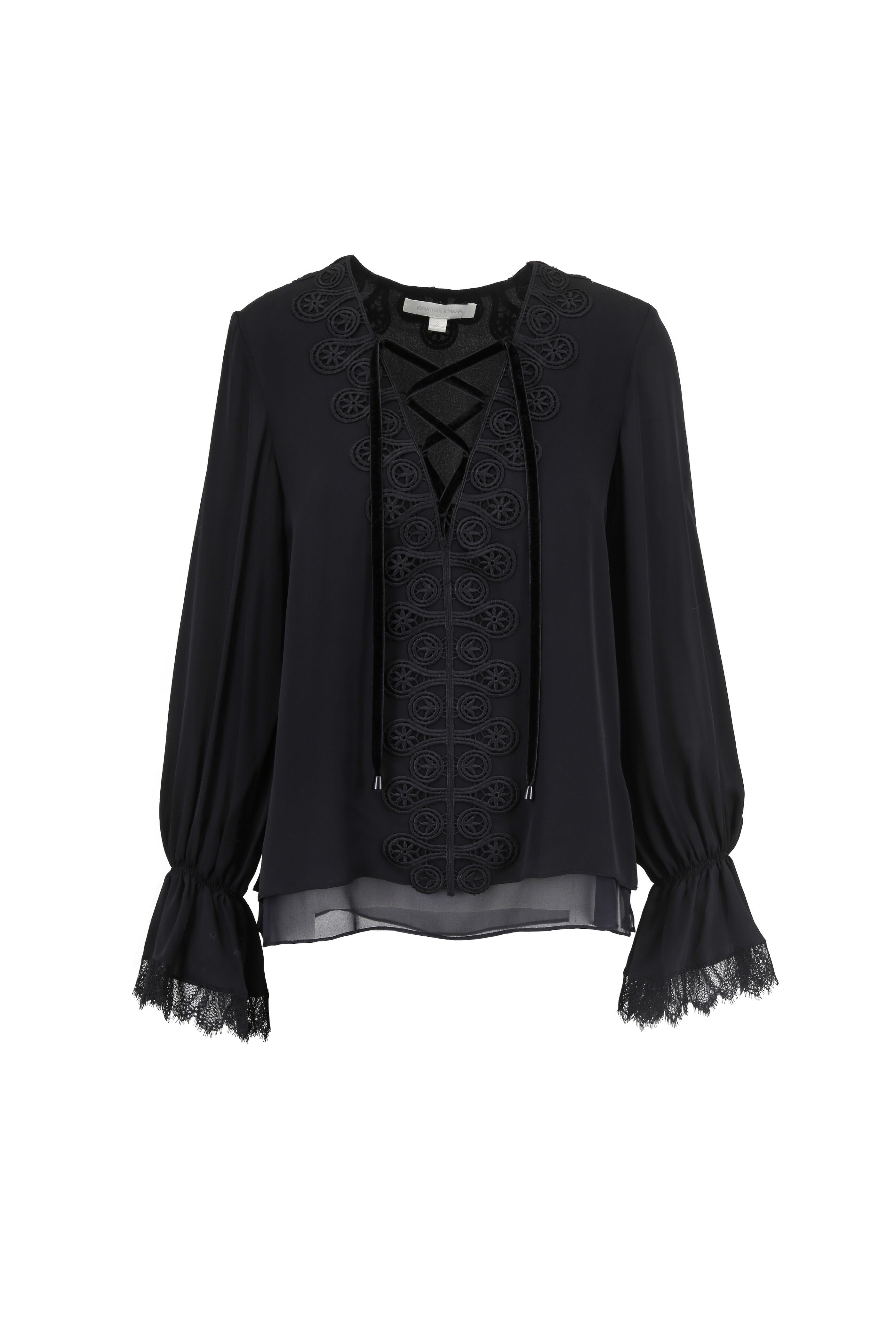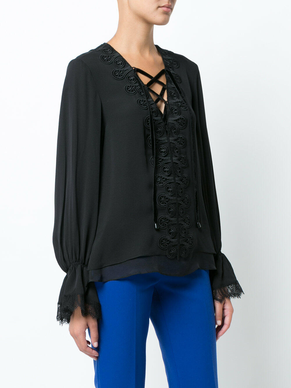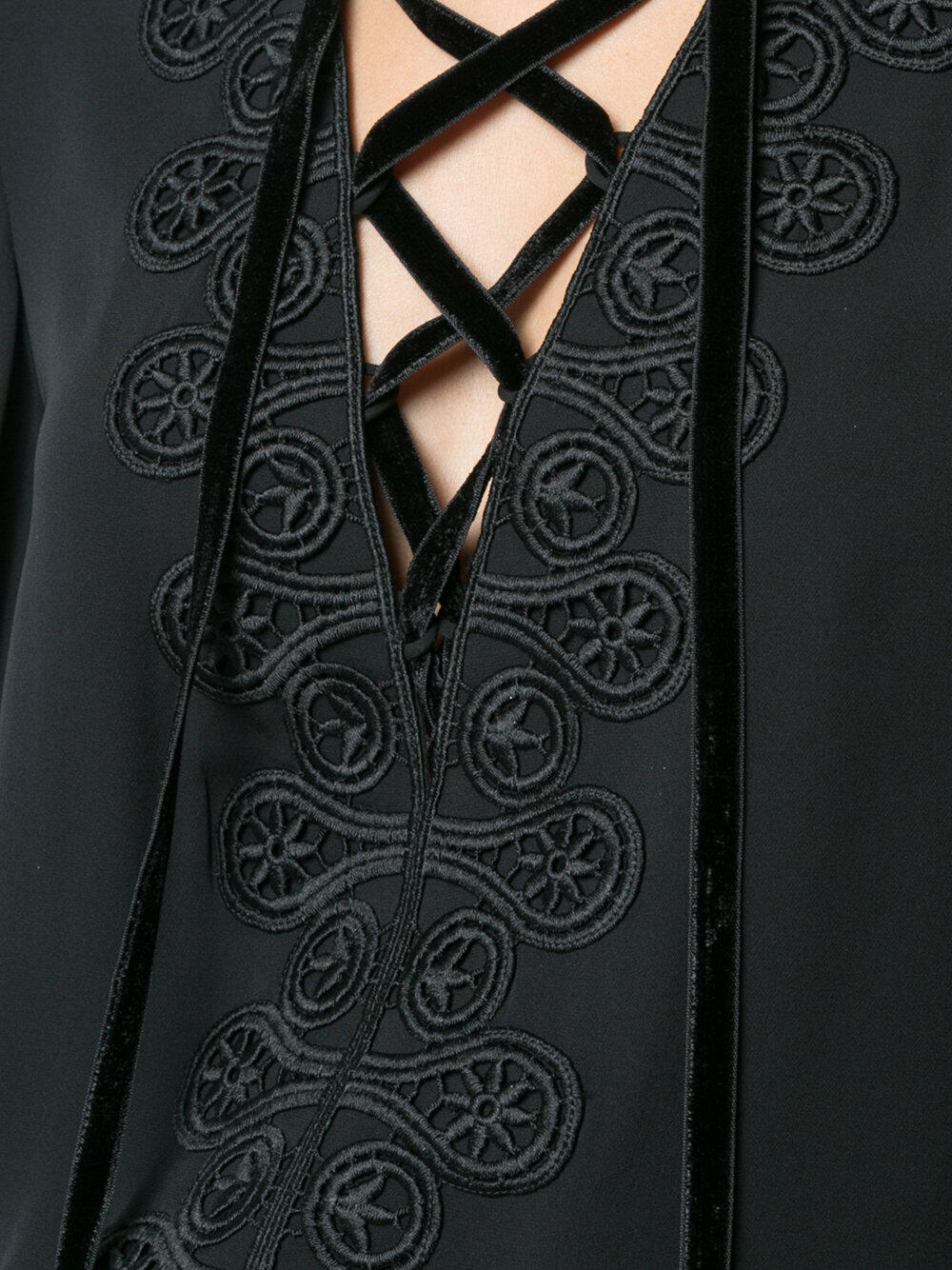 Deep v-neckline; lace-up detail. Soutache embroidery. Full sleeves; gathered bell cuffs with lace edges. Imported. 100% silk; lining: 100% silk; trim: 100% polyester. Dry clean.