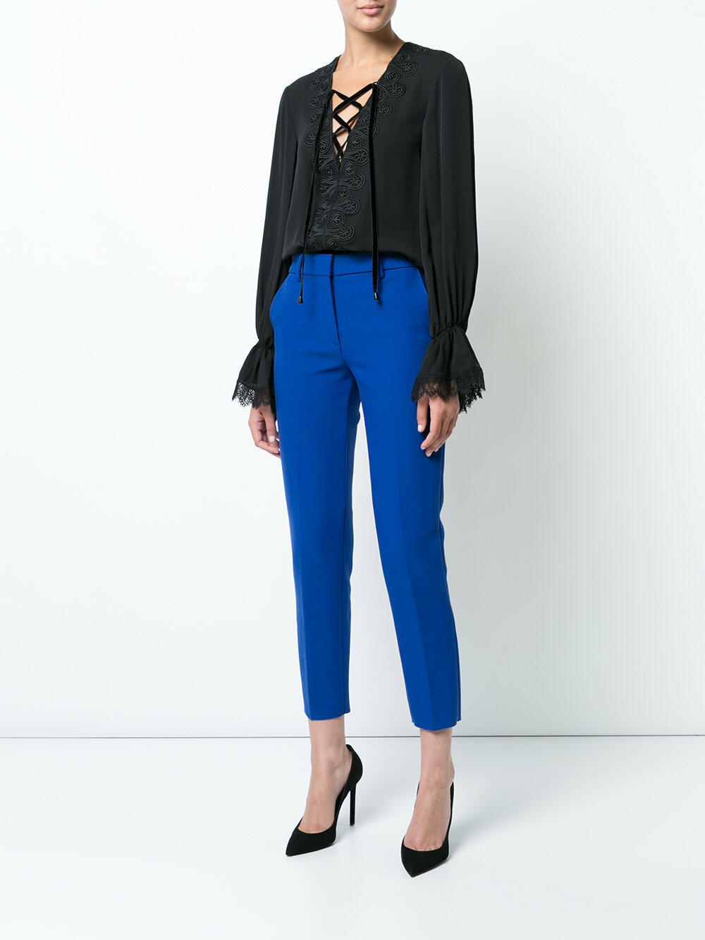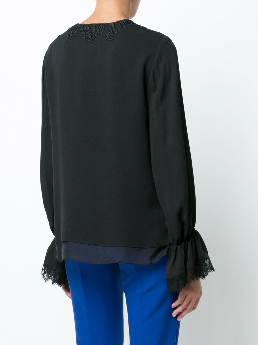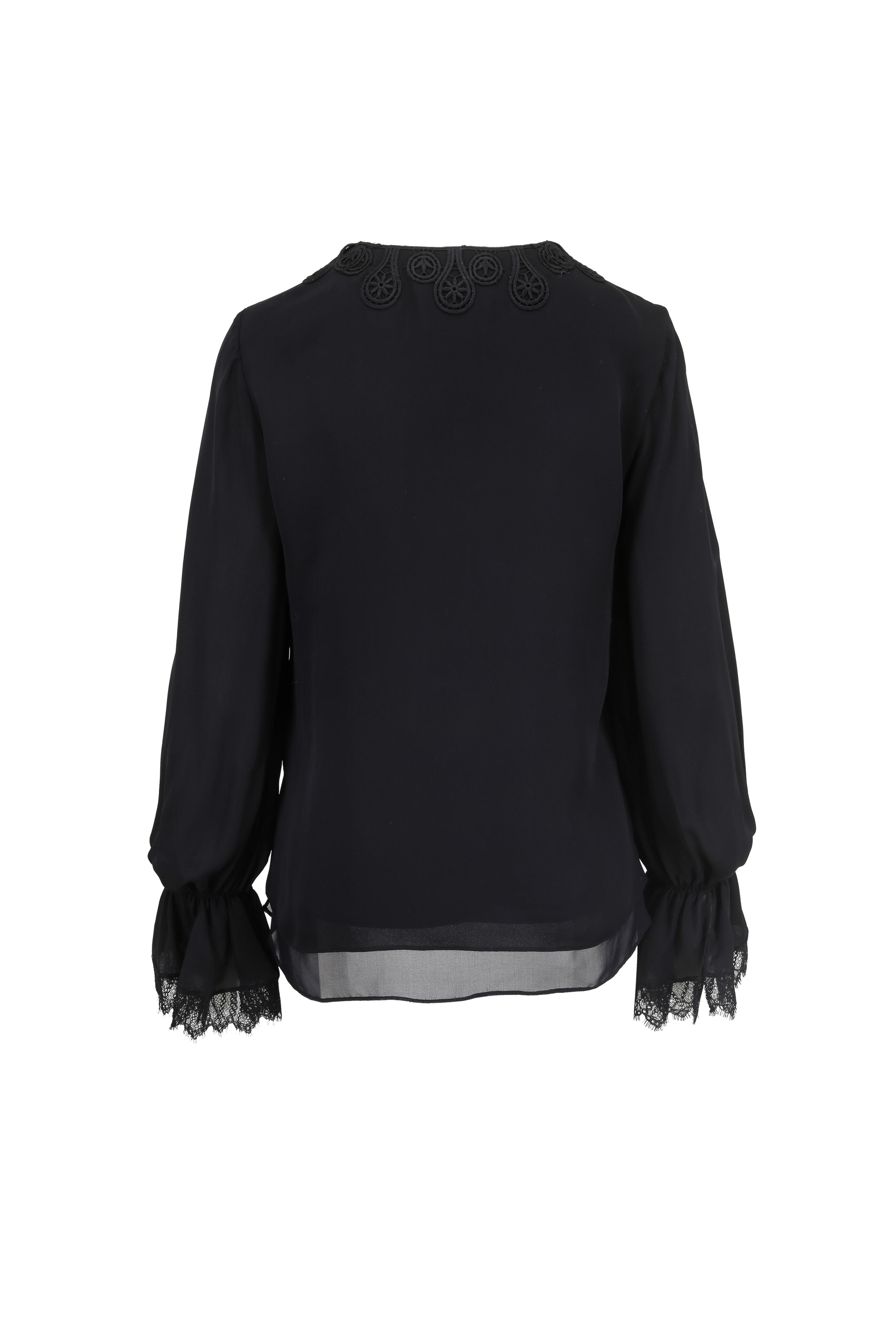 Deep v-neckline; lace-up detail. Soutache embroidery. Full sleeves; gathered bell cuffs with lace edges. Imported. 100% silk; lining: 100% silk; trim: 100% polyester. Dry clean.