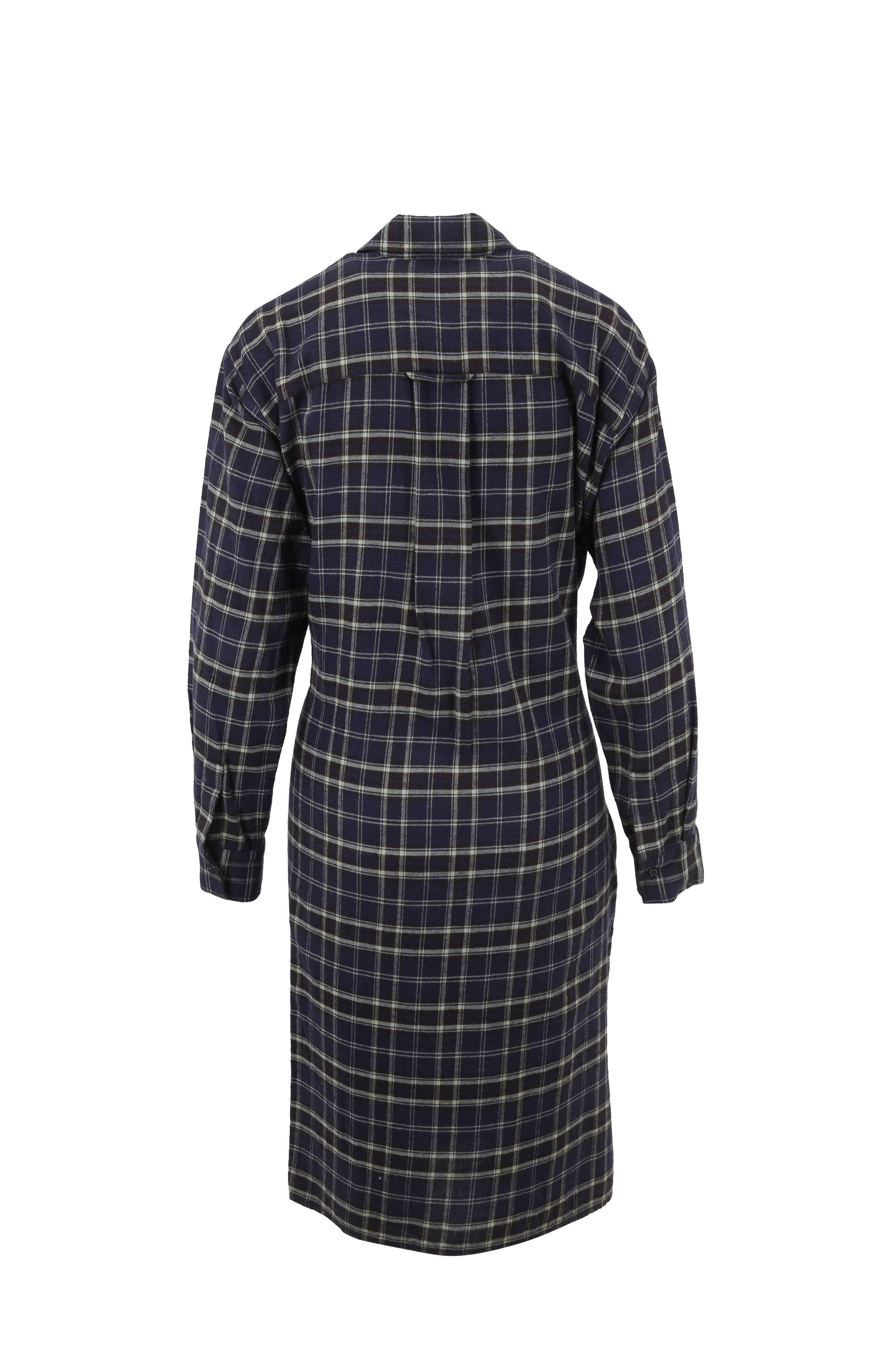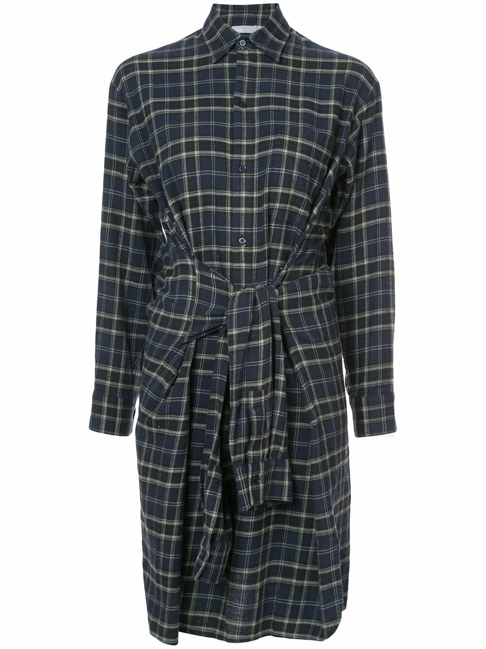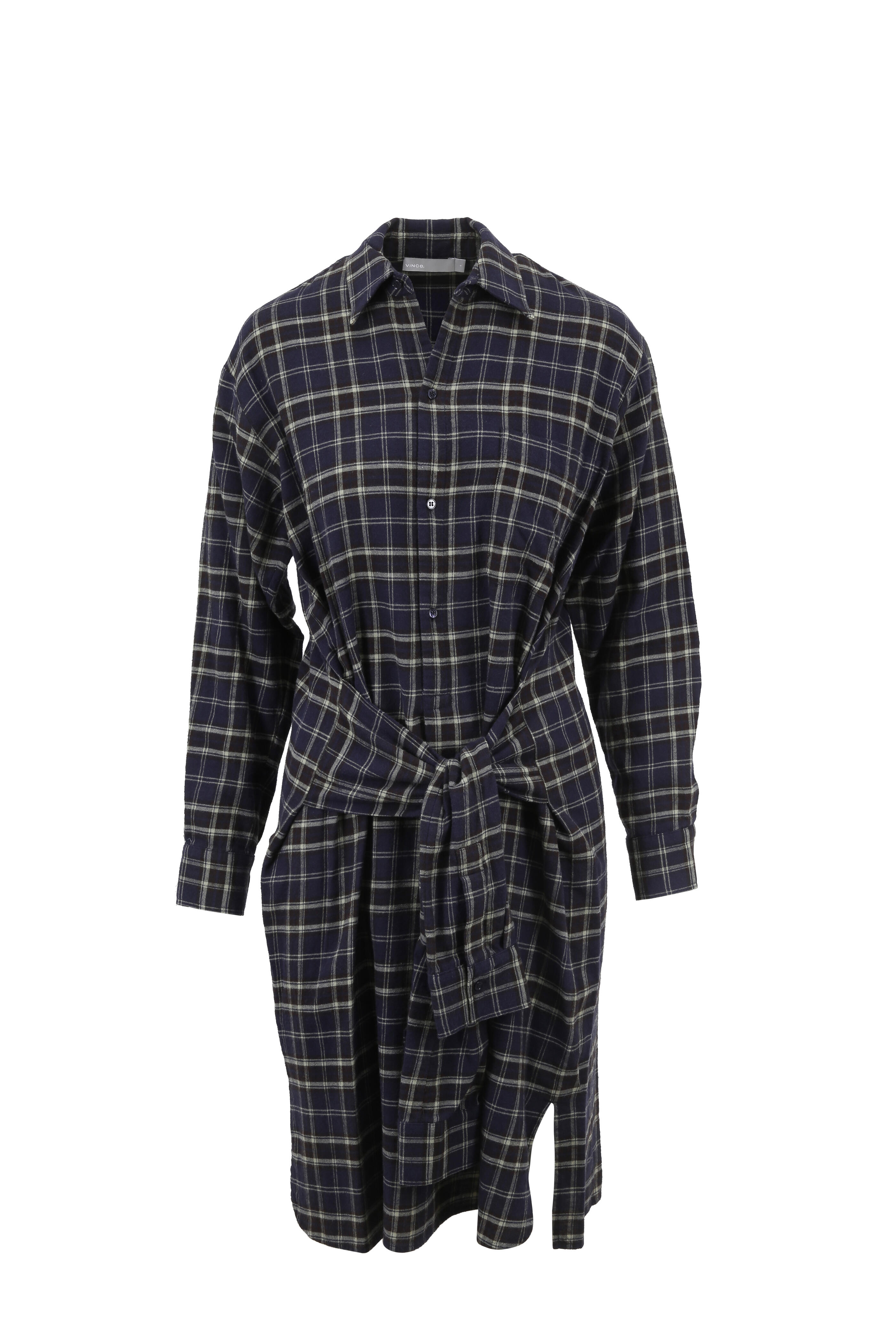 Spread collar. Quarter-button front placket. Single button cuffs. Chest pocket. Vented hem. Attached sleeves self-tie at waist. Imported. 40" shoulder to hem. 70% cotton, 30% wool. Machine wash.