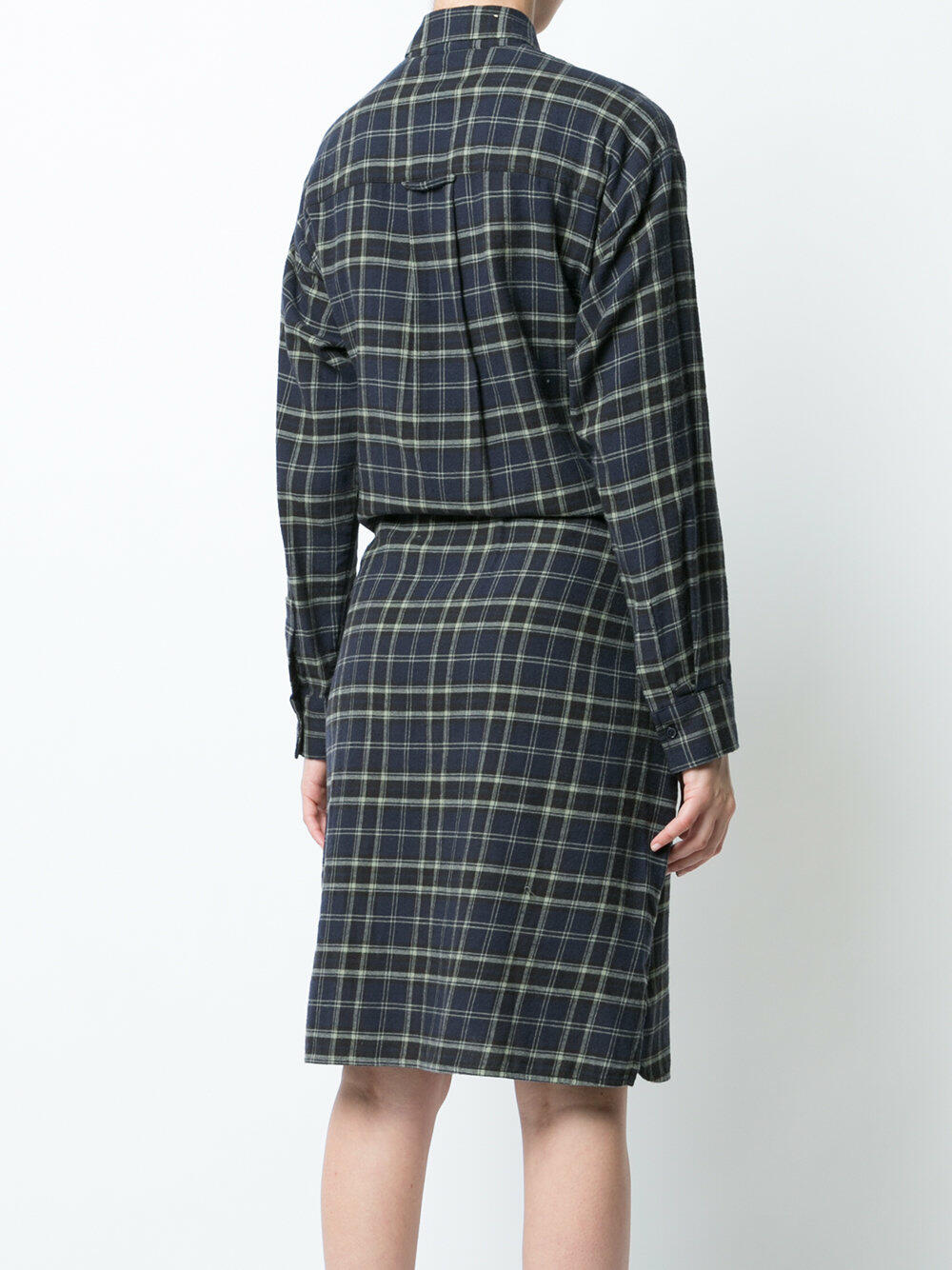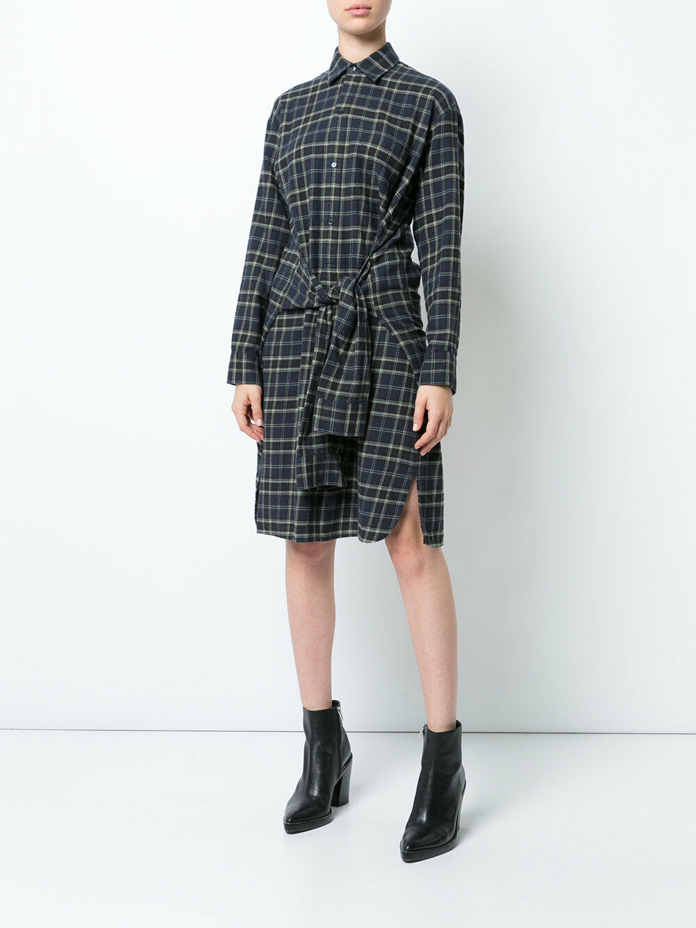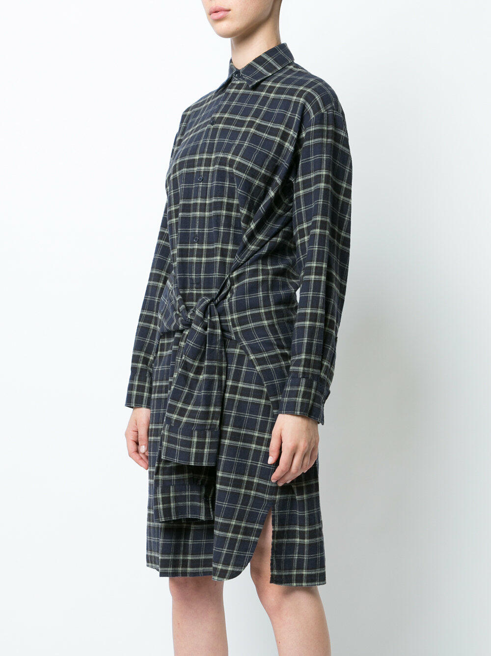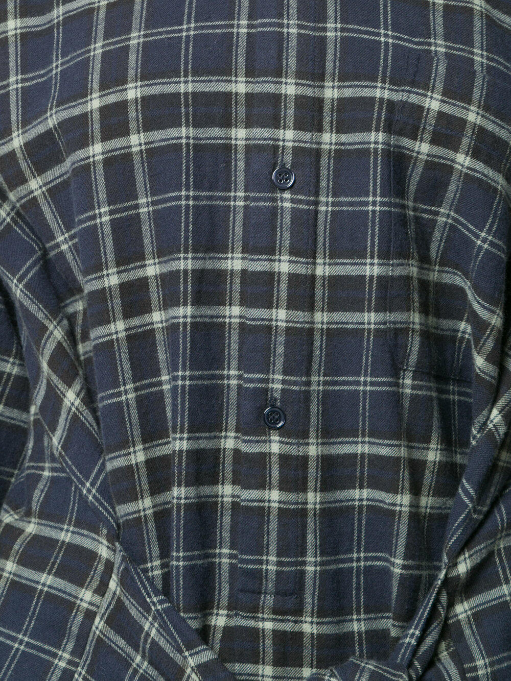 Spread collar. Quarter-button front placket. Single button cuffs. Chest pocket. Vented hem. Attached sleeves self-tie at waist. Imported. 40" shoulder to hem. 70% cotton, 30% wool. Machine wash.