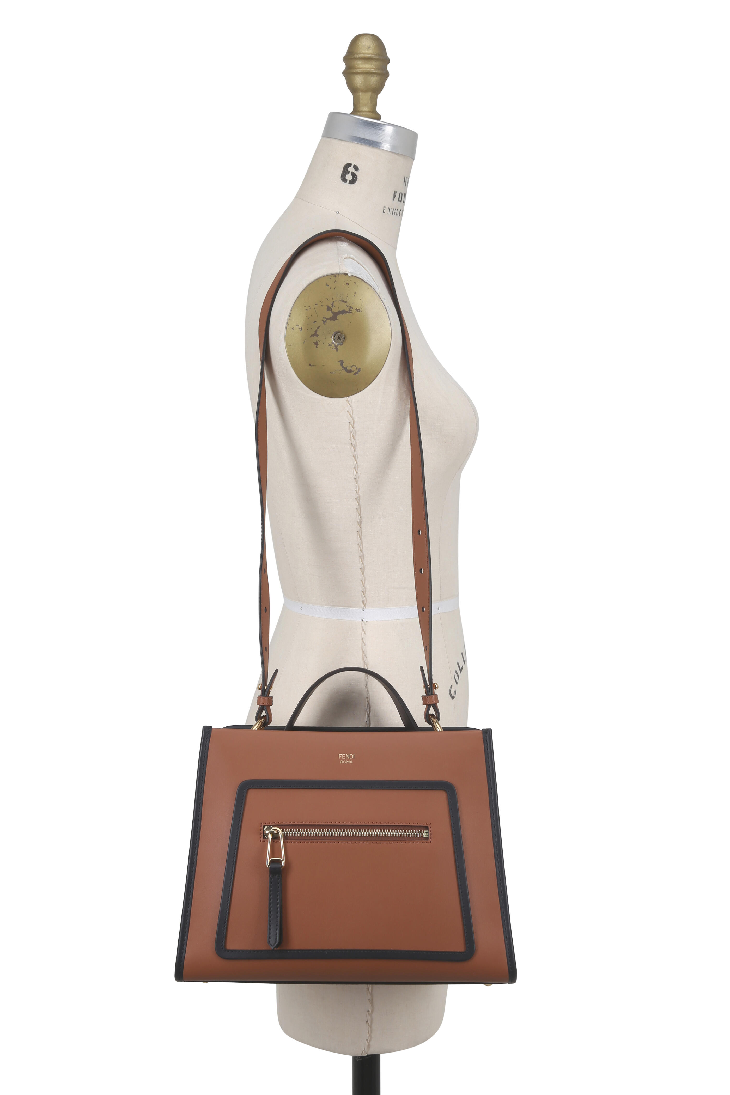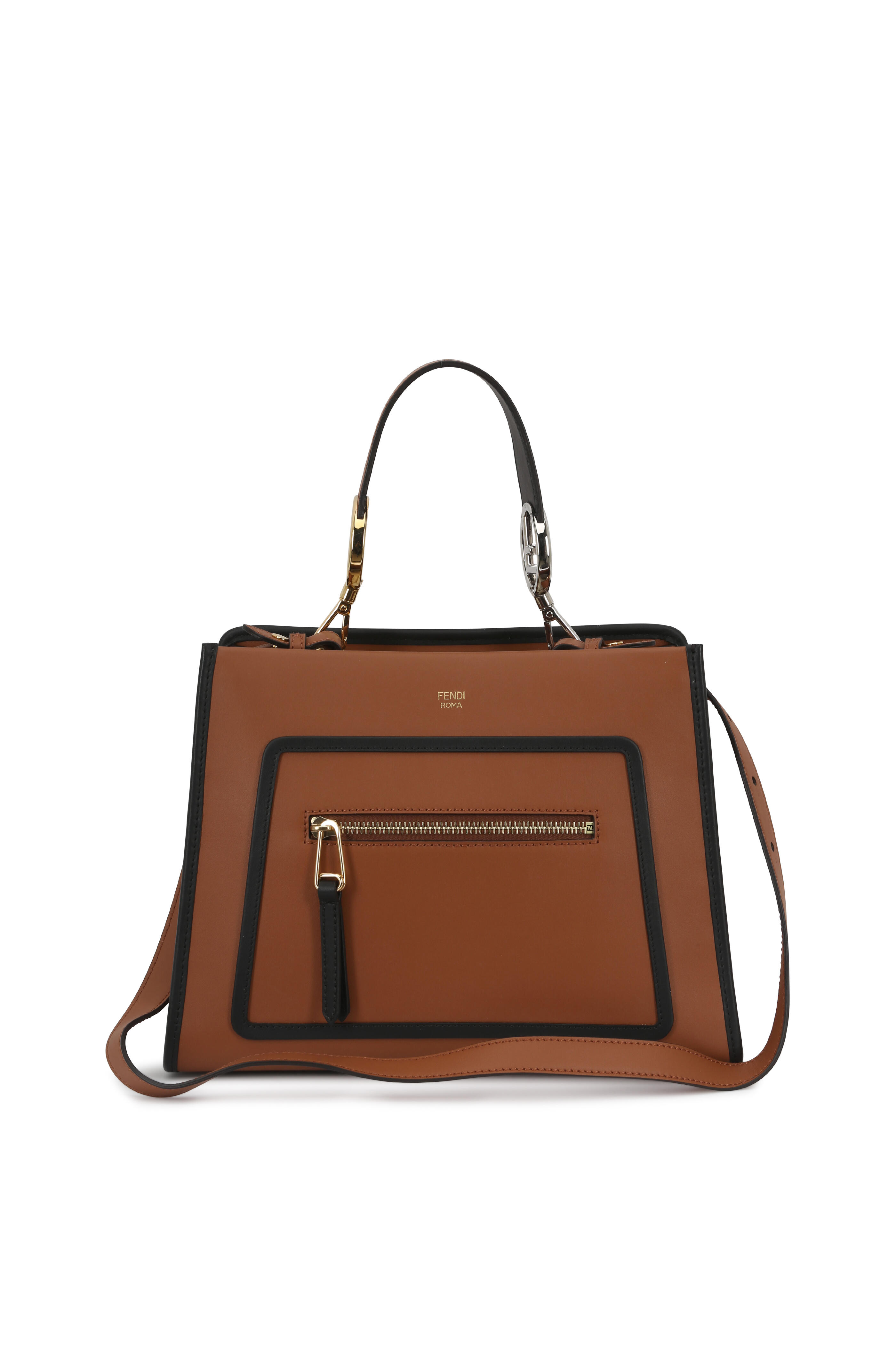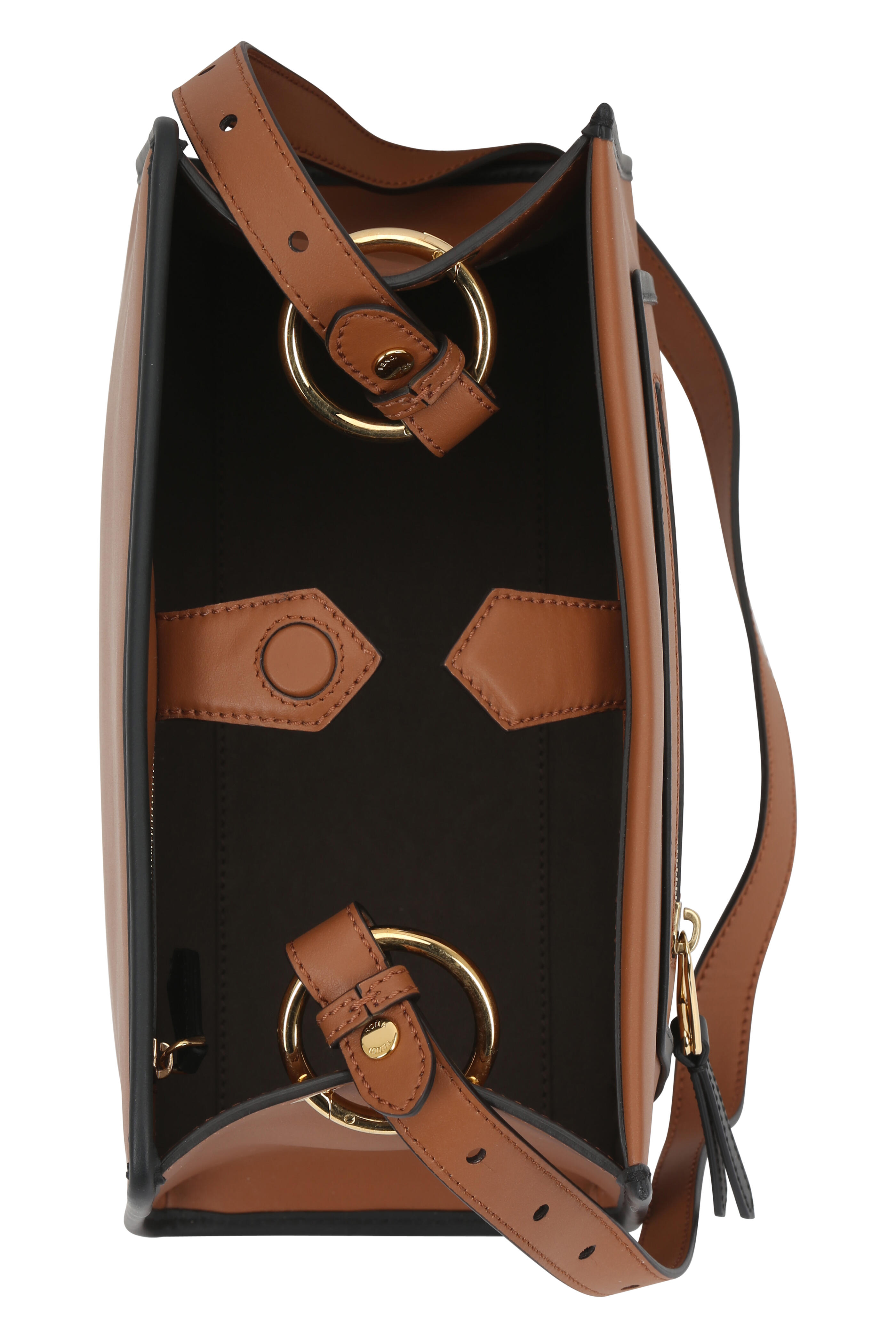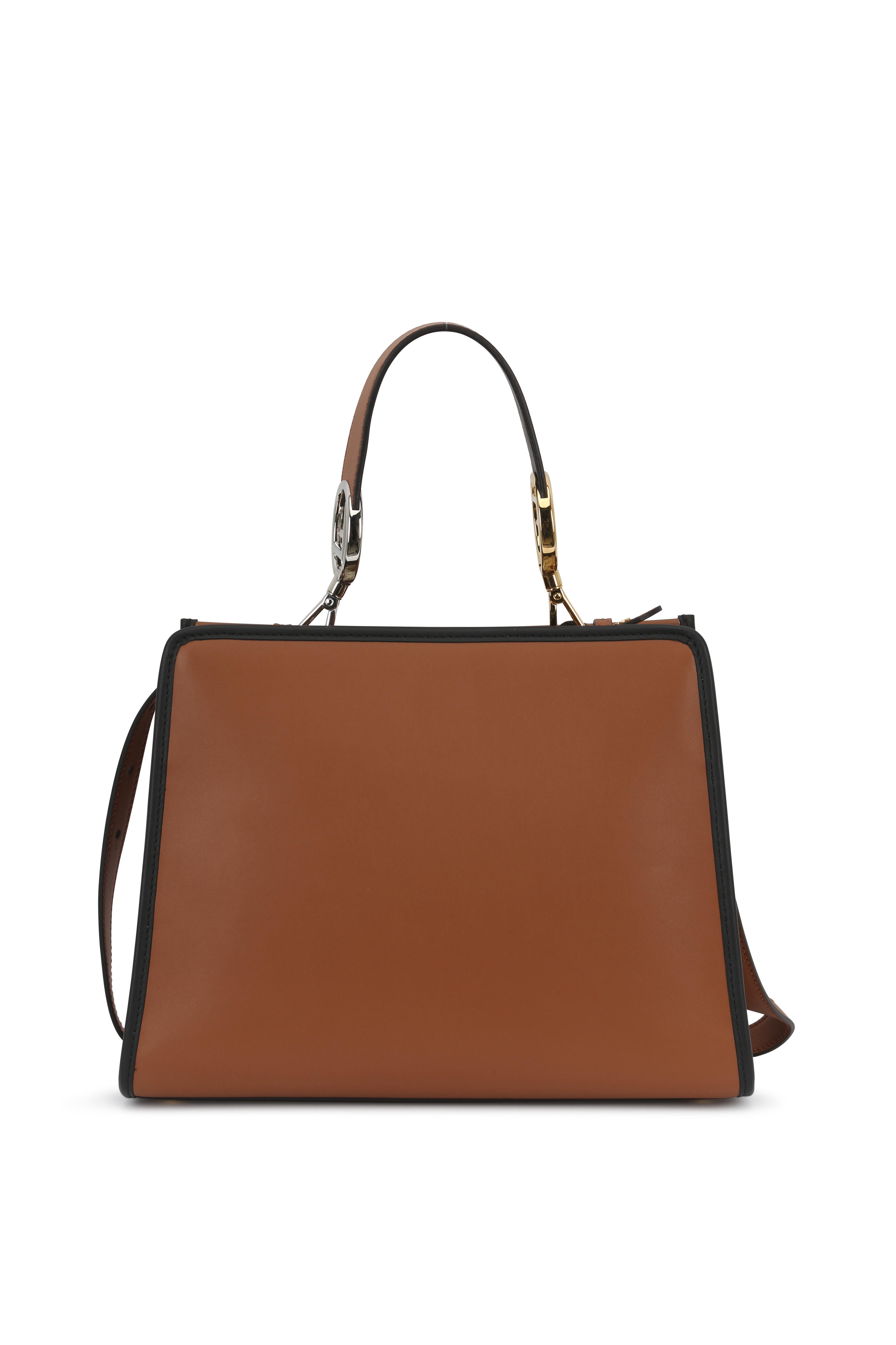 Nappa leather. Detachable top handle; silver and gold tone metal logo. Detachable and adjustable shoulder strap. Center snap tab closure. Exterior front zip pocket. One interior zip and two open pockets. Lined in suede. Protective metal feet. Made in Italy. Width: 11 ½". Height: 9". Depth: 5". Detachable handle drop: 7". Detachable and adjustable strap drop: 18".