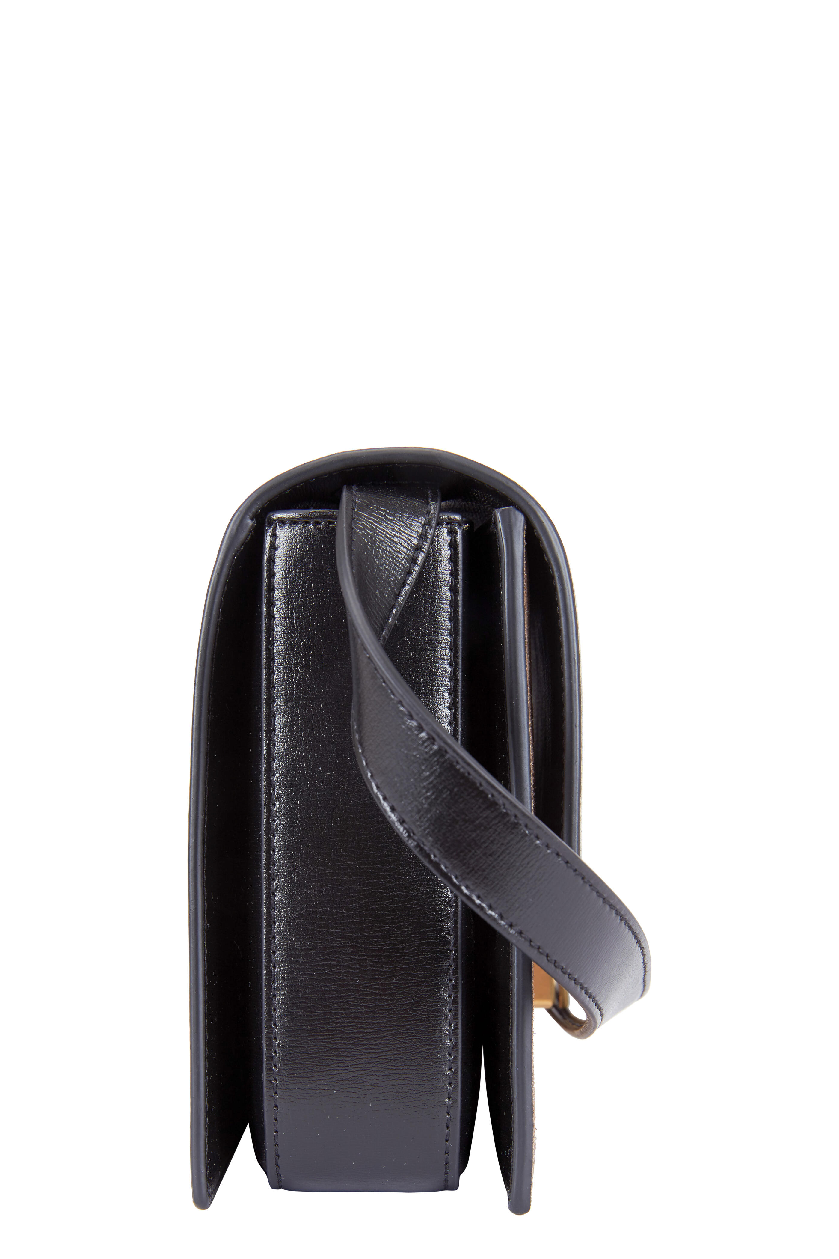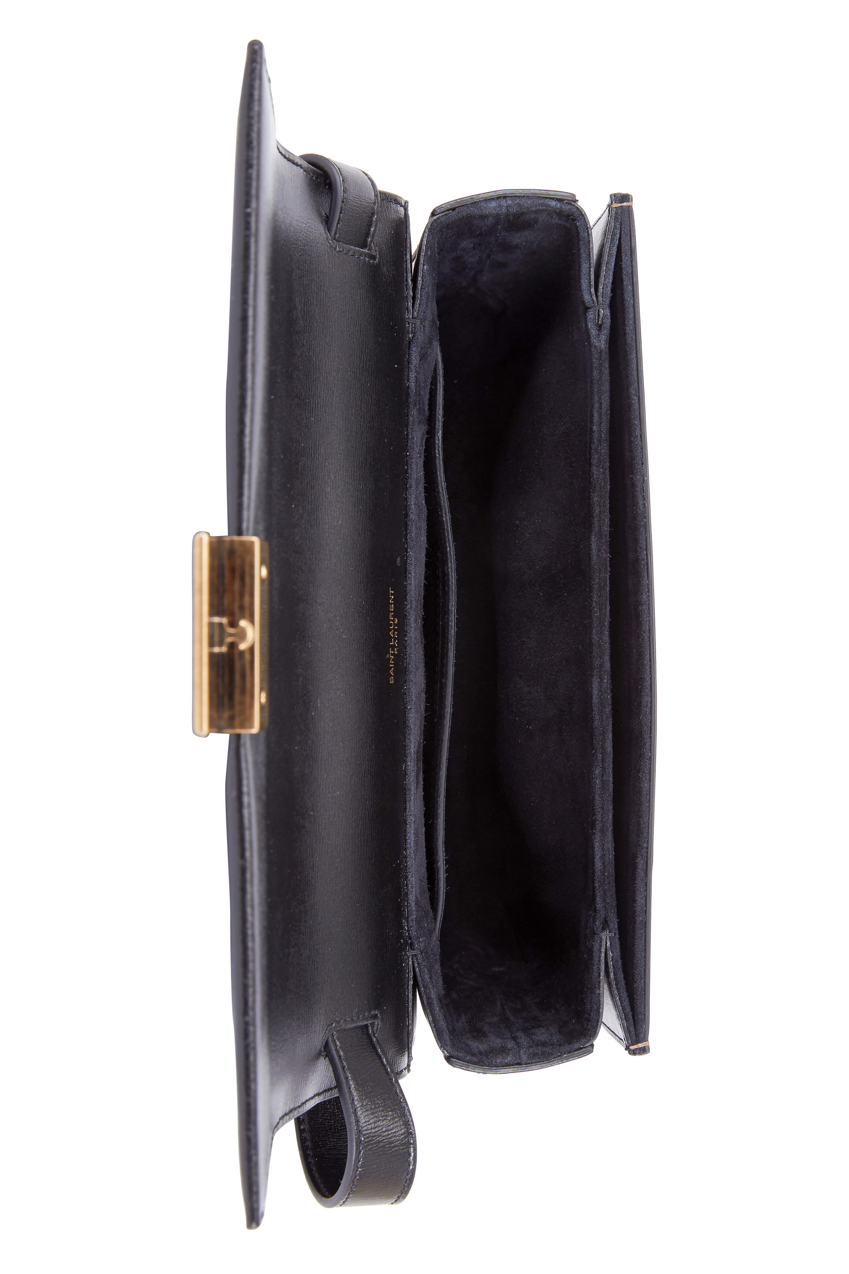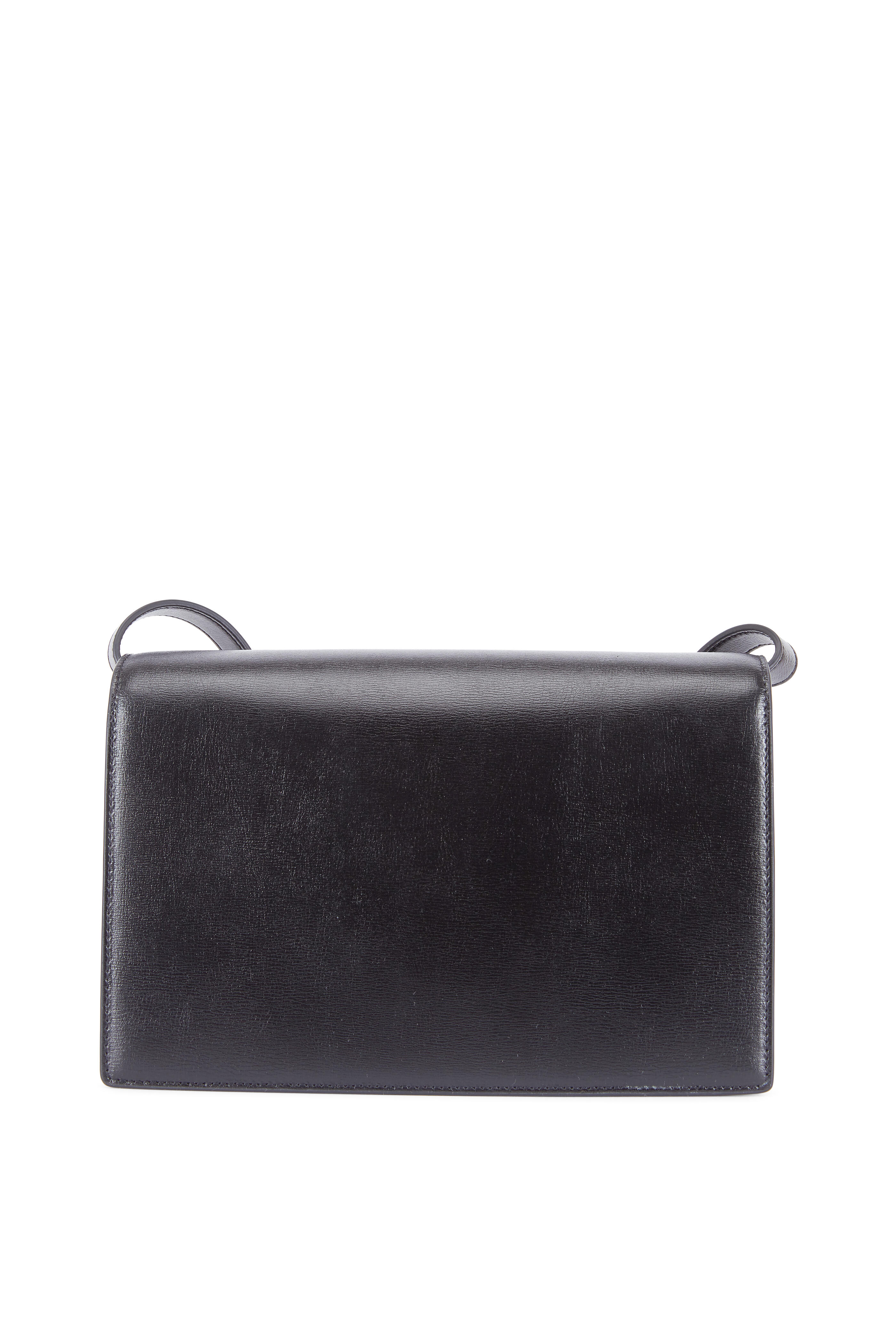 Calfskin leather and suede. Adjustable shoulder strap. Flap front; logo engraved push-lock closure. Two compartmentalized interior; one slip pocket. Lined in suede. Made in Italy. Width: 9 ½". Height: 6". Depth: 3". Adjustable strap drop: 22".